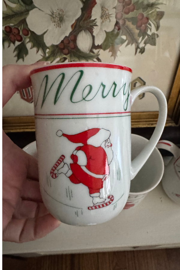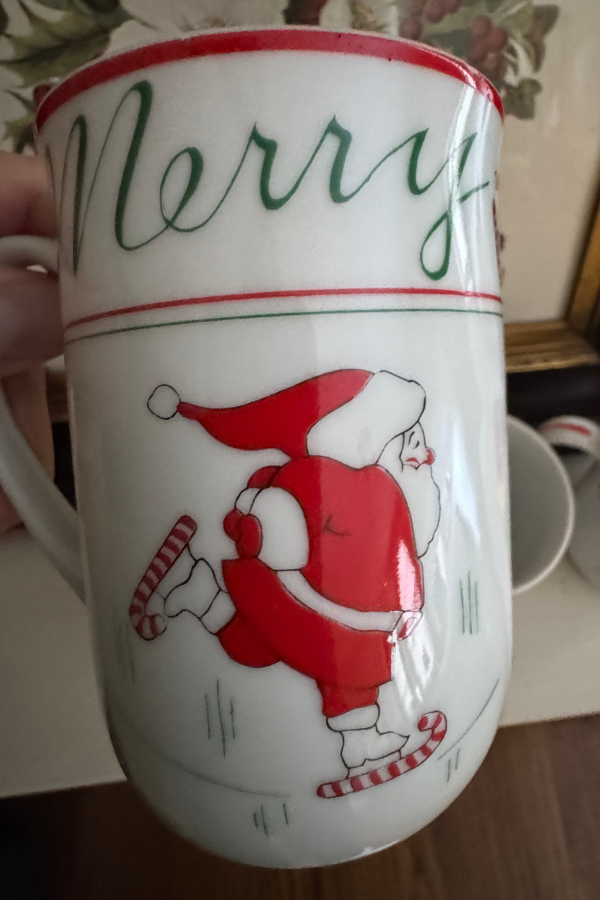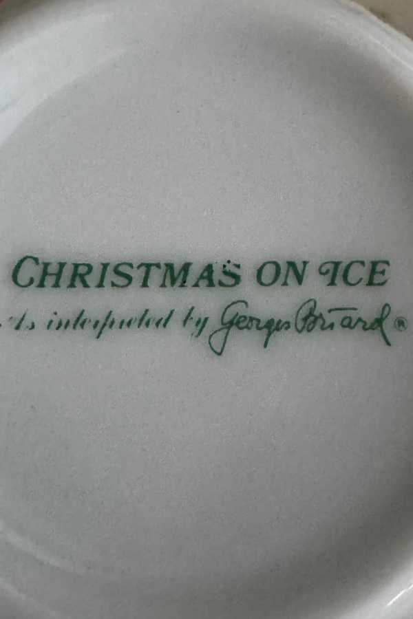 These sweet “Christmas on Ice” mugs were designed by Georges’ Briard and feature Santa on Ice Skates, and the word “Merry” at the top.  Design is on both sides. These come with their original box. Wonderful to display over the holidays, and the perfect thing for your coffee, tea, or hot chocolate by the fire. Shipping is included but only within the contiguous US