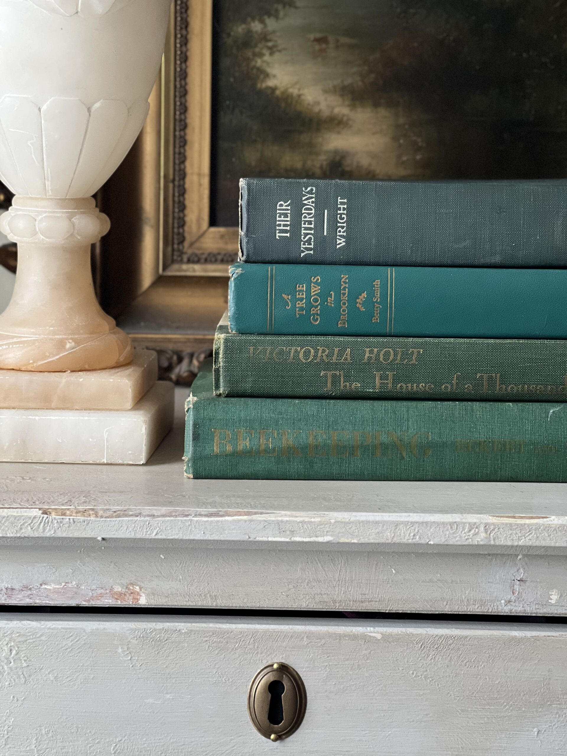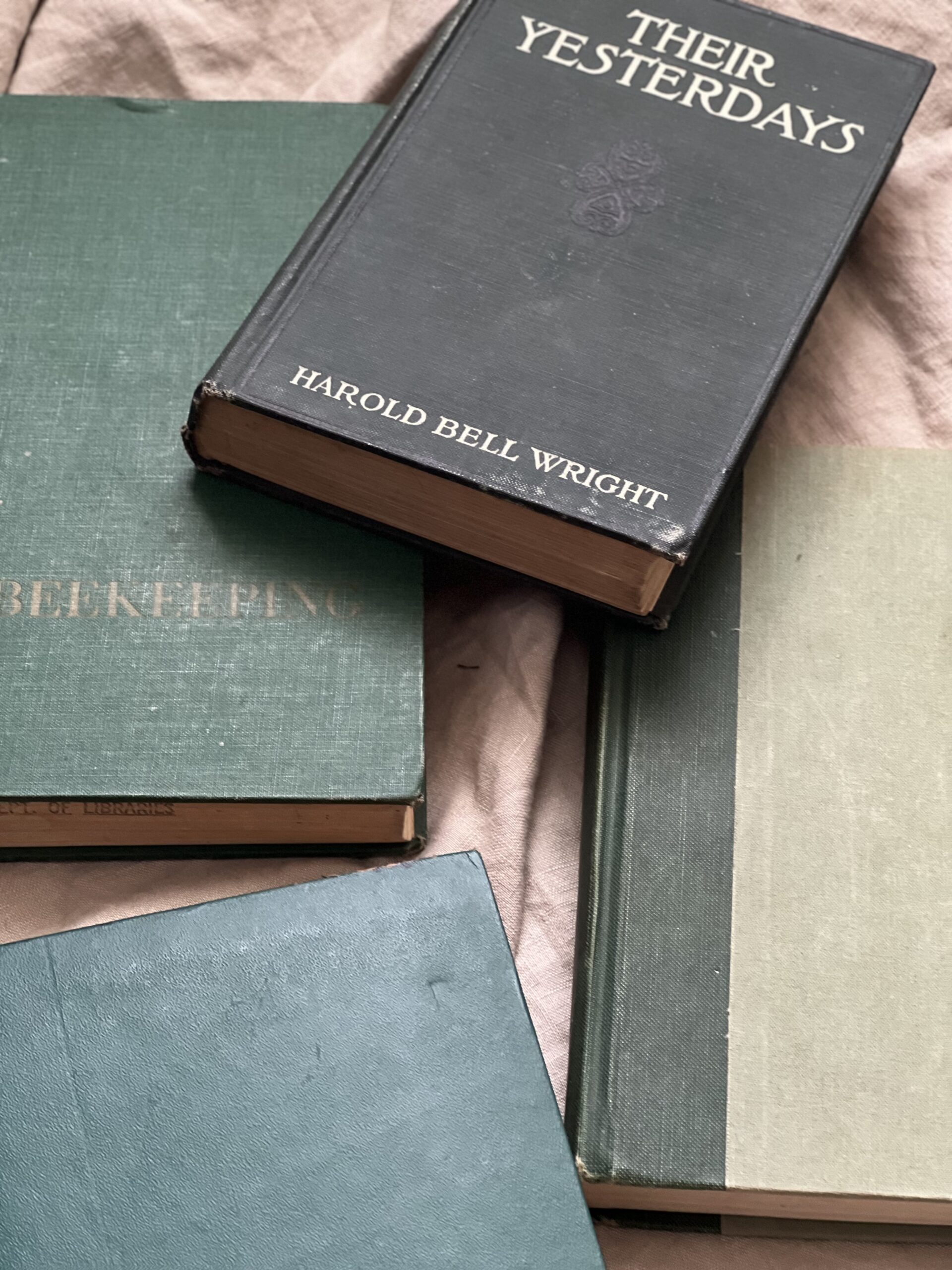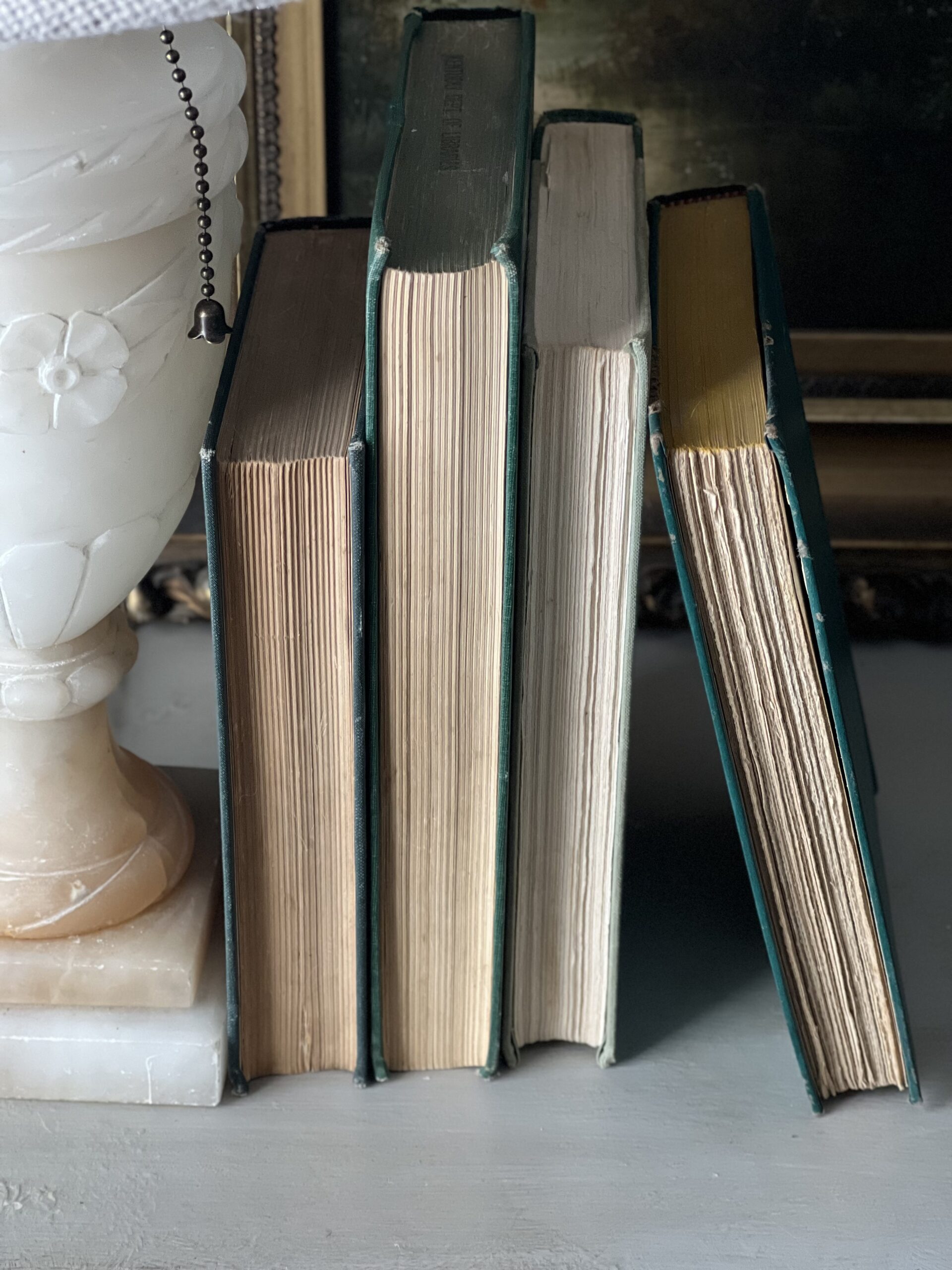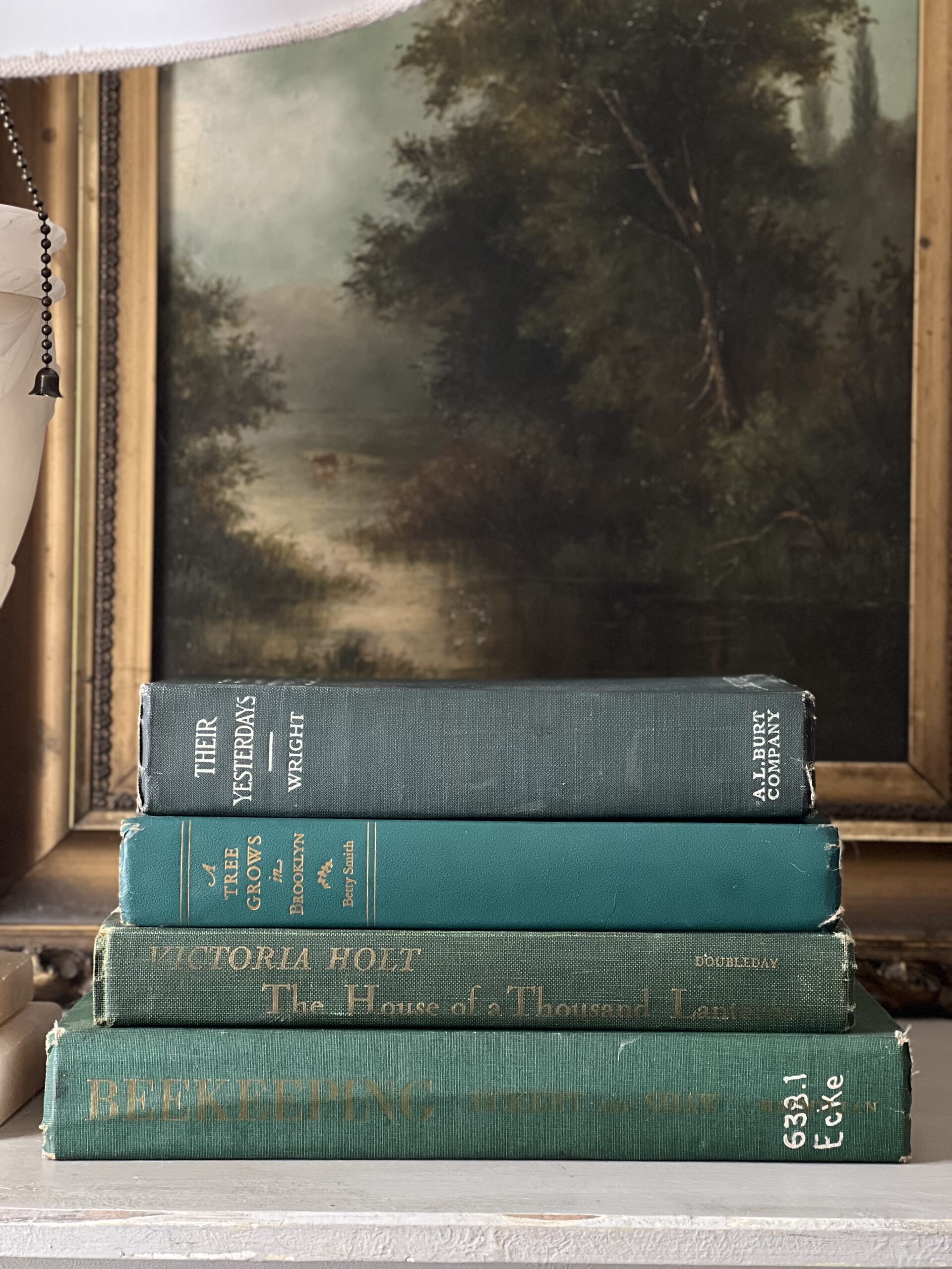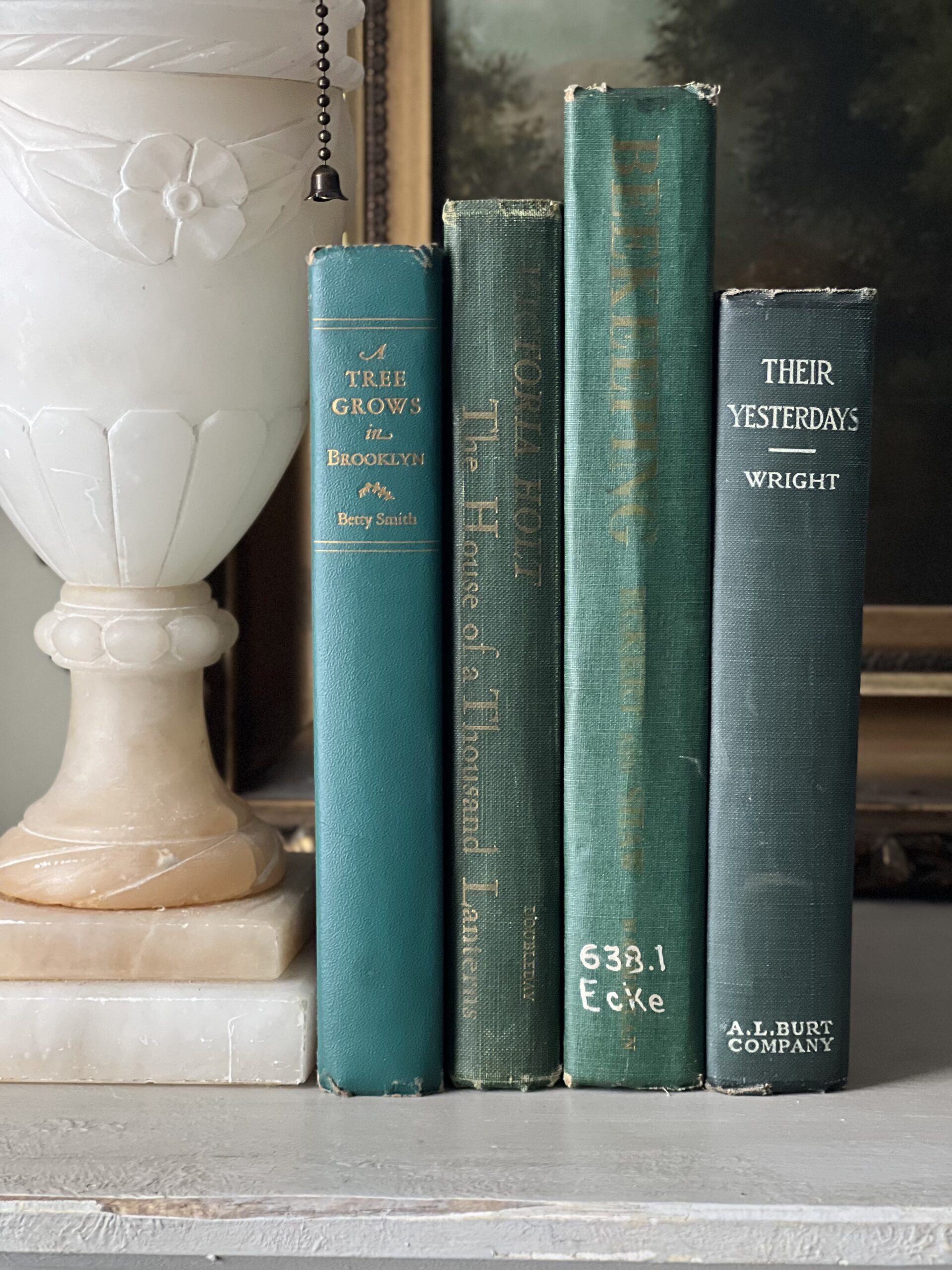Lovely set of four vintage books in varied shades of teal and jewel toned greens. Books are in good to moderate vintage condition with some staining, writing, library stickers, and possibly torn pages.