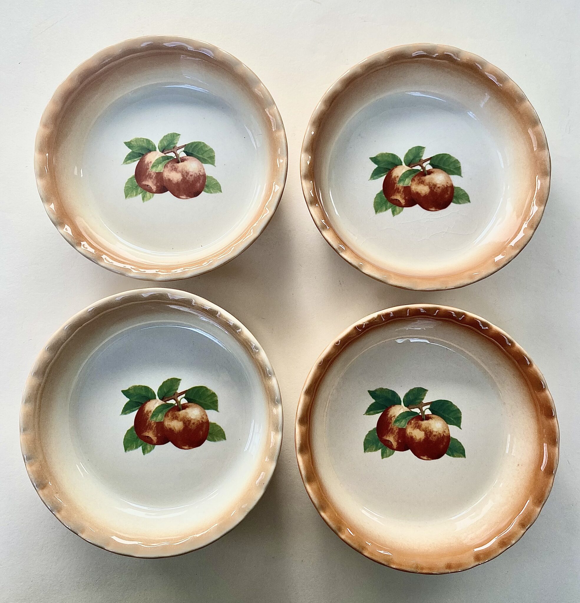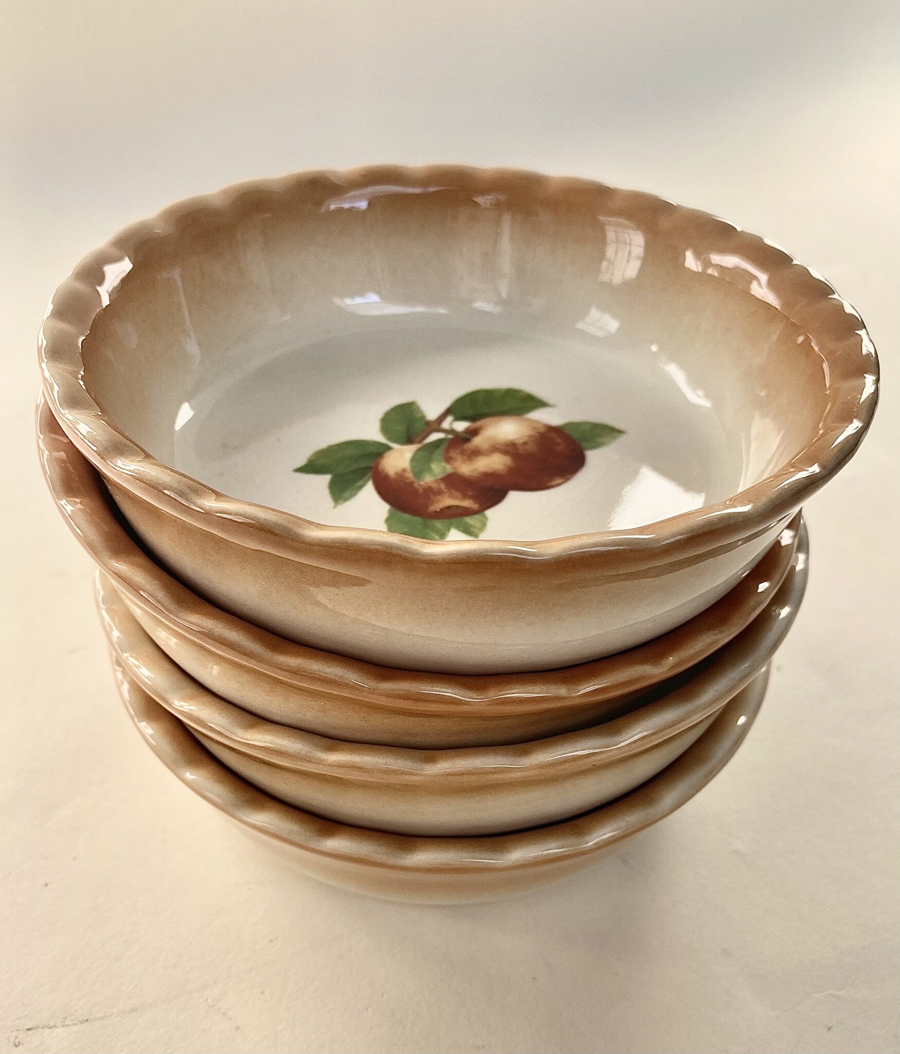Set of 4 mini peach pie/dessert bakers. These are oven safe up to 450 degrees. Made by Nantucket, see photo of back stamp. They measure 5 1/2″ inches in diameter. In great shape and useable!