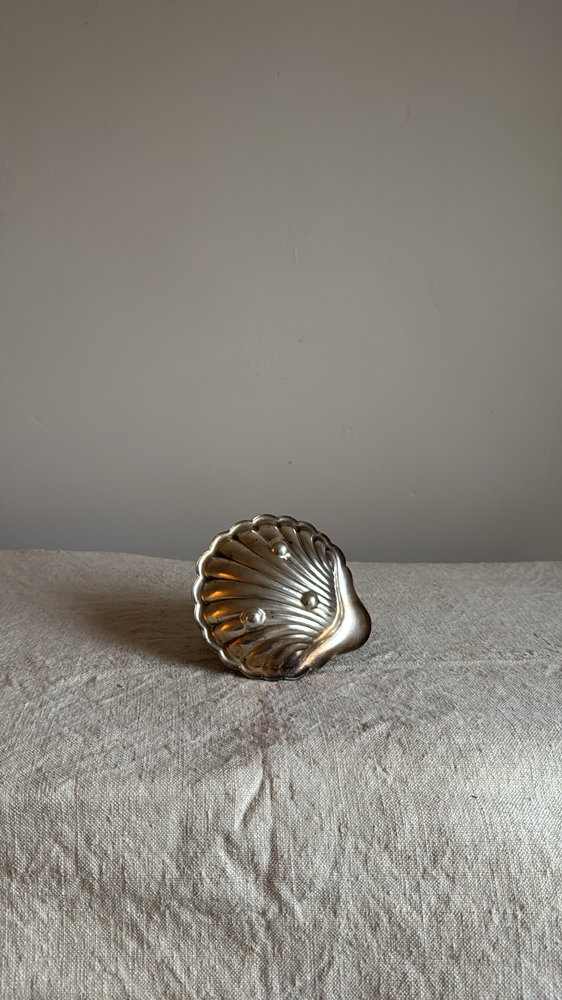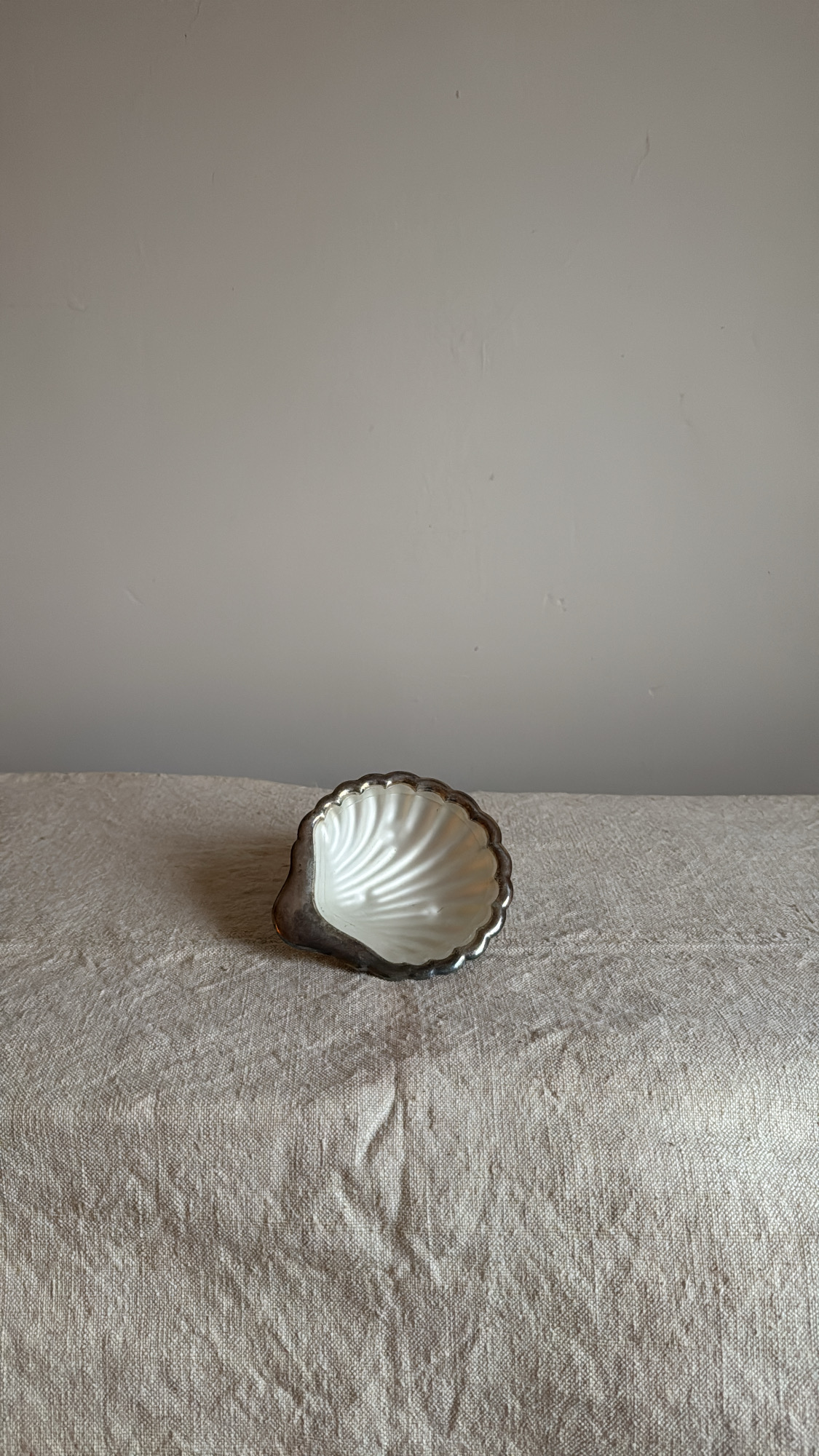A delicate vintage silver-plated shell dish featuring a frosted glass insert that catches the light beautifully. Perfect as a jewelry catchall, salt cellar, or decorative accent. Its elegant coastal form and subtle shimmer bring a timeless touch of refinement to any vanity or tabletop.