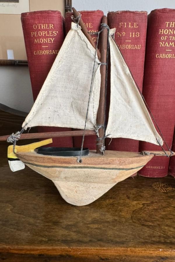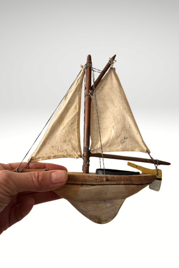 This miniature handmade sailboat is the sweetest. Perfect size to lay on a coffee table tray, or even hang on the wall. It appears to have initials stamped on the sail. The boat measures approximately 7.5 x 8 inches. Shipping is included but only within the contiguous US