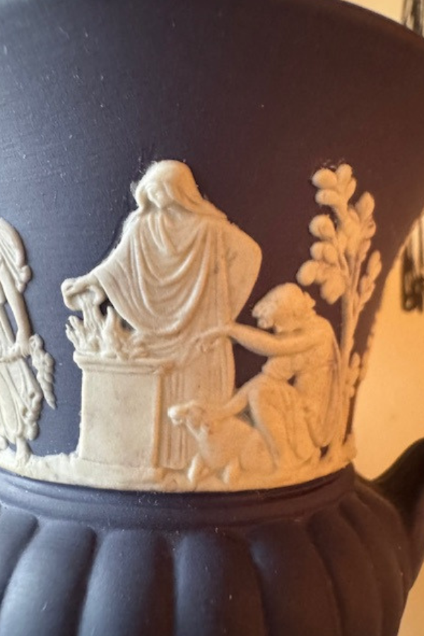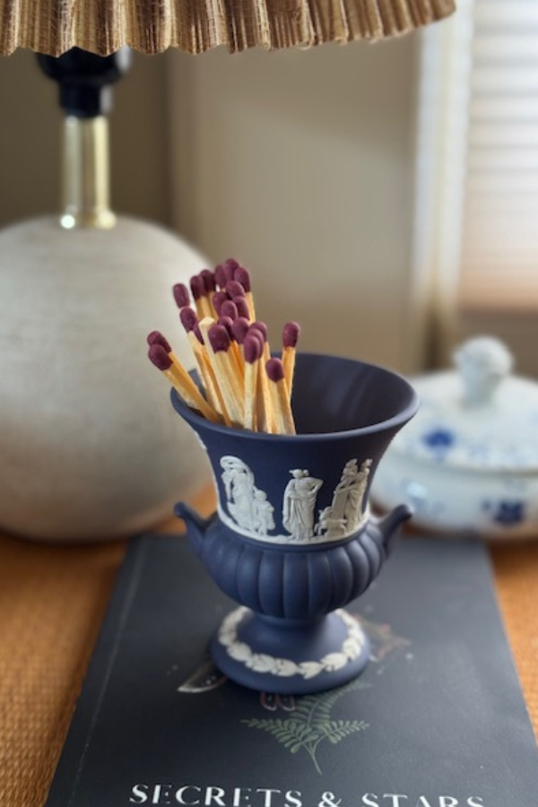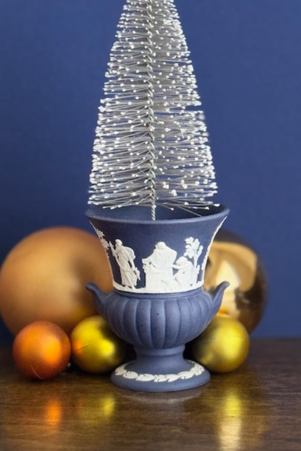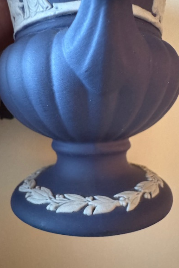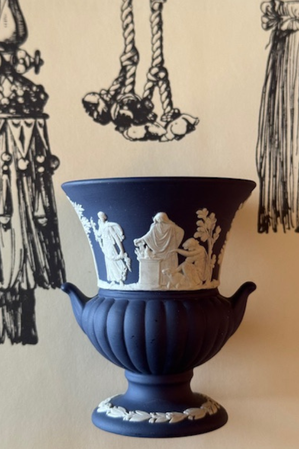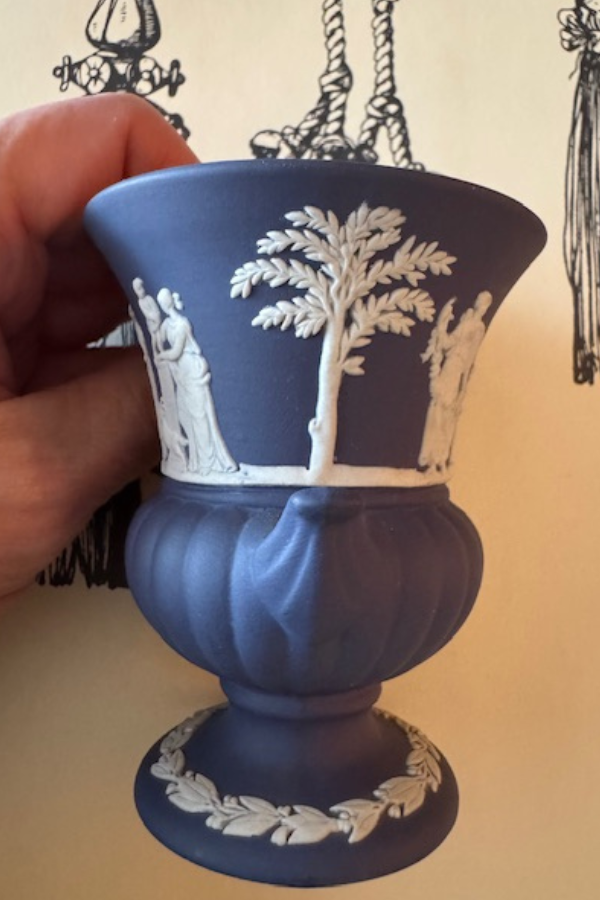 How would you style this beautiful little urn? I had fun using it for a match holder and also as part of a Christmas vignette. The urn-shaped English Wedgwood vase is in a beautiful dark blue. The color just makes the white relief pop. Perfect little vase, match or toothpick holder. Would also be a great addition to a coffee or side table or the perfect little stocking stuffer. It measures a little more than 3.25 inches tall and about 2.75 inches wide. Marked on the bottom. Shipping is included but only within the contiguous US