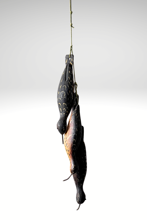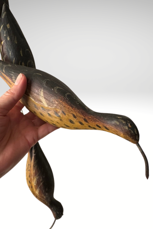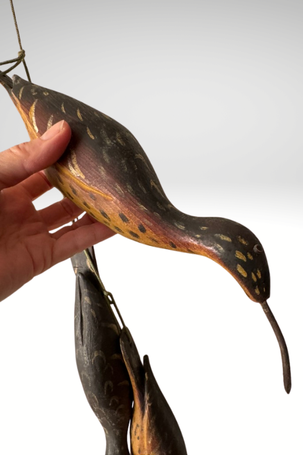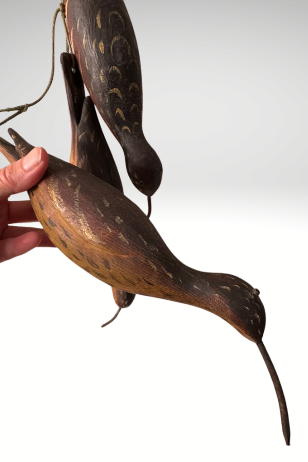 Interesting string of 3 shorebirds. They all look old and hand carved. There are holes in bottom of each one, so I think they were mounted or meant to be mounted at one time. Each bird is about 12 inches long and the string hangs about 30 inches, as is. Really fun to hang on the wall or a window frame. They could each be remounted if you wanted, but they do have holes drilled in the tails so they could be strung. I personally think they are fun and unusual displayed on the old string rope. Shipping is included, but only within the contiguous US