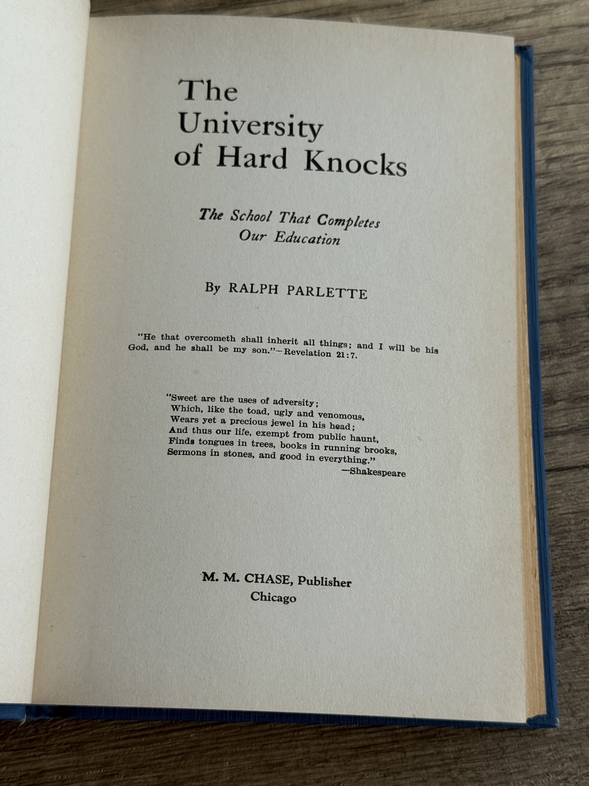 The University of Hard Knocks by Ralph Parlette Published by M.M. Chase Chicago. In good condition. 1917. It is a motivational/self-improvement book.