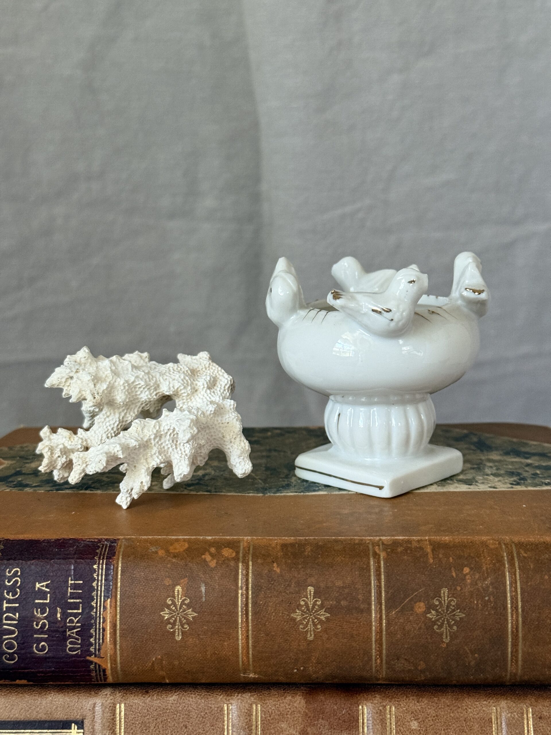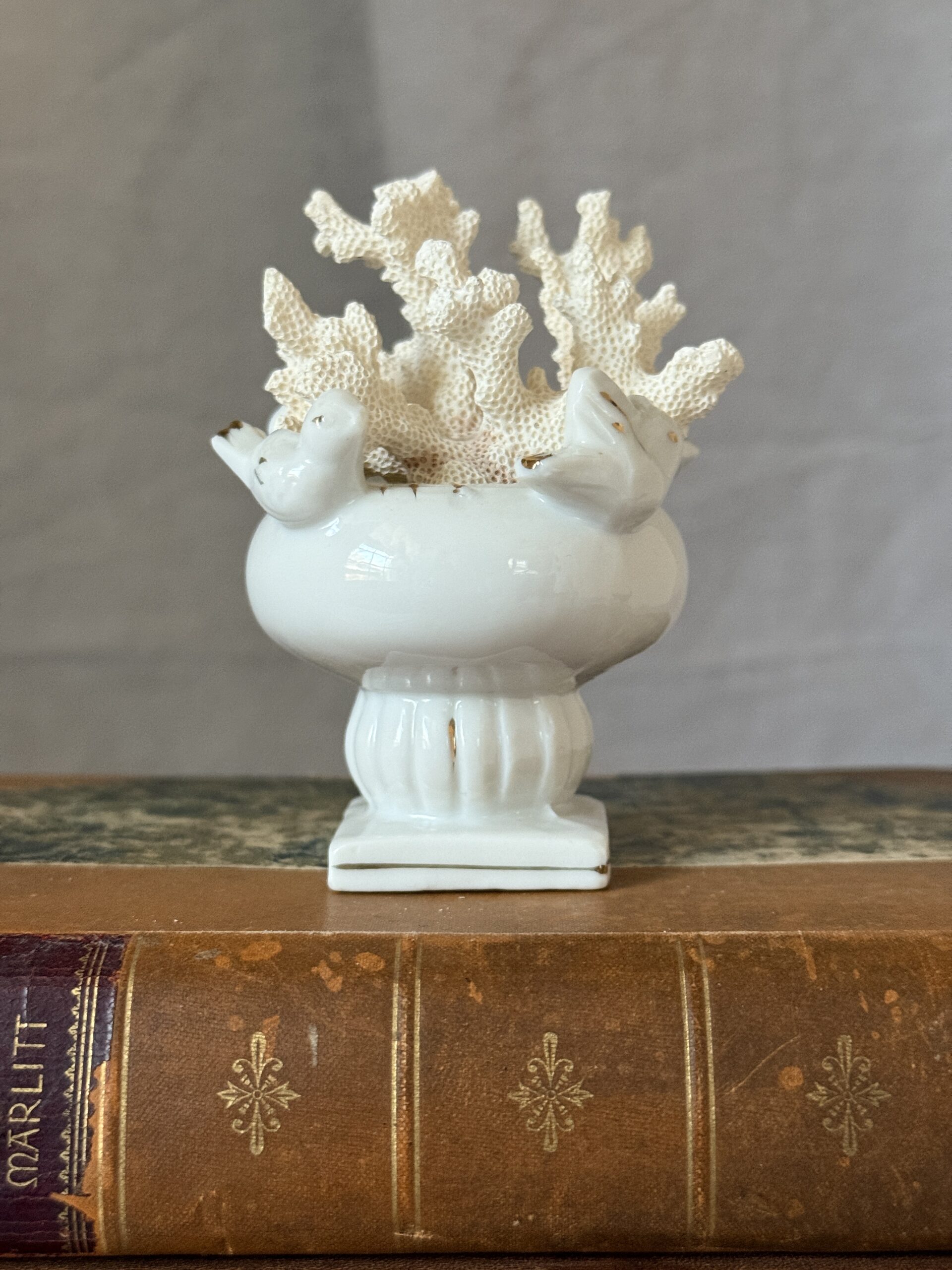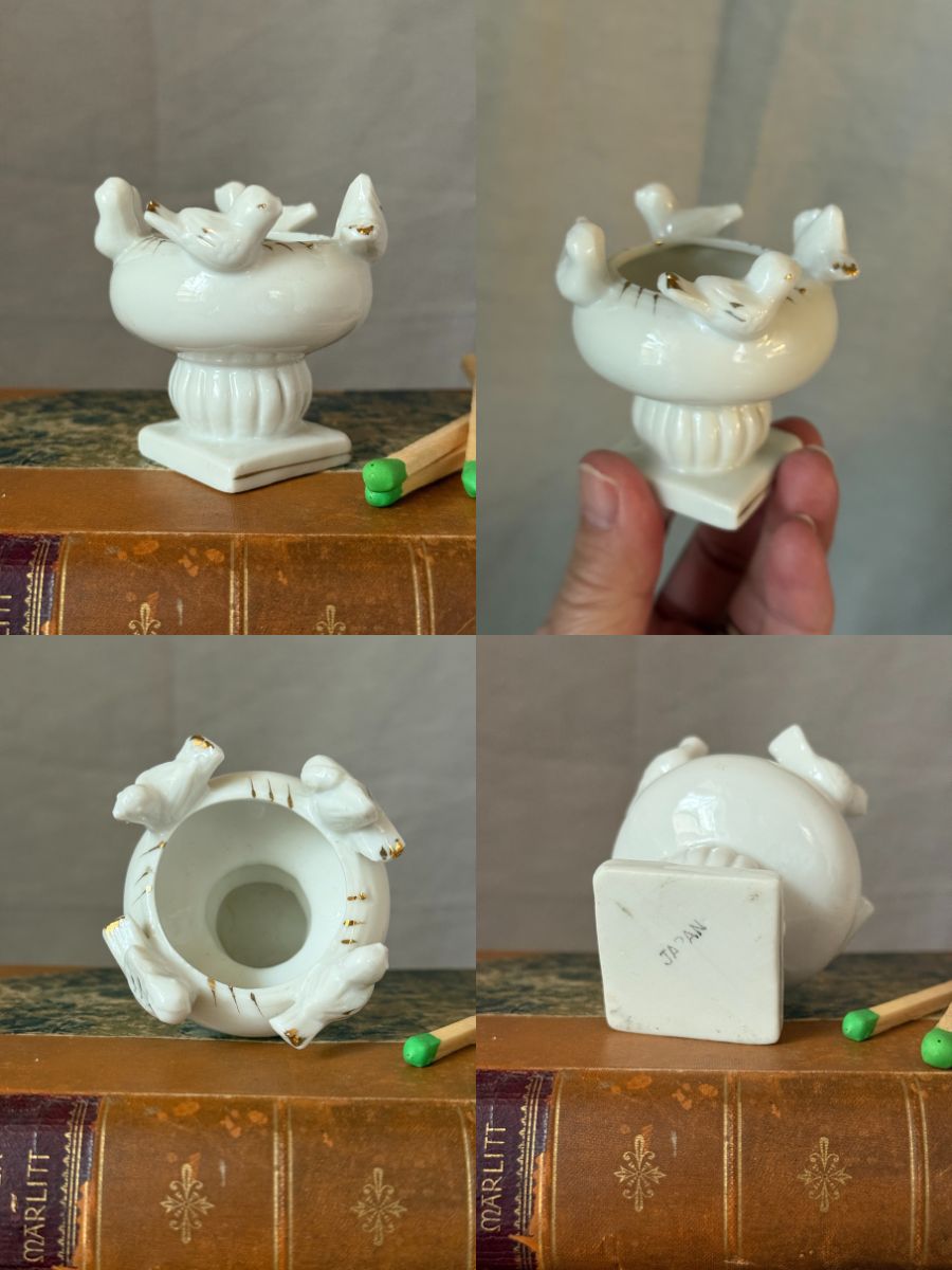 Tiny vintage porcelain bird bath with birds and gold accents in the Italian style with petite natural fossilized coral fragment. Together they measure approx. 3.75″ tall. The bird bath, made in Japan, measures 2.25″ at its widest x 2.5″ tall and 1.5″ diameter at the rim. The coral measures approx. 2.5″ tall 2.75″ wide. Great little piece for the cabinet of curiosities or shelf styling. Style the bird bath seasonally with a bottle brush Christmas tree, mini pumpkin for fall, or egg for Easter.