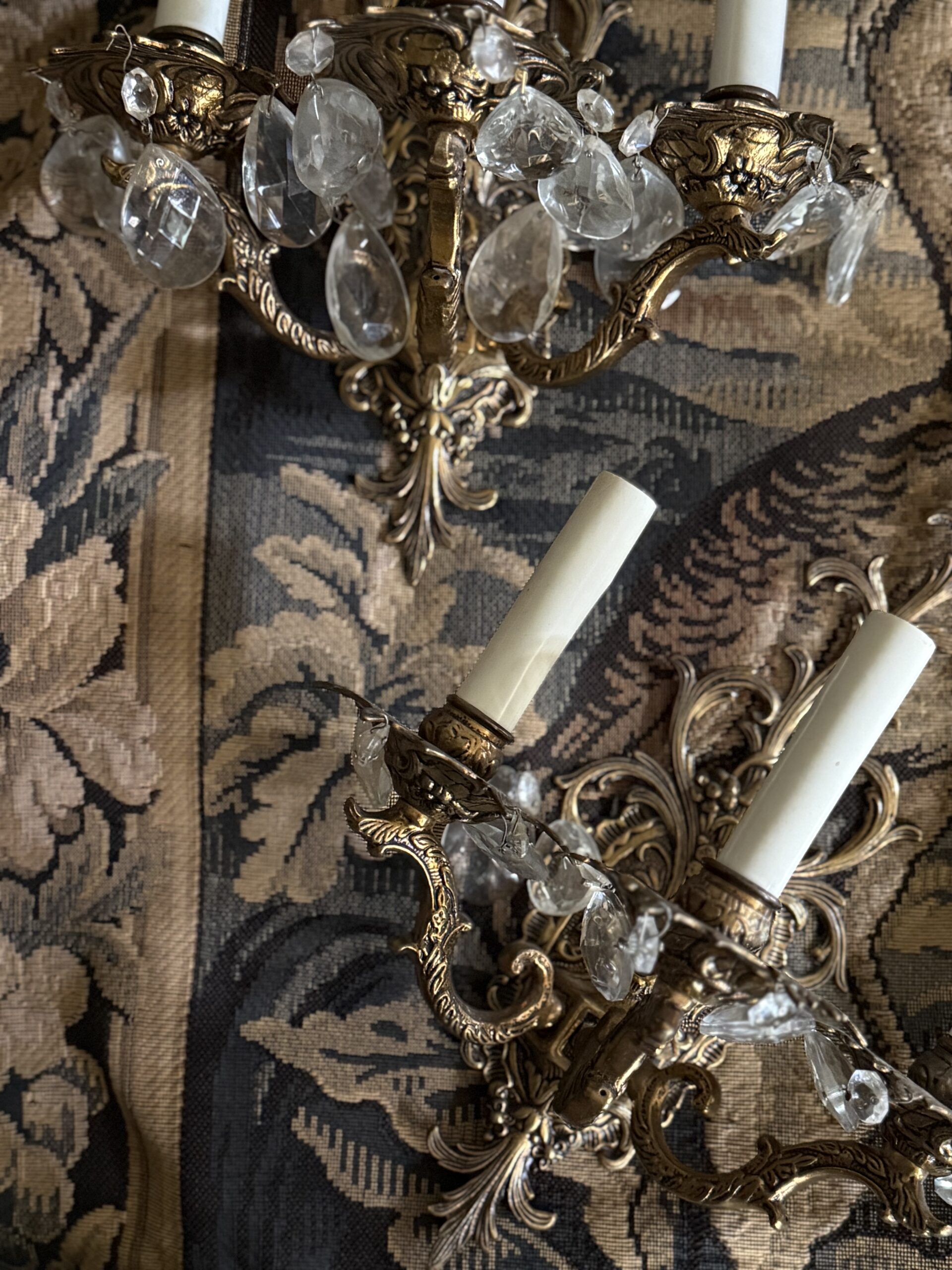 two crystal and brass sconces
