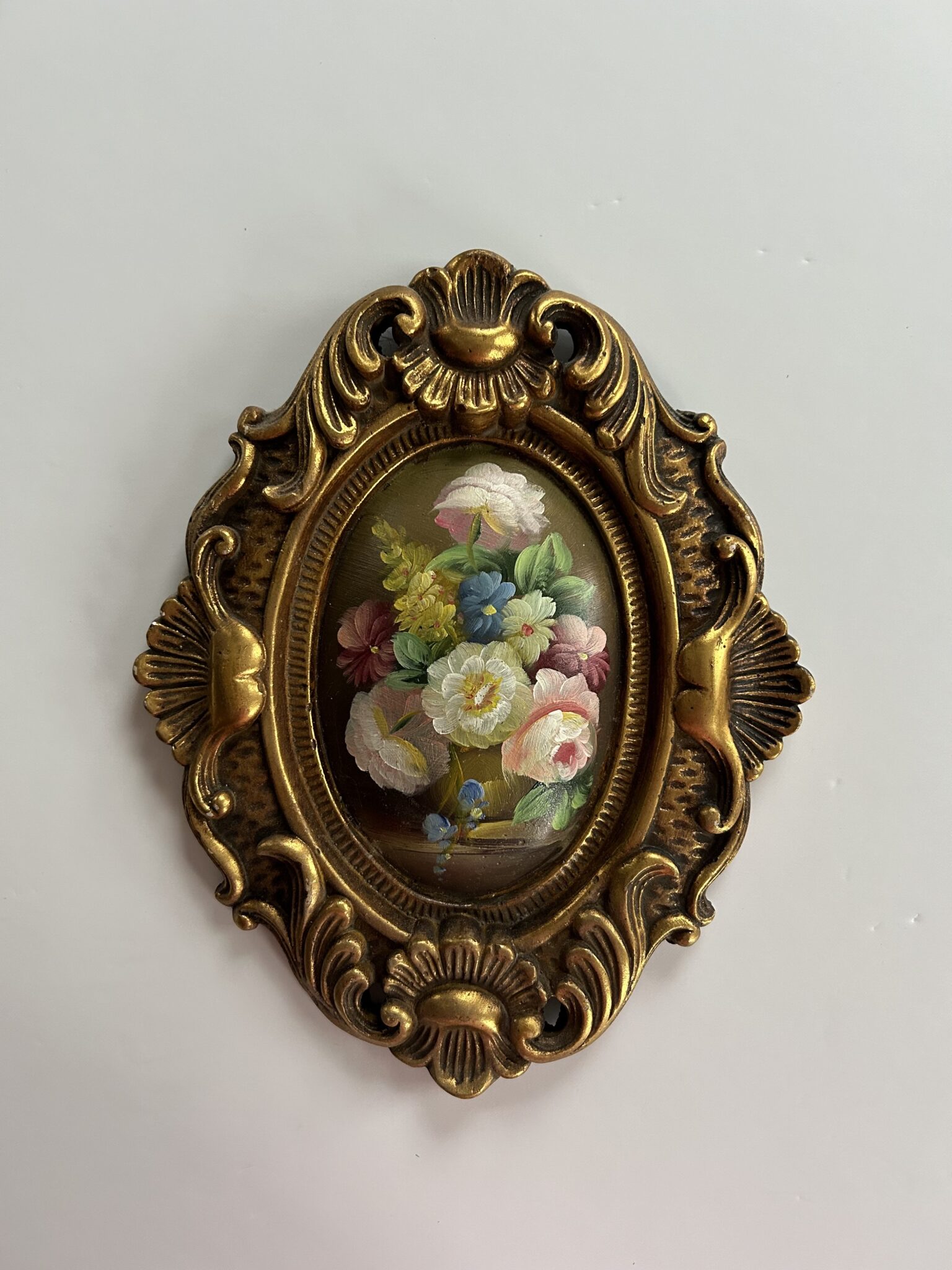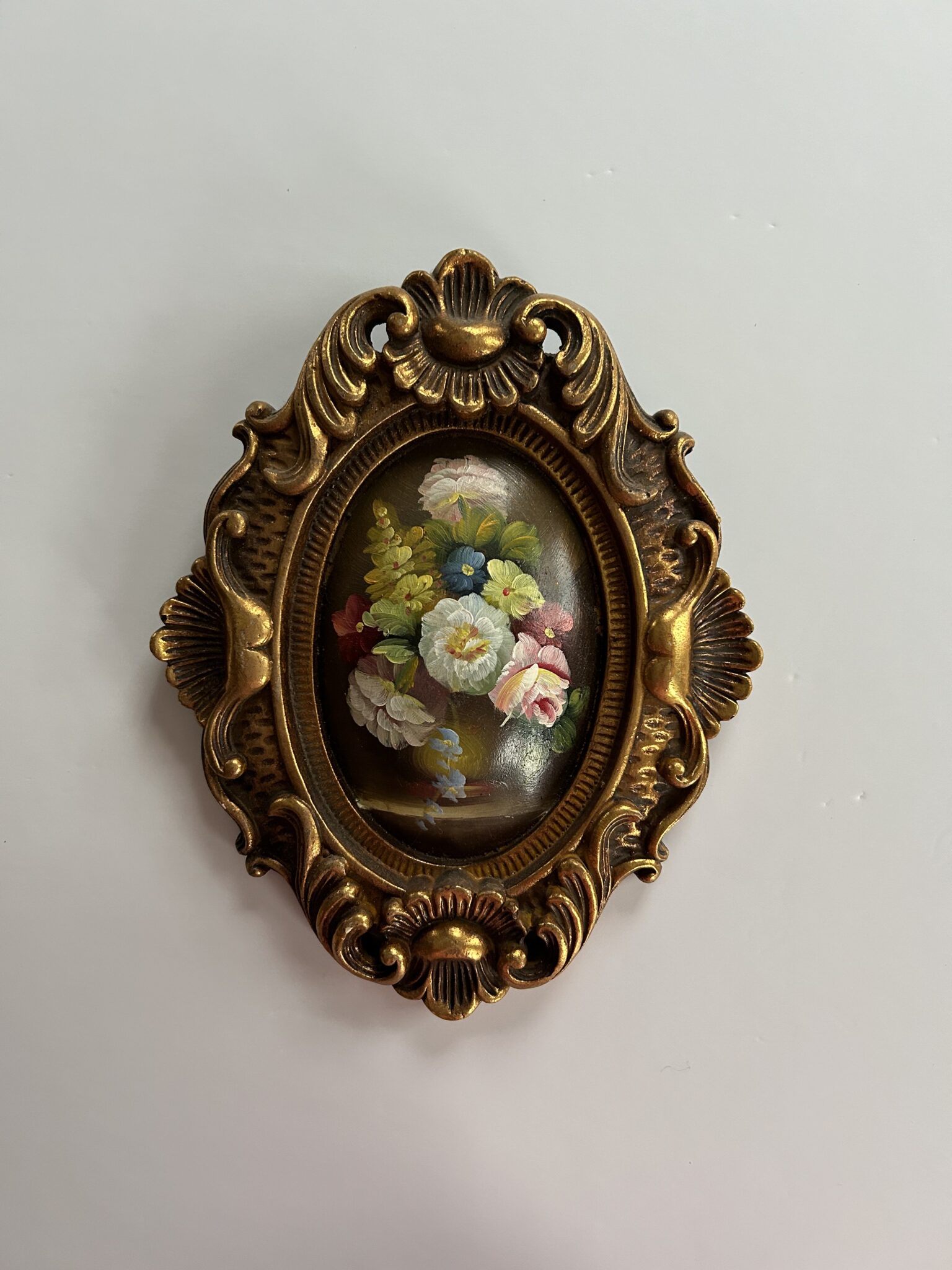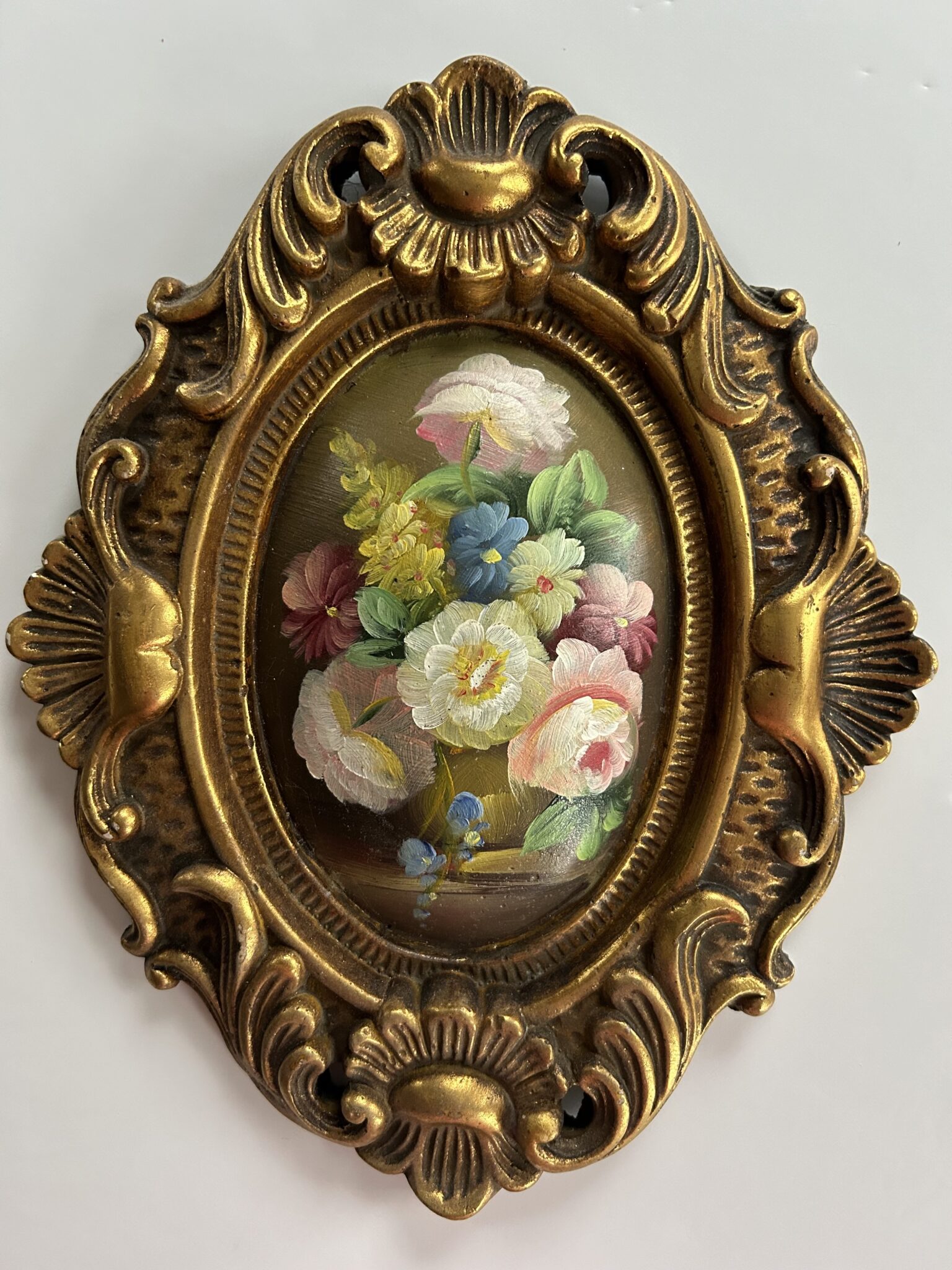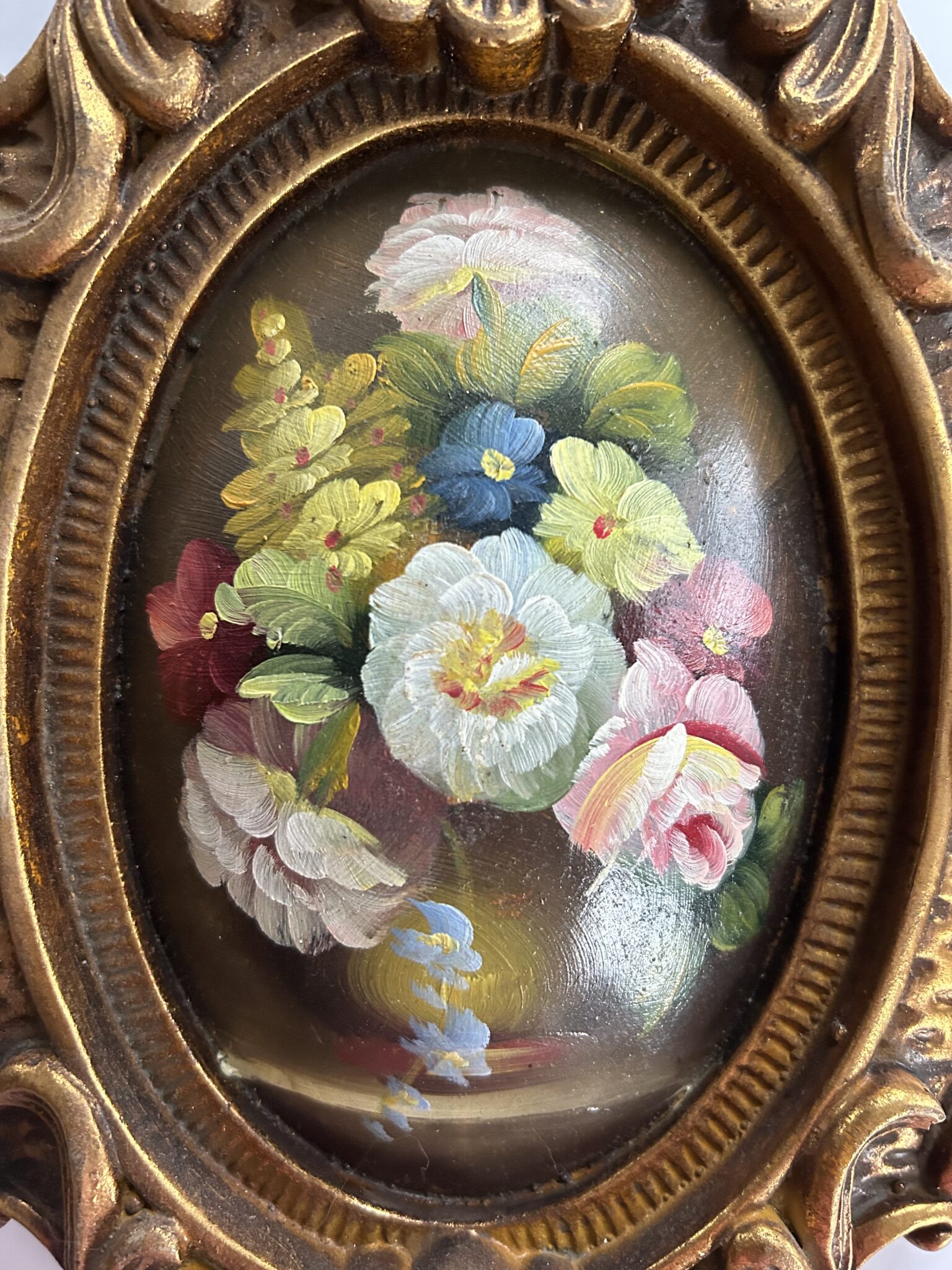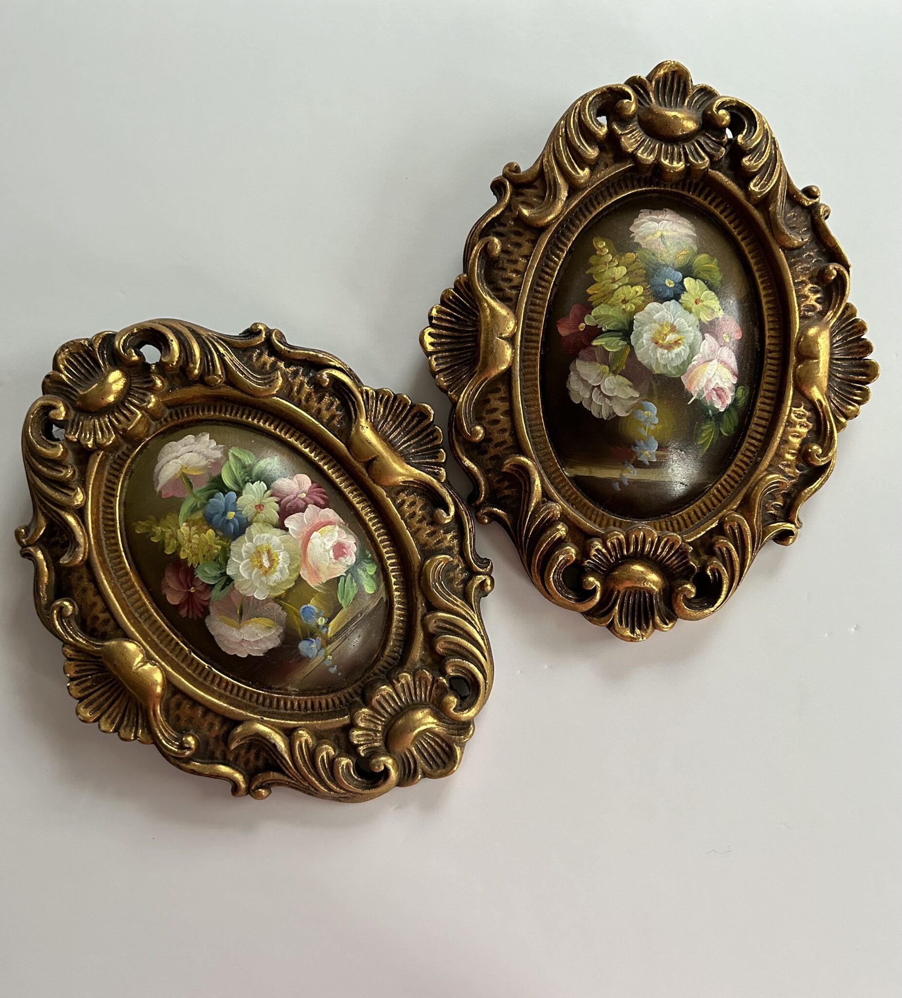Two lovely floral oil paintings in ornate wooden frames. These paintings are painted on a convex surface that curve outwards. Very versatile sizes and can be styled in a variety of different locations around the home.