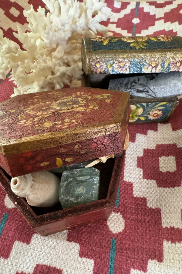 Two of the sweetest little wooden boxes. Each has a crackle finish and a floral design with gold edge. These could be added to a coffee table for interest and displayed closed or open with small shells or collectibles peeking out. Great trinket boxes for dresser or storage for small items. The listing includes: