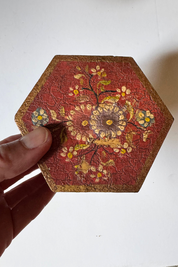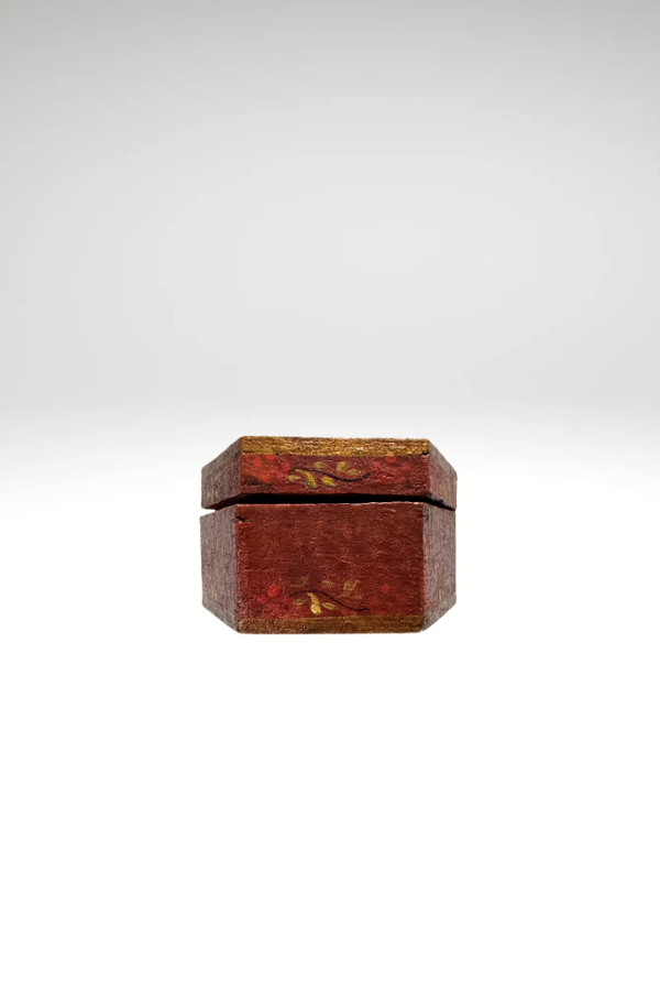 Red background with floral design. Unfinished wood inside and bottom. 4 x 3.5 x 2”