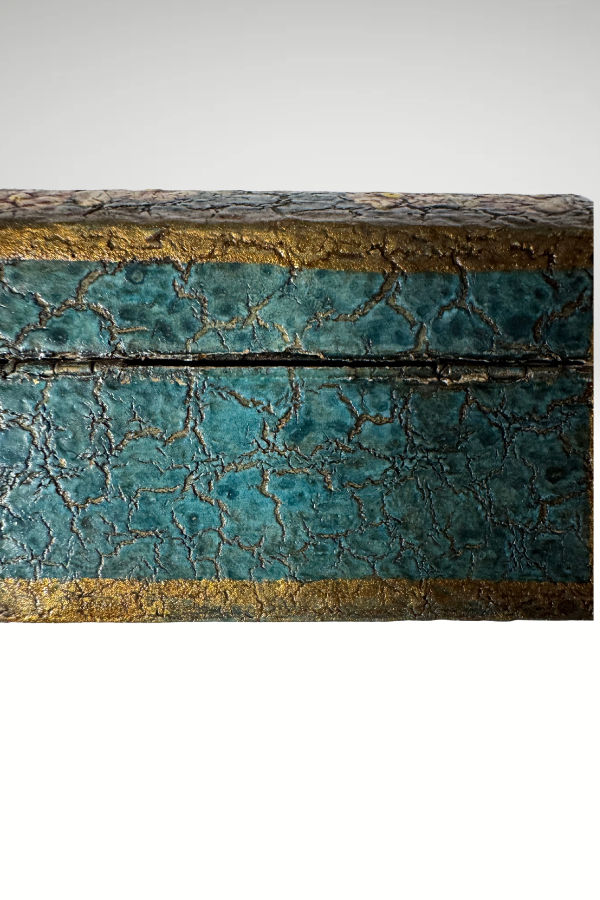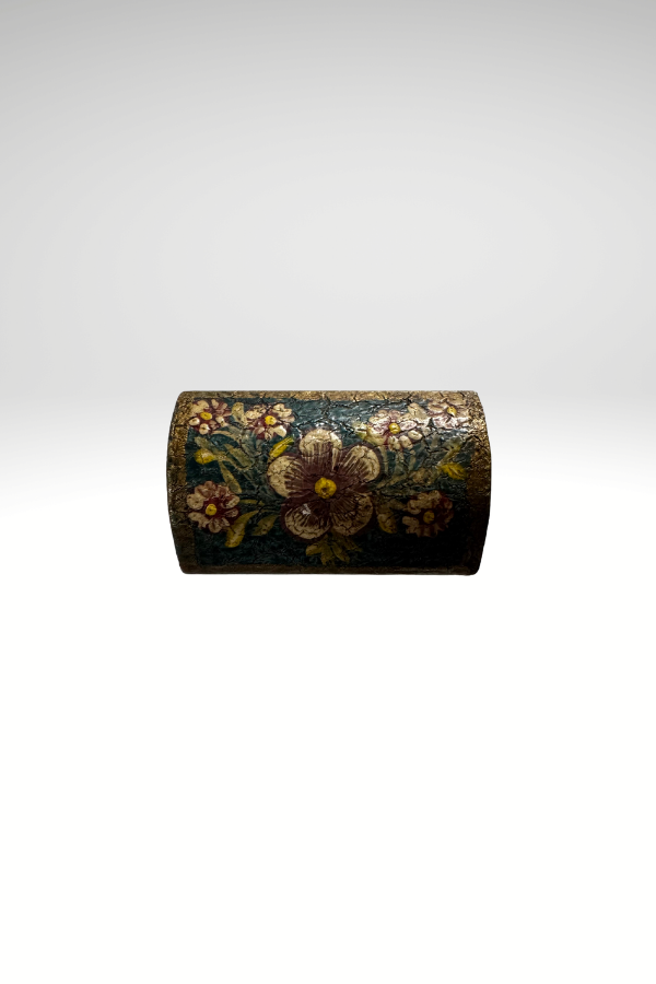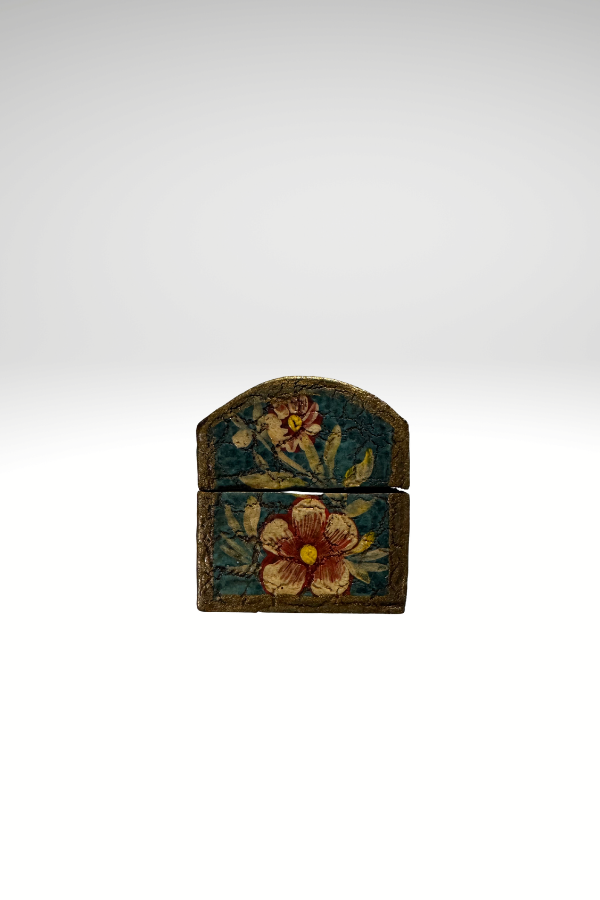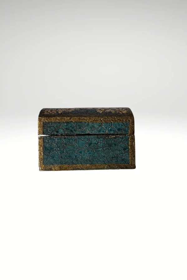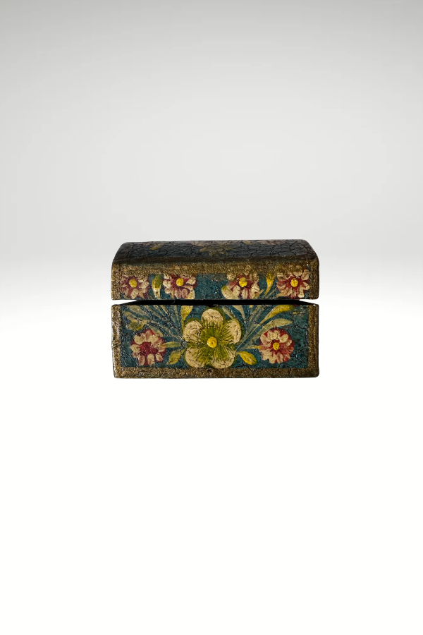 Teal background with floral design. Unfinished wood inside and on bottom. 3.5 x 2.5 x 2”