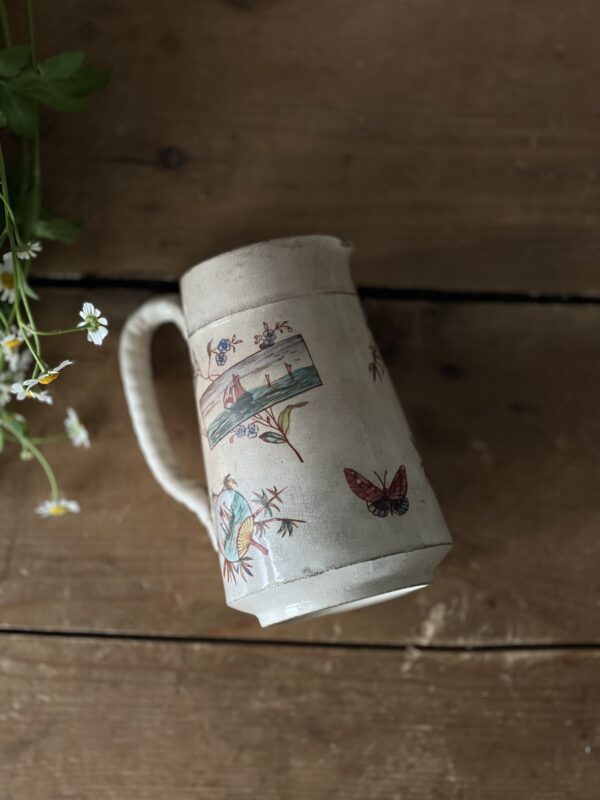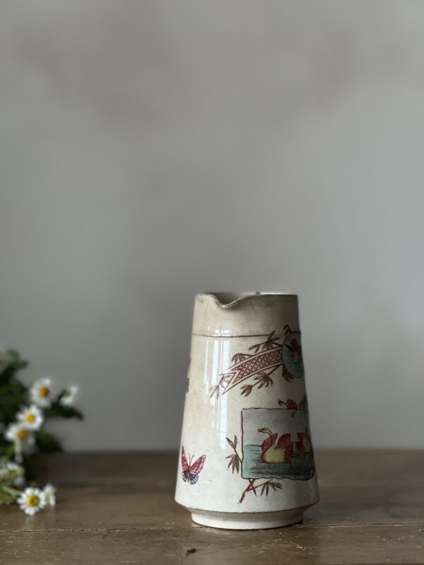Charming small ironstone pitcher with a darling transfer print of ships, swans, and butterflies. A whimsy and playful piece with romantic pinks and teals. Pitcher is heavily crazed and teastained and the twisted handle has previously broken off and has been repaired. A unique piece for an ironstone and transferware collector, or for someone who adores one of a kind and whimsy items.
