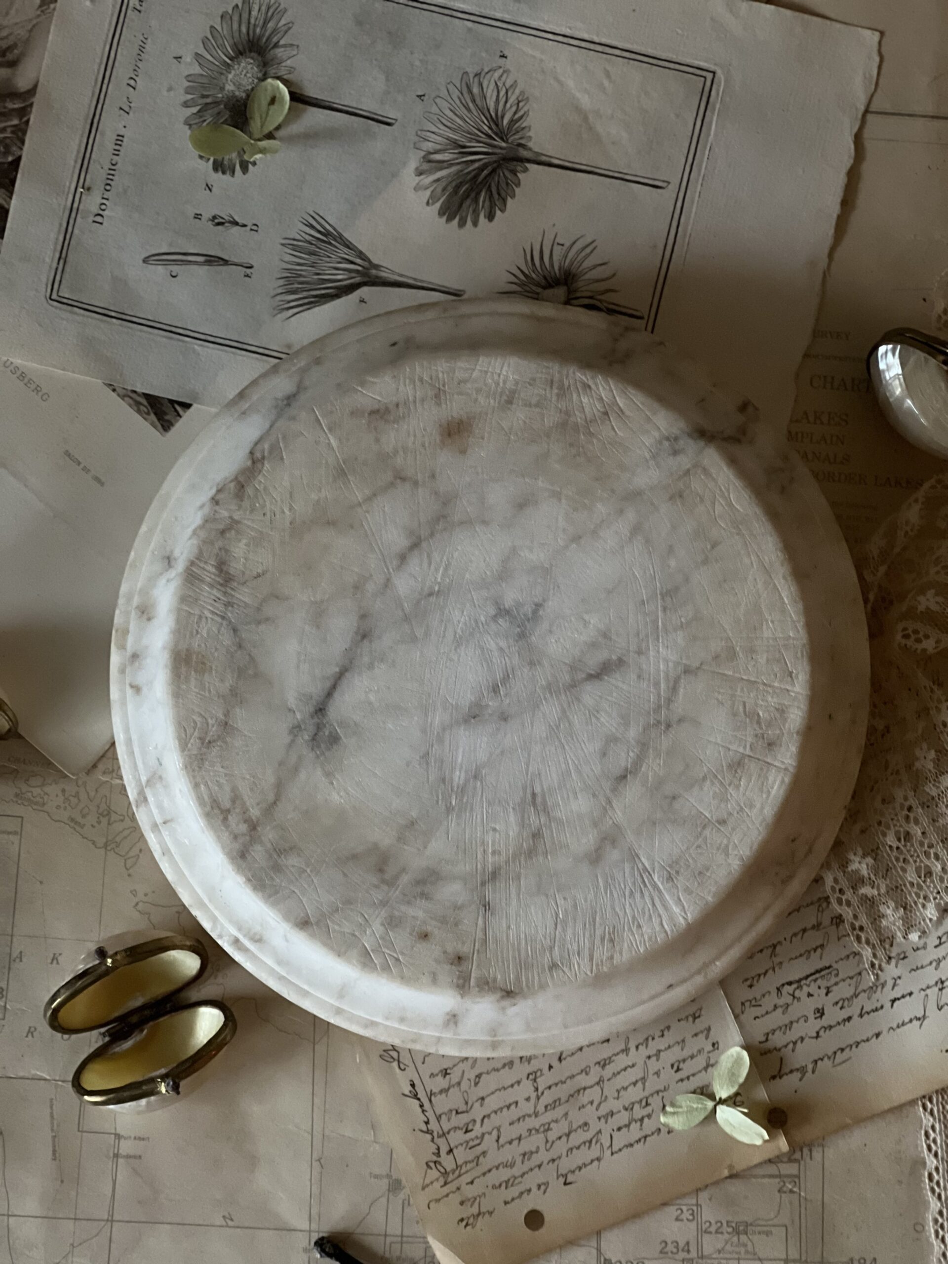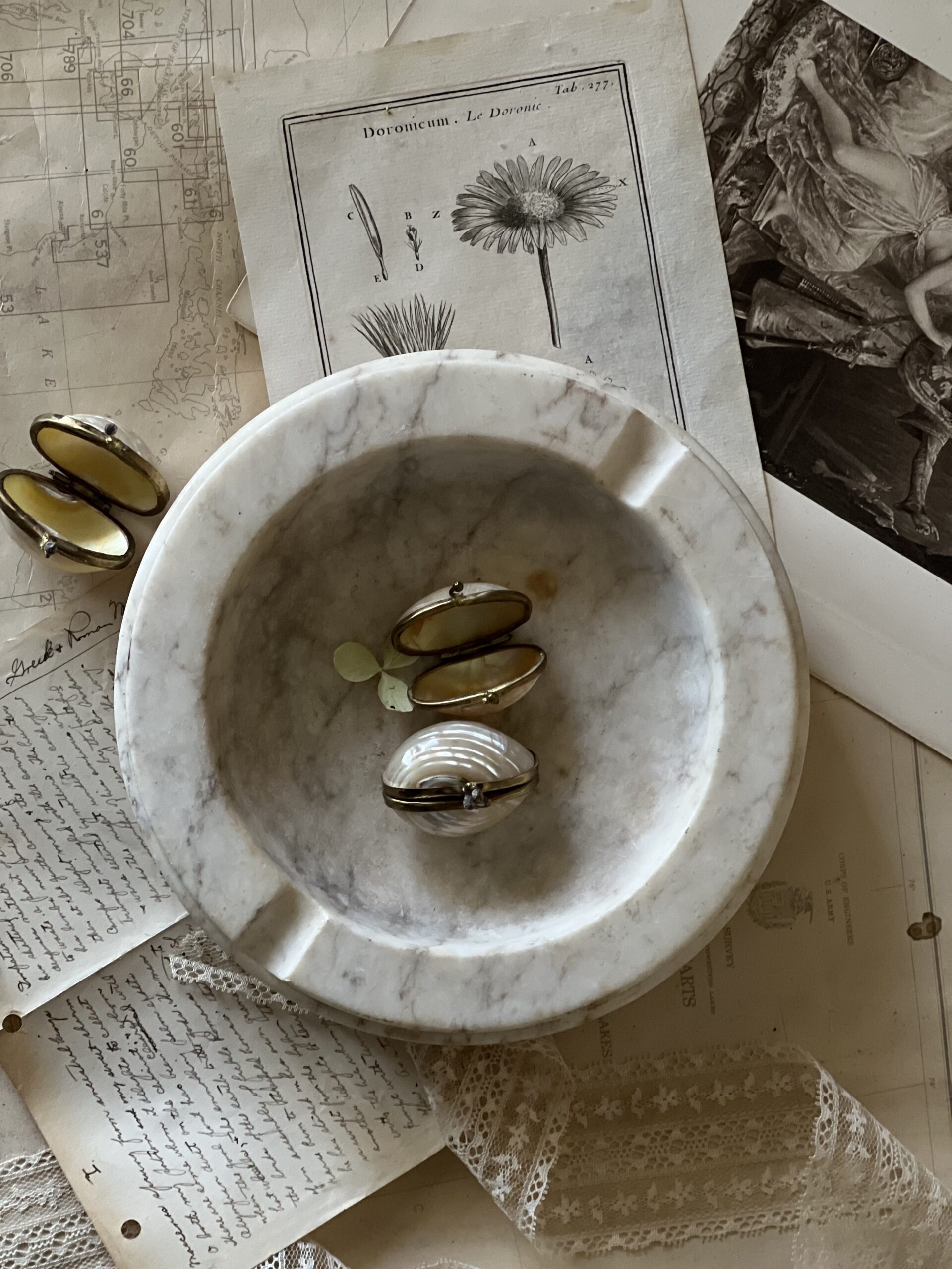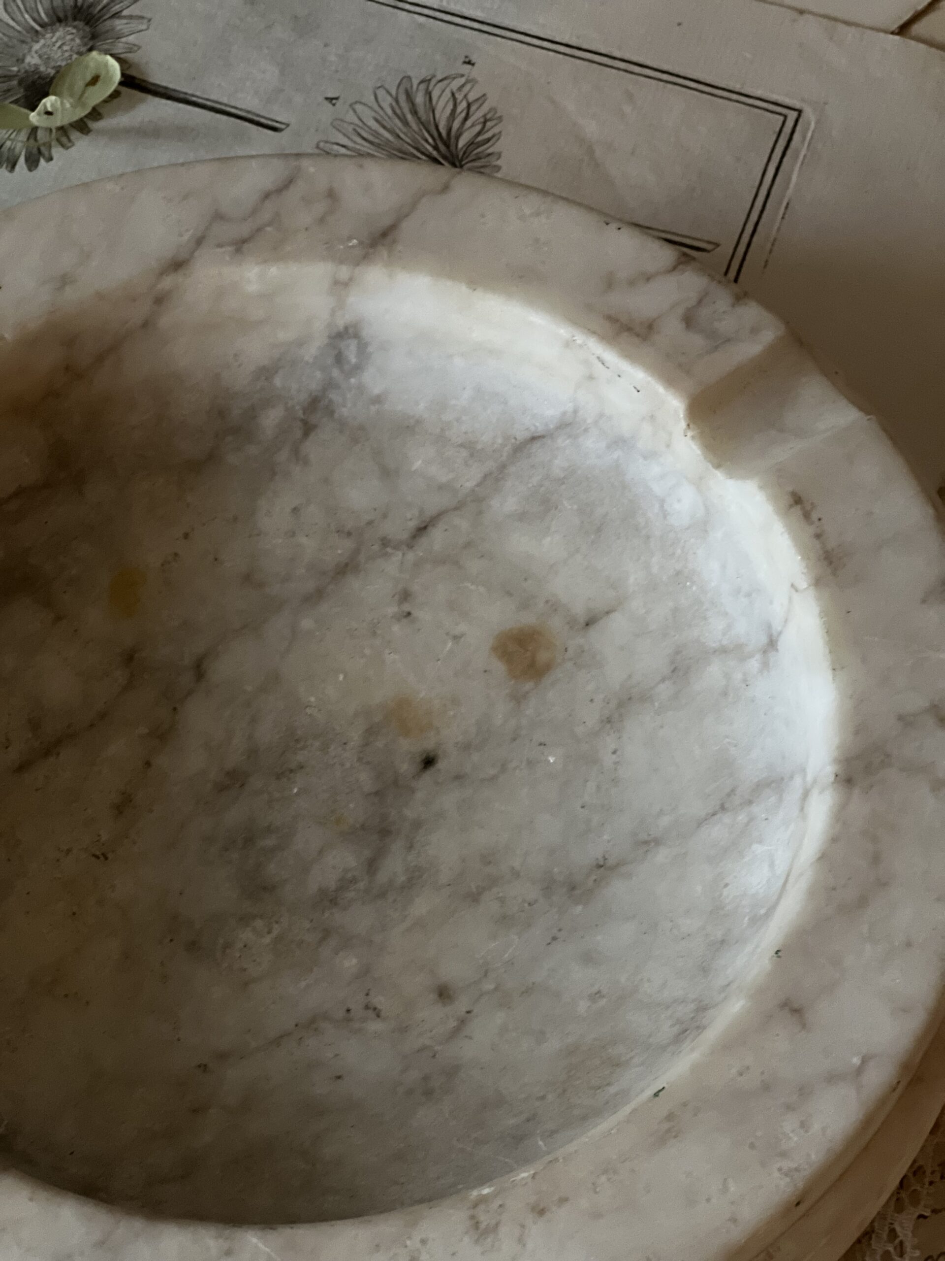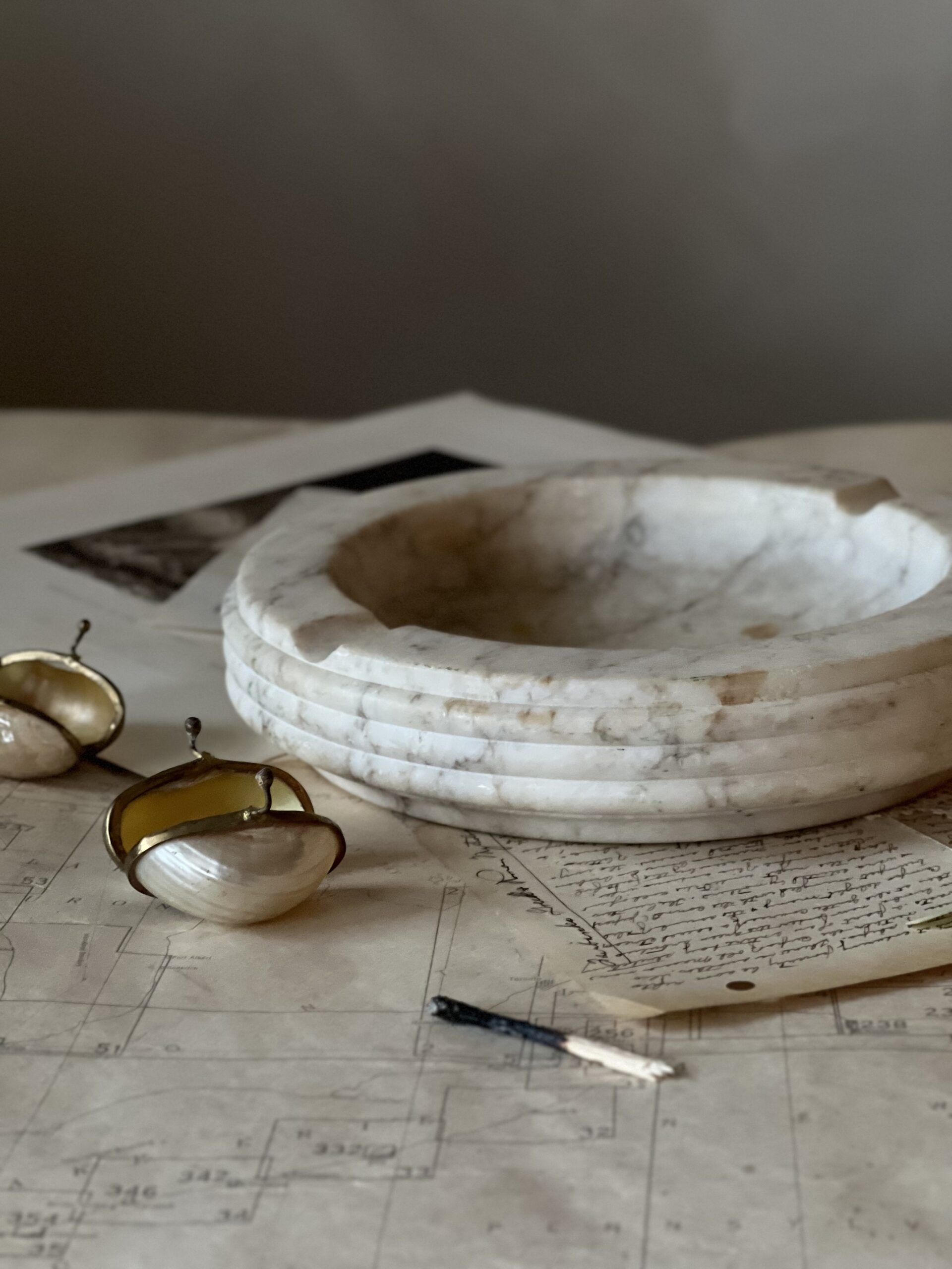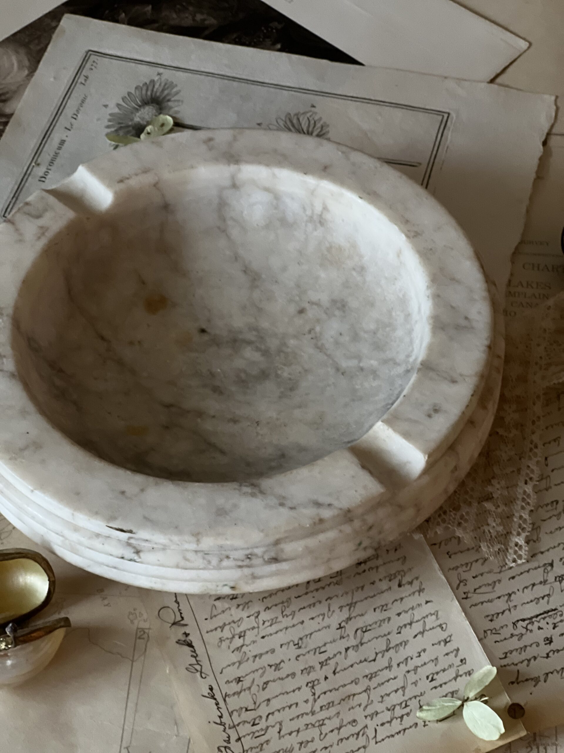 Gorgeous marble ahstray with creamy white stone and soft grey veining. Carved fluting runs horizontally along the edge. Stone has some small spots of staining and light scuffing. A perfect catch-all for a coffee table, or on a console in the entryway. Great for holding small trinkets, like a small collection of shells, rings, or a matchbook holder.
