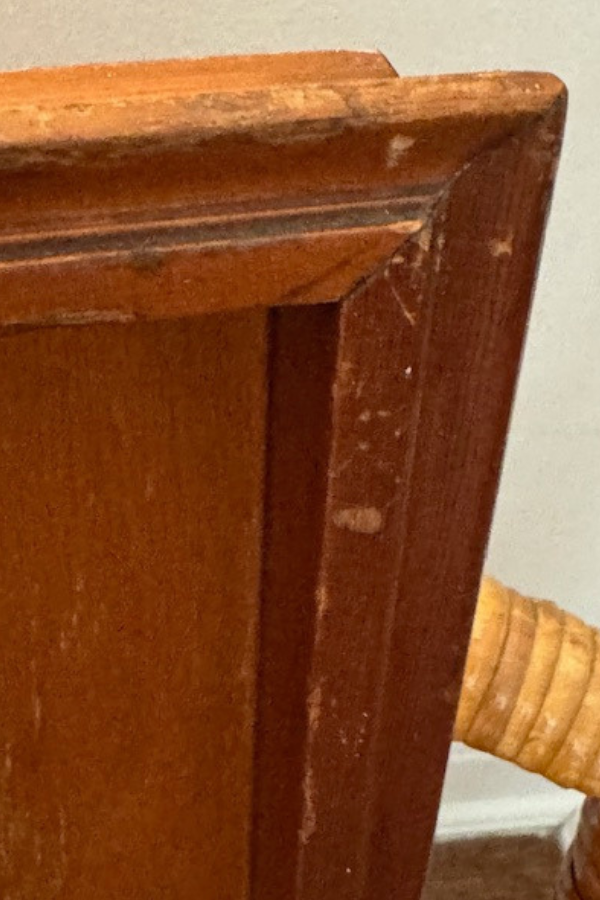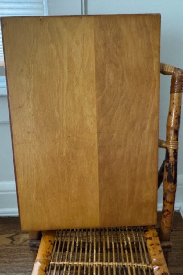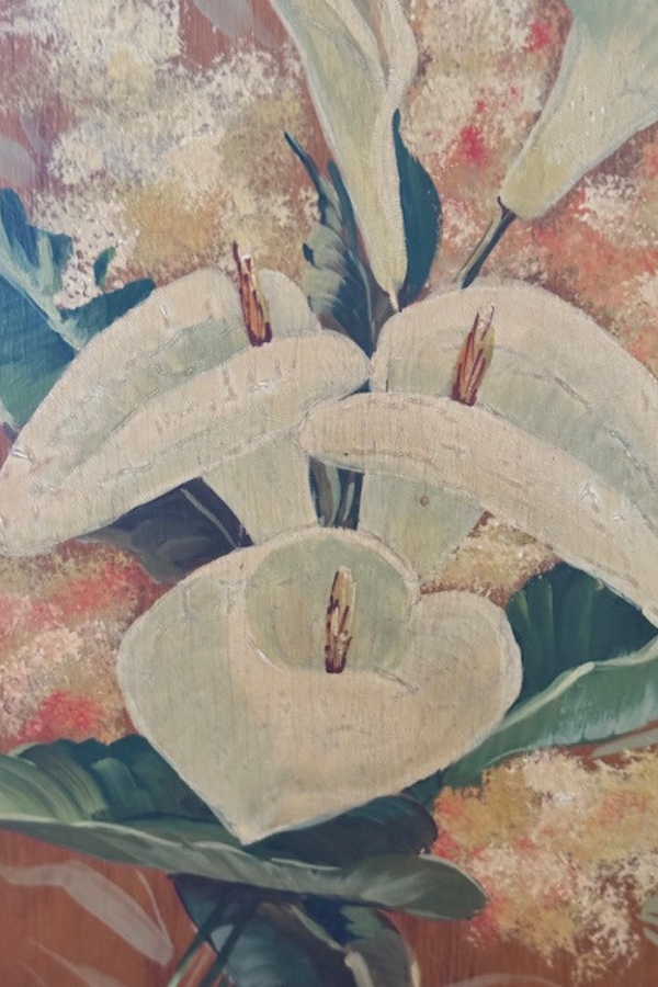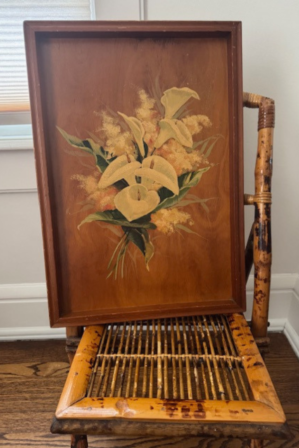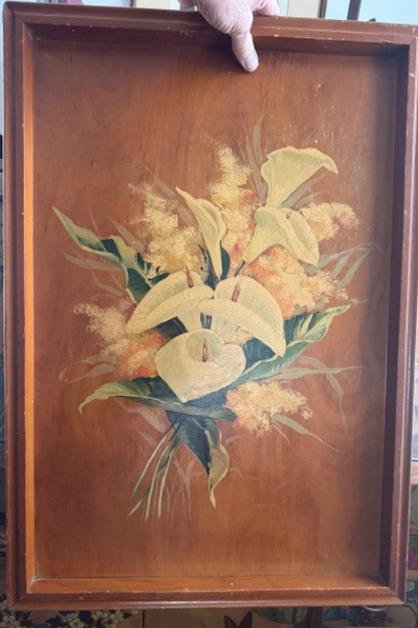I found this wooden tray at an estate sale, and don’t know much about it. Imagine it was made between the 1920s and 1950s. Has a hand-painted design in the center of a bouquet. Flowers appear to be calla lilies and colors are soft and muted. The edge of the tray is almost like a frame (in fact, it is possible this was originally wall art). The wood is a little rough on the tray’s edge, and could use some conditioning to bring out its full beauty. The back is devoid of hangers which is why I thought of it as a tray, but it does have one small hole and a little of the wood veneer is snagged (see last photo). I love the Scandinavian tradition of hanging trays from the wall so that they can easily be taken down and put in use. This one would be perfect for that. It would also be incredible to style on a side table. It is large enough that it could almost take up the entire table top. The tray measures 23.25 x 16.25 inches. Shipping is included but only within the contiguous US
