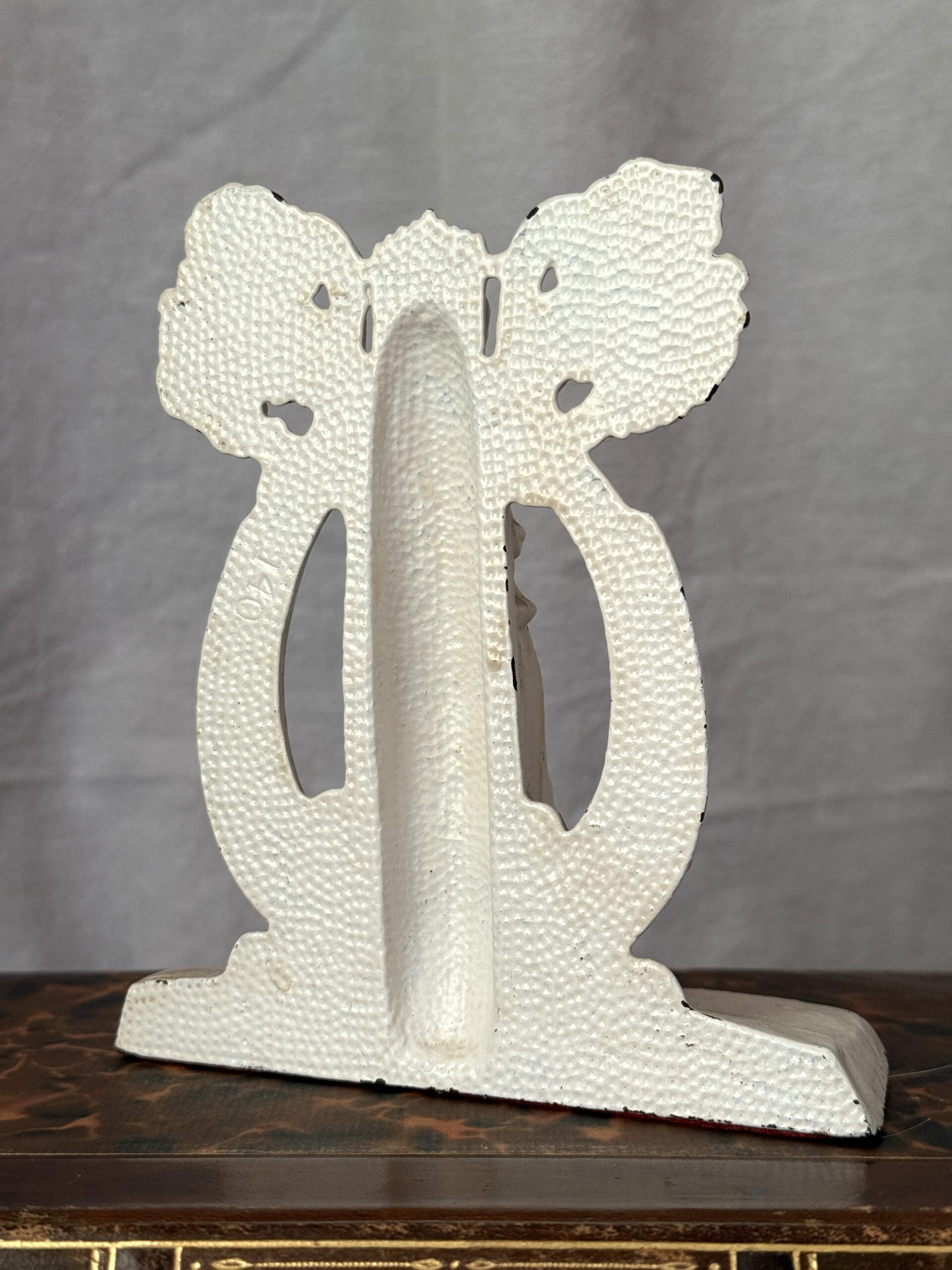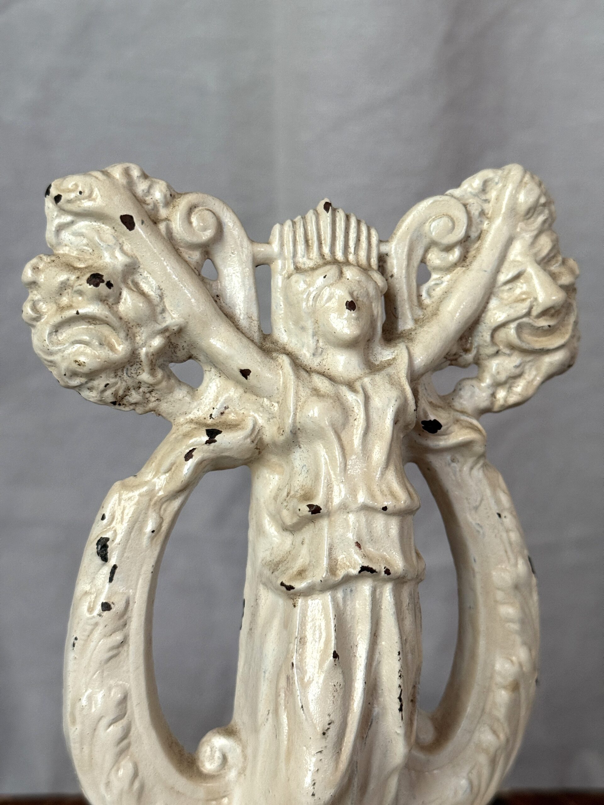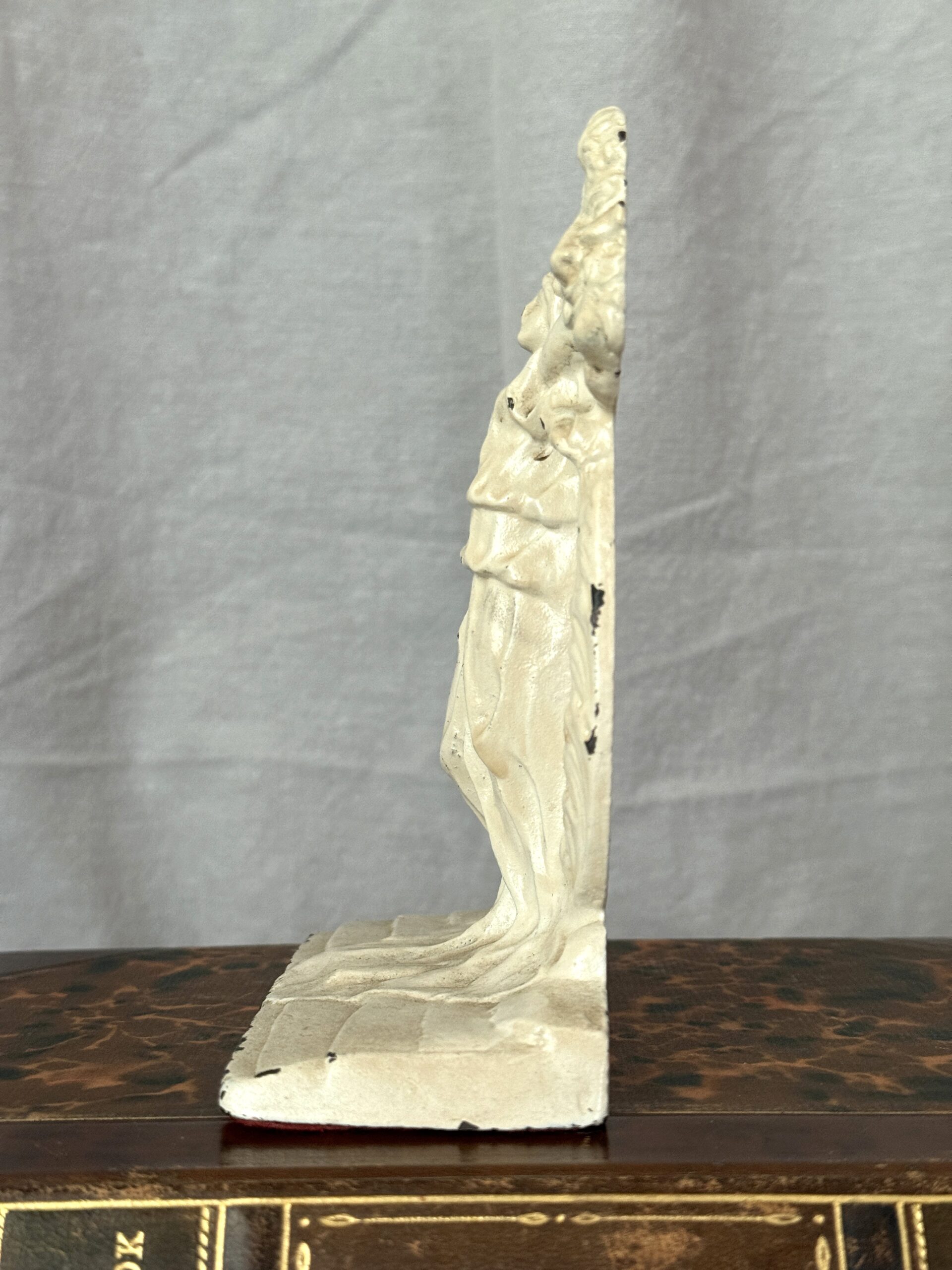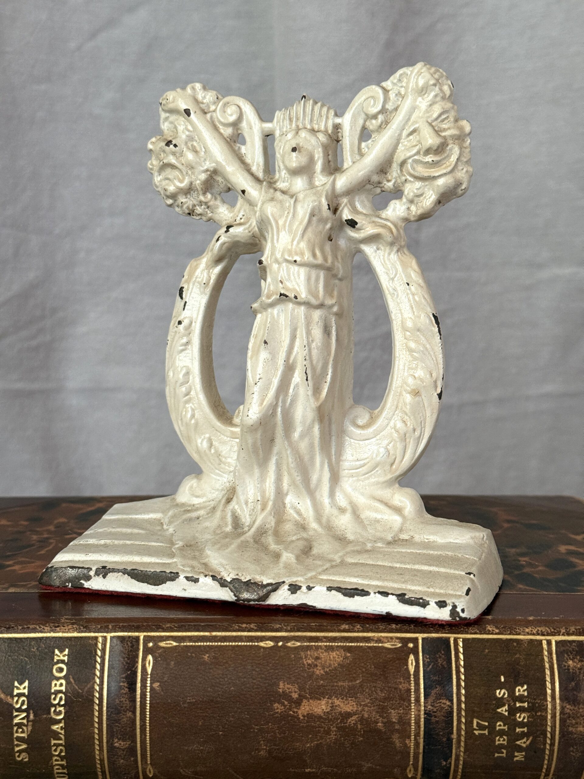 Vintage to antique Art Deco cast iron bookend featuring a female goddess figure and tragedy-and-comedy motif. Painted a creamy white, red felt on the underside. It measures 6″ tall x 5.25″ wide x 2.25″ deep and weighs 2 lbs. 6 oz. Back side has a pebbled finish and is incised with the number 140. No visible maker’s mark. Great shelf-styling piece.