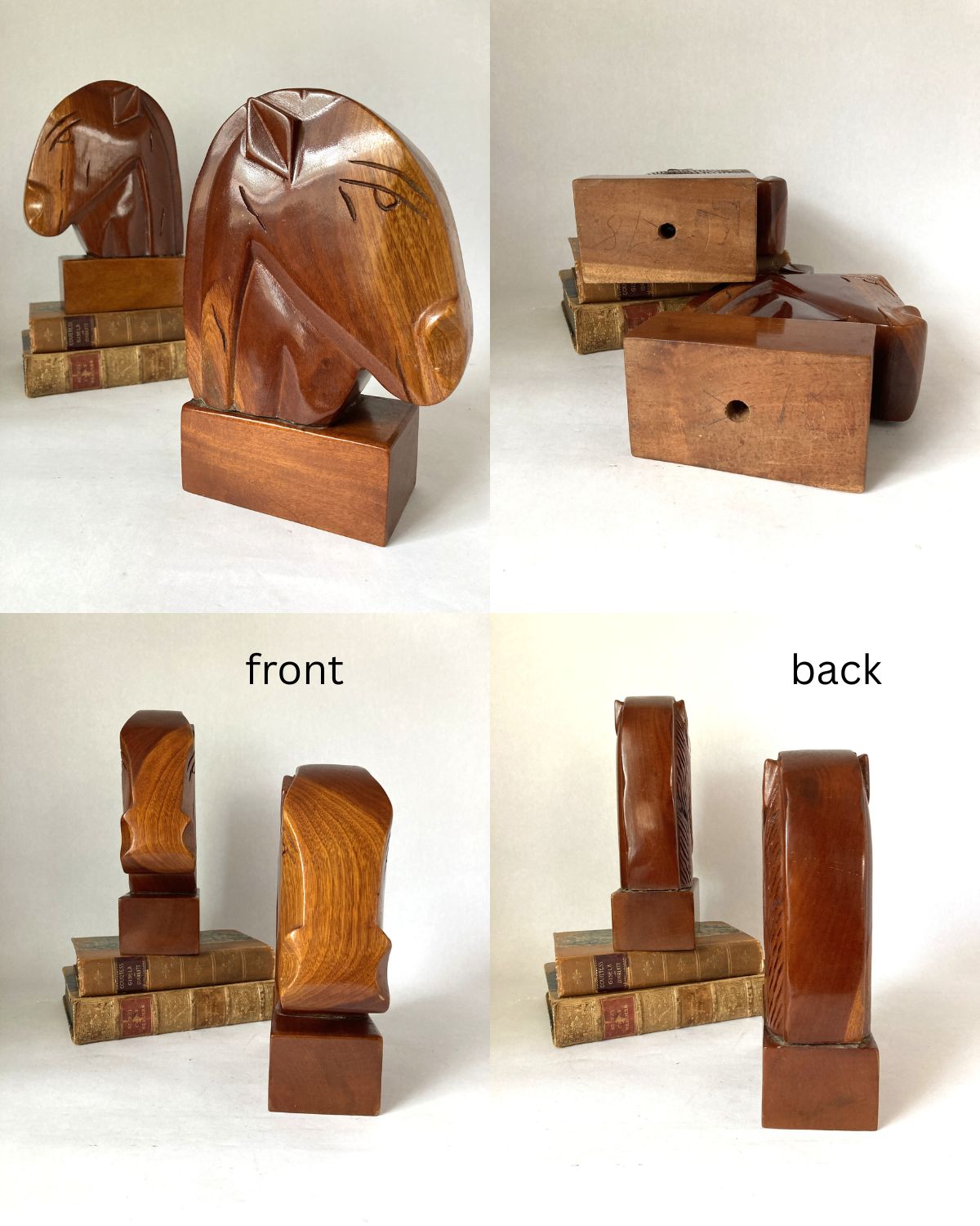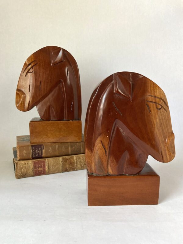 Large set of carved wood (perhaps mahogany) Art Deco style horse head bookends. The stylized design is reminiscent of the Italian Futurism and Russian Constructivism of the 1910s to early 1940s. The bookends measure 9.5″ tall x 6.25″ at their widest x 3″ deep at the base and have a combined weight of 6 lbs. They are in excellent preowned vintage condition. Great shelf-styling piece for both modern and vintage aesthetics.