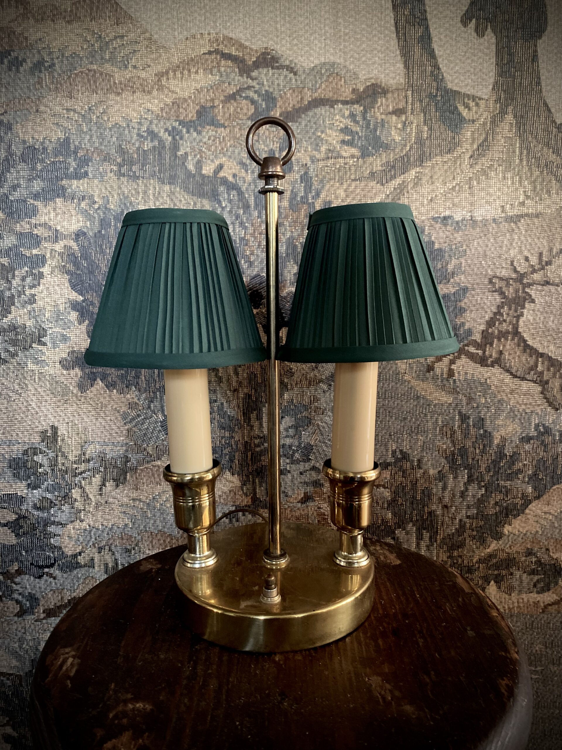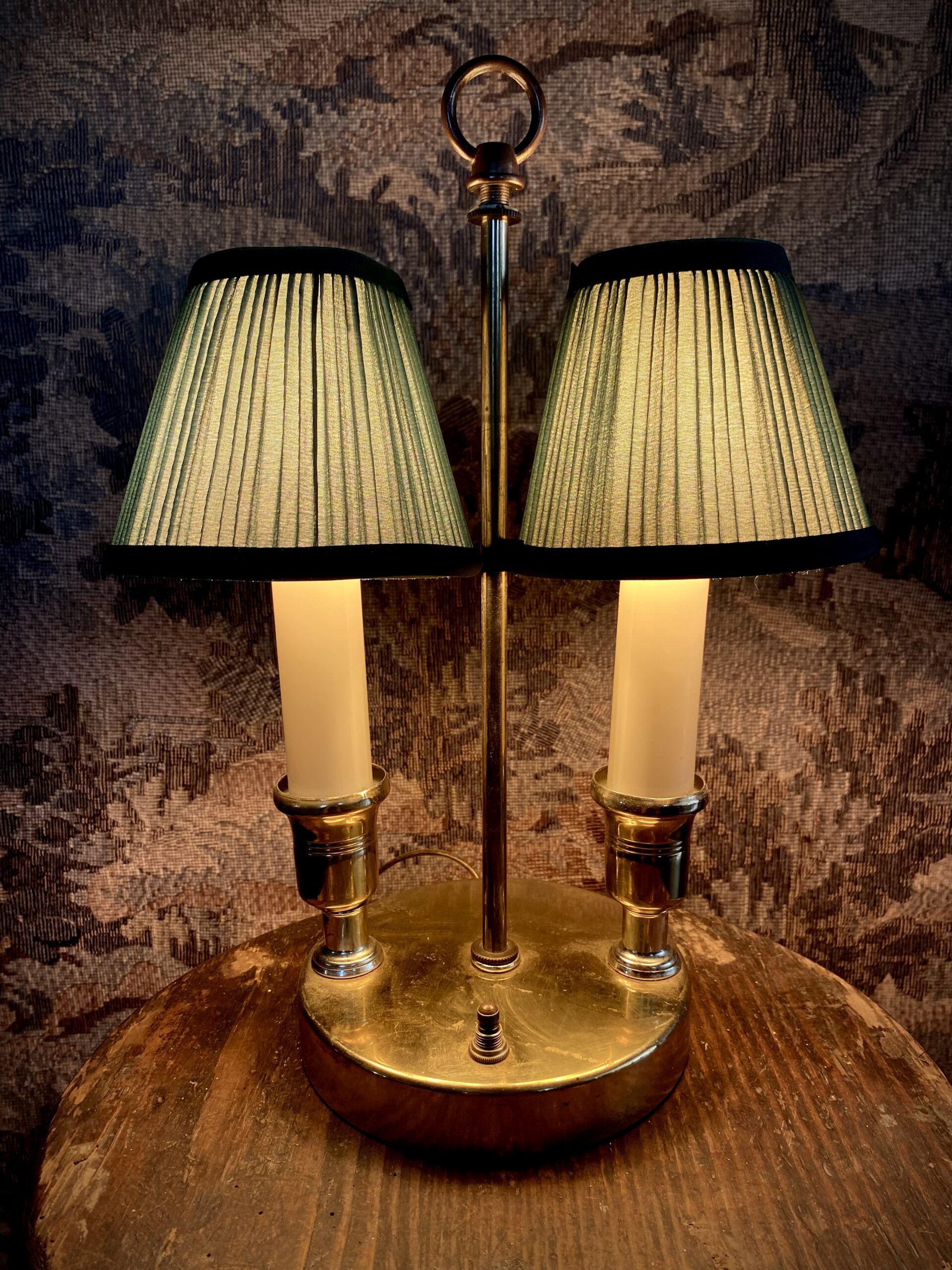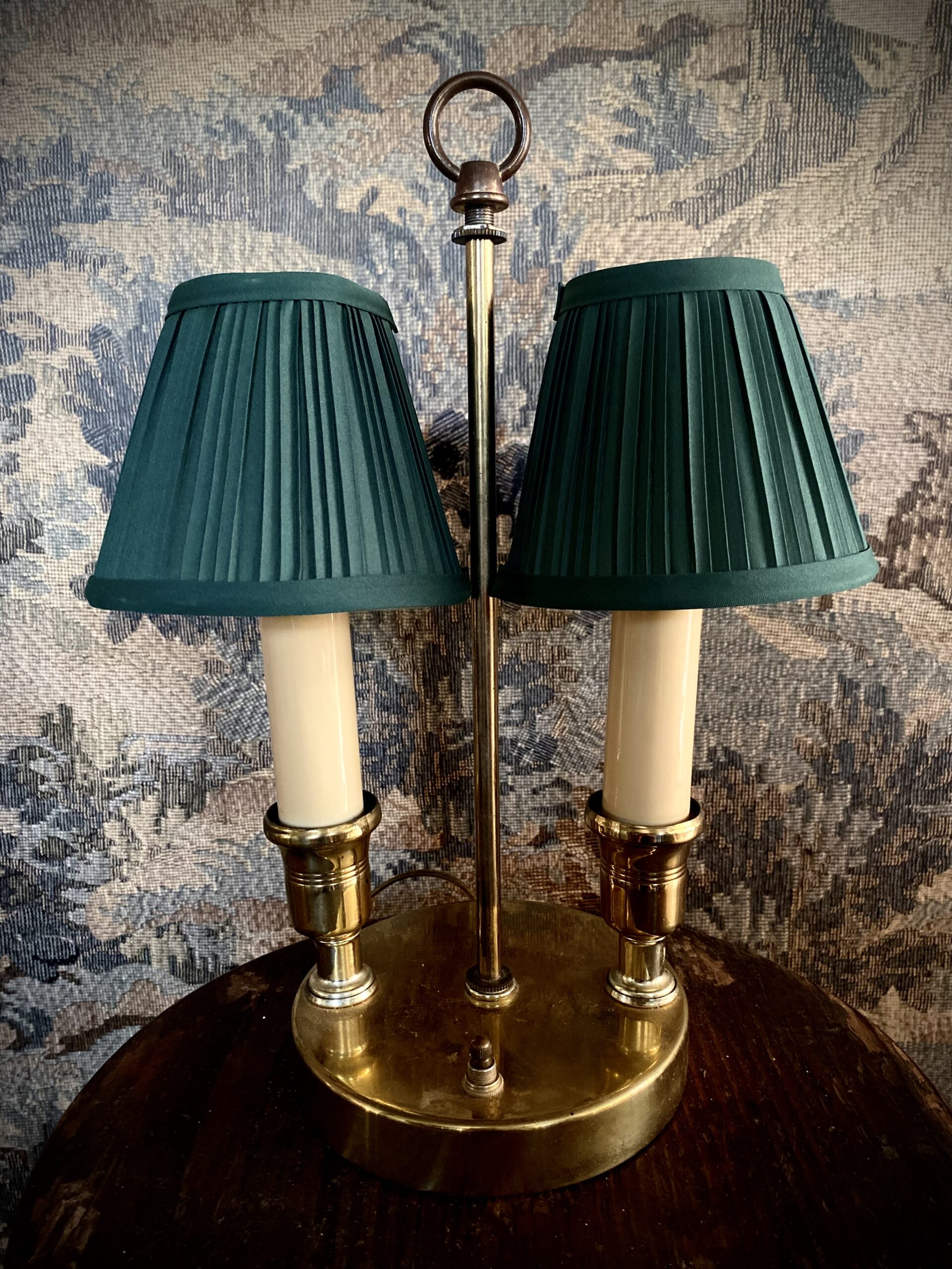 Small bouillotte style lamp, most likely mid-century. Two pleated, green, clip-on shades are included with the lamp, but this lamp also allows for a shade to be screwed on the top if you would rather use one larger oval shade. Measures 14″ tall and 6″ base. In working condition. Small enough to be used on a kitchen counter!