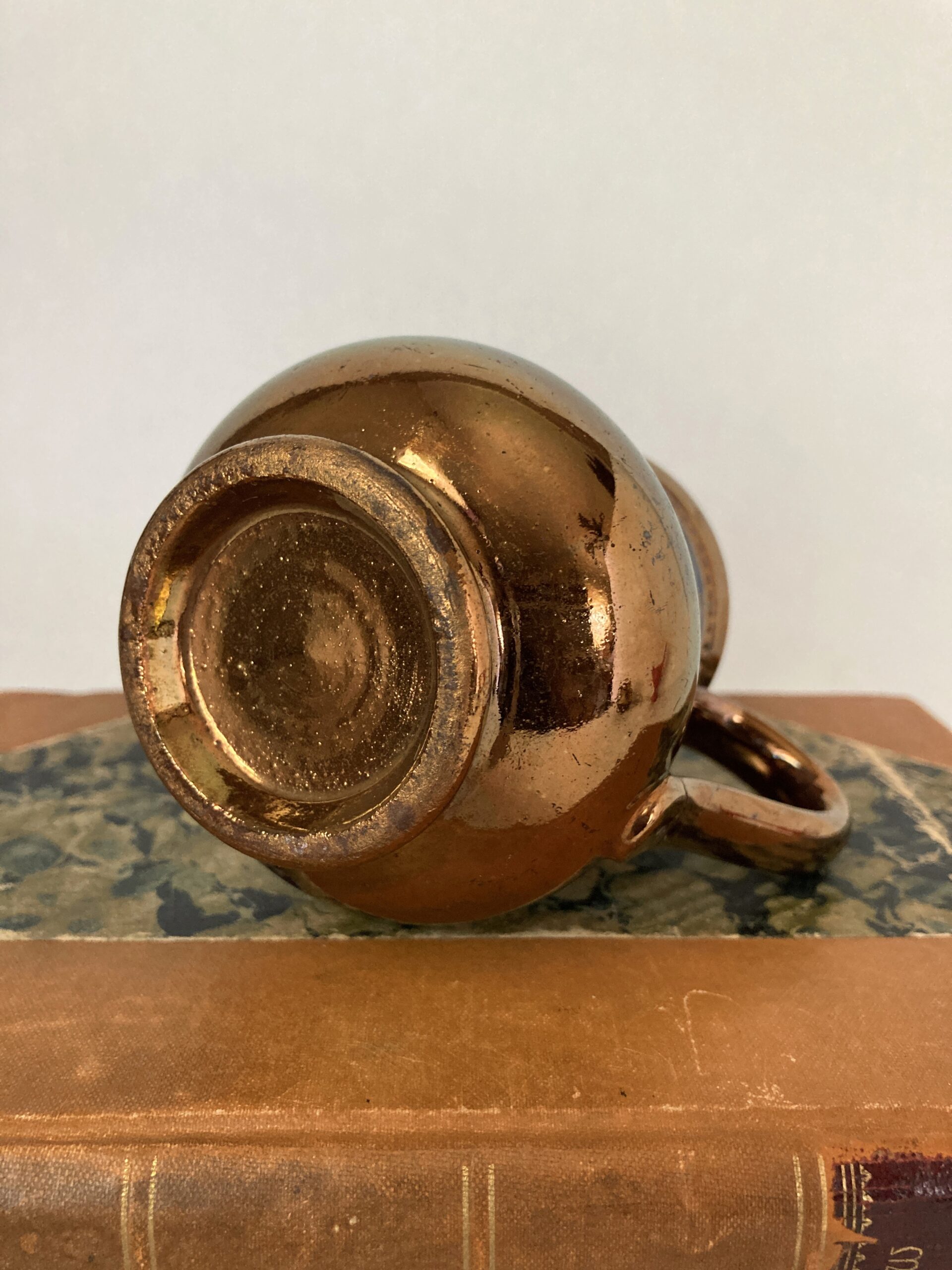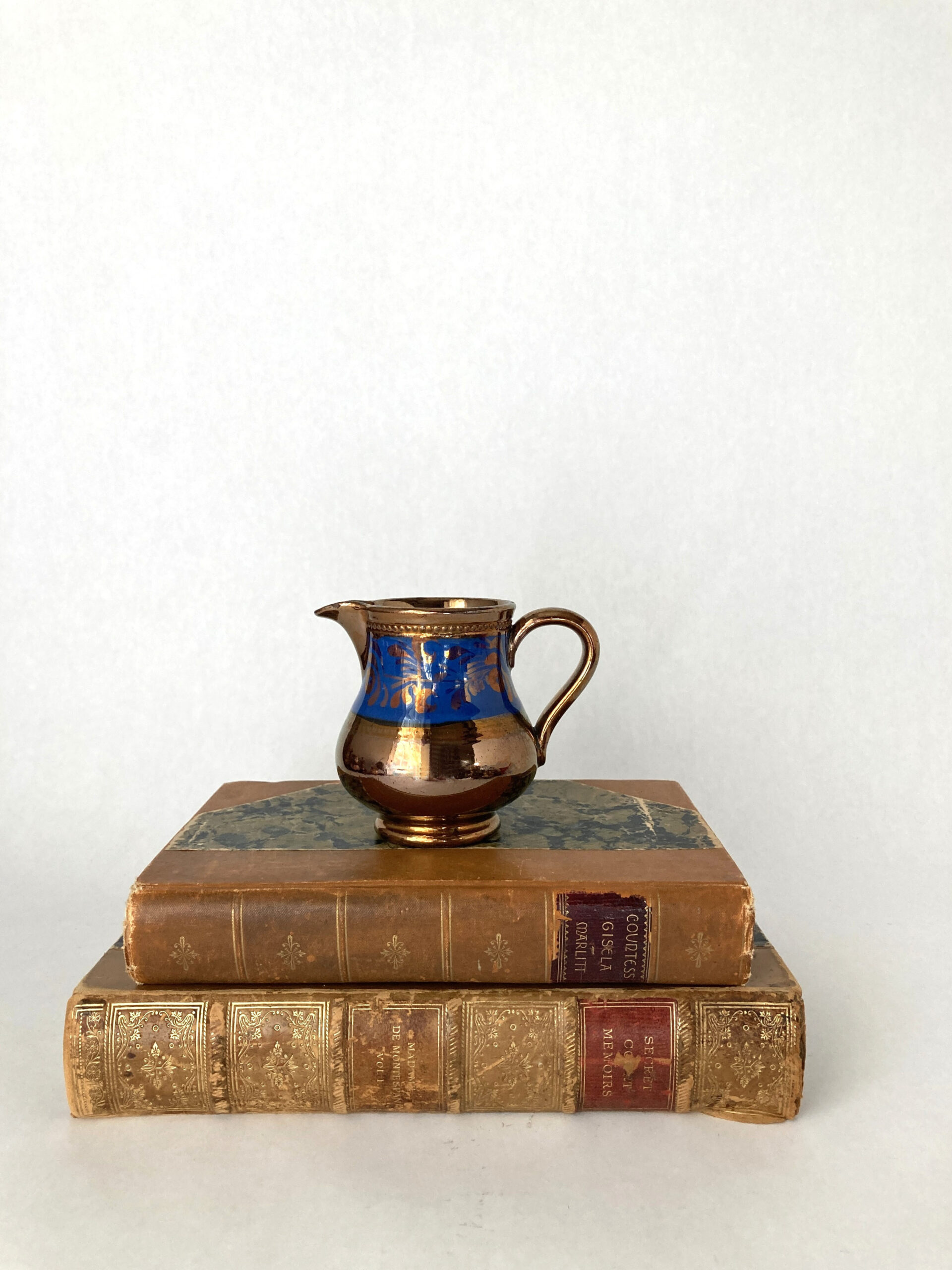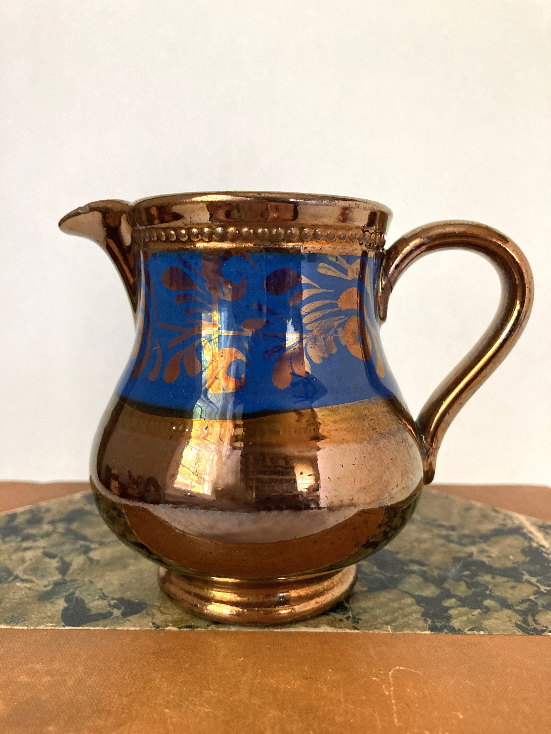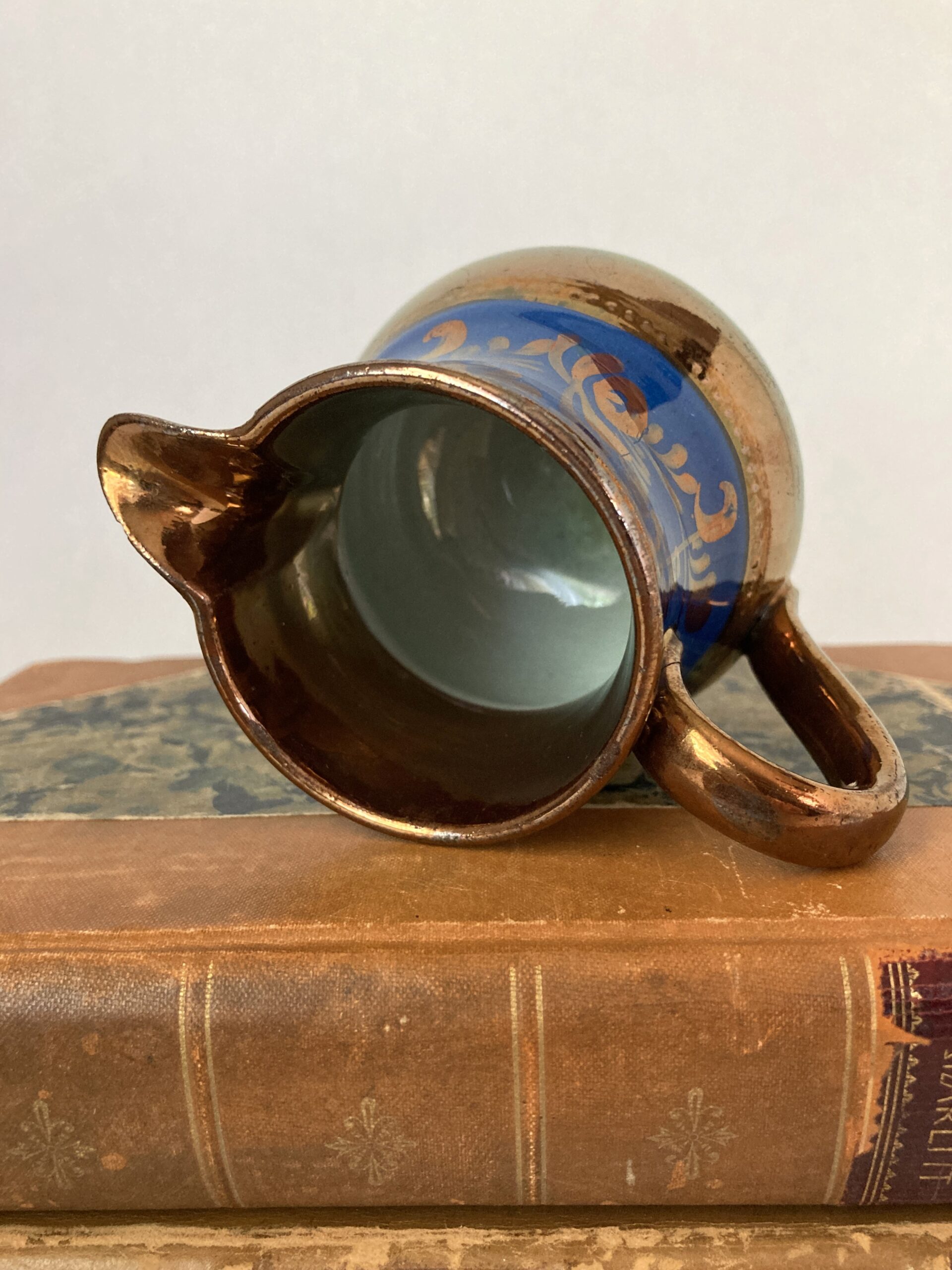 Vintage copper lusterware pitcher, small size, with cobalt blue designs and beaded detail at rim. Glazed interior, part white. Excellent preowned vintage condition; no chips or cracks. Not marked. Overall measurements are 3″ tall x 4″ spout to handle x 2-1/8″ diameter at rim. Widest point is about 2-7/8″. Not marked, but likely English. Lovely addition to a collection. Additional copper lusterware pieces are available in my shop–see last photo.