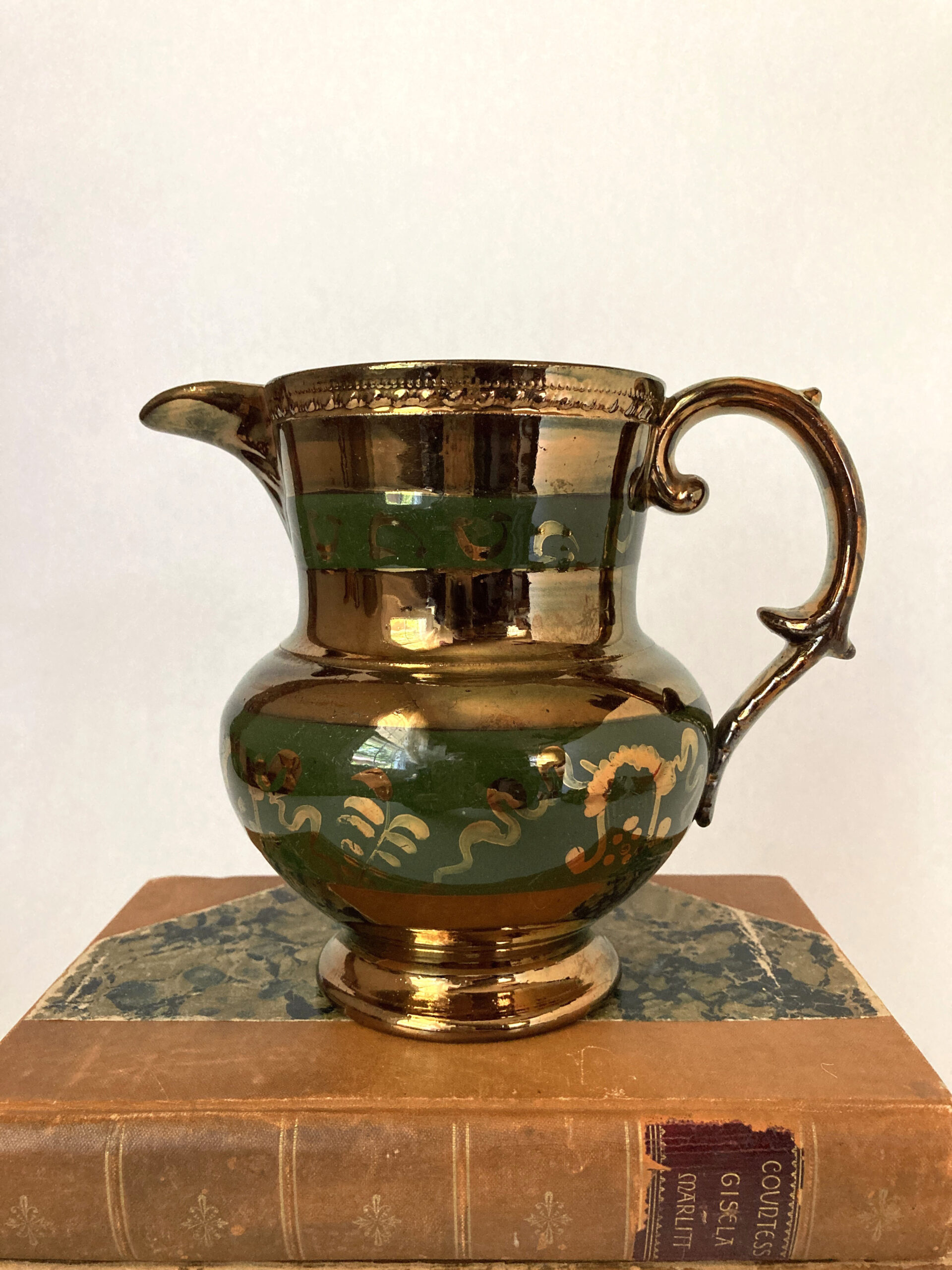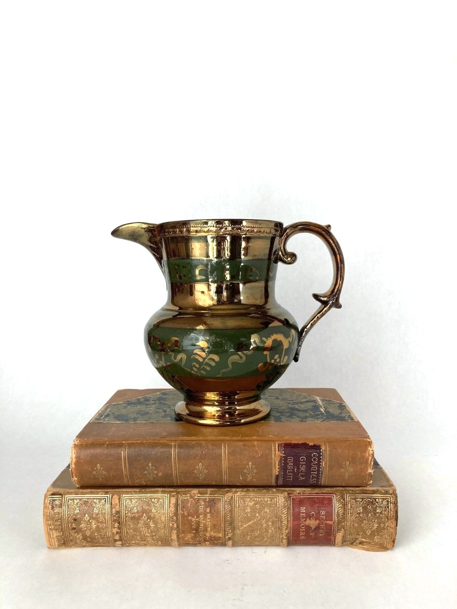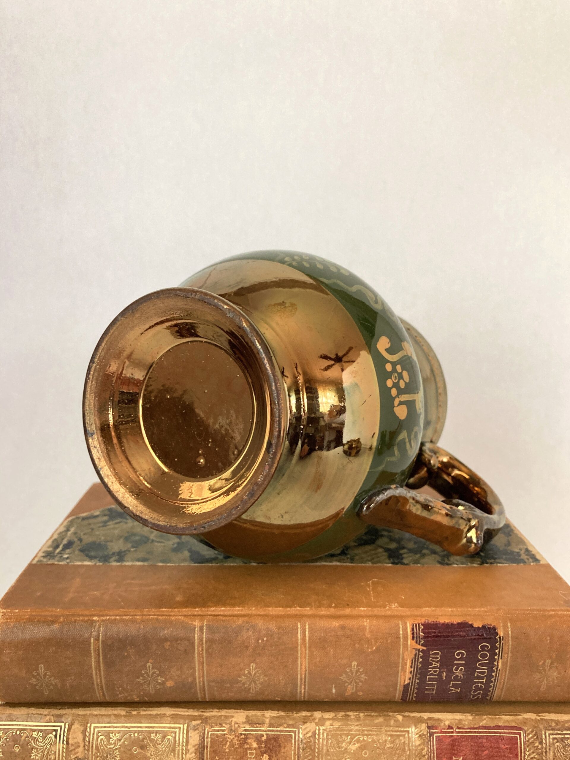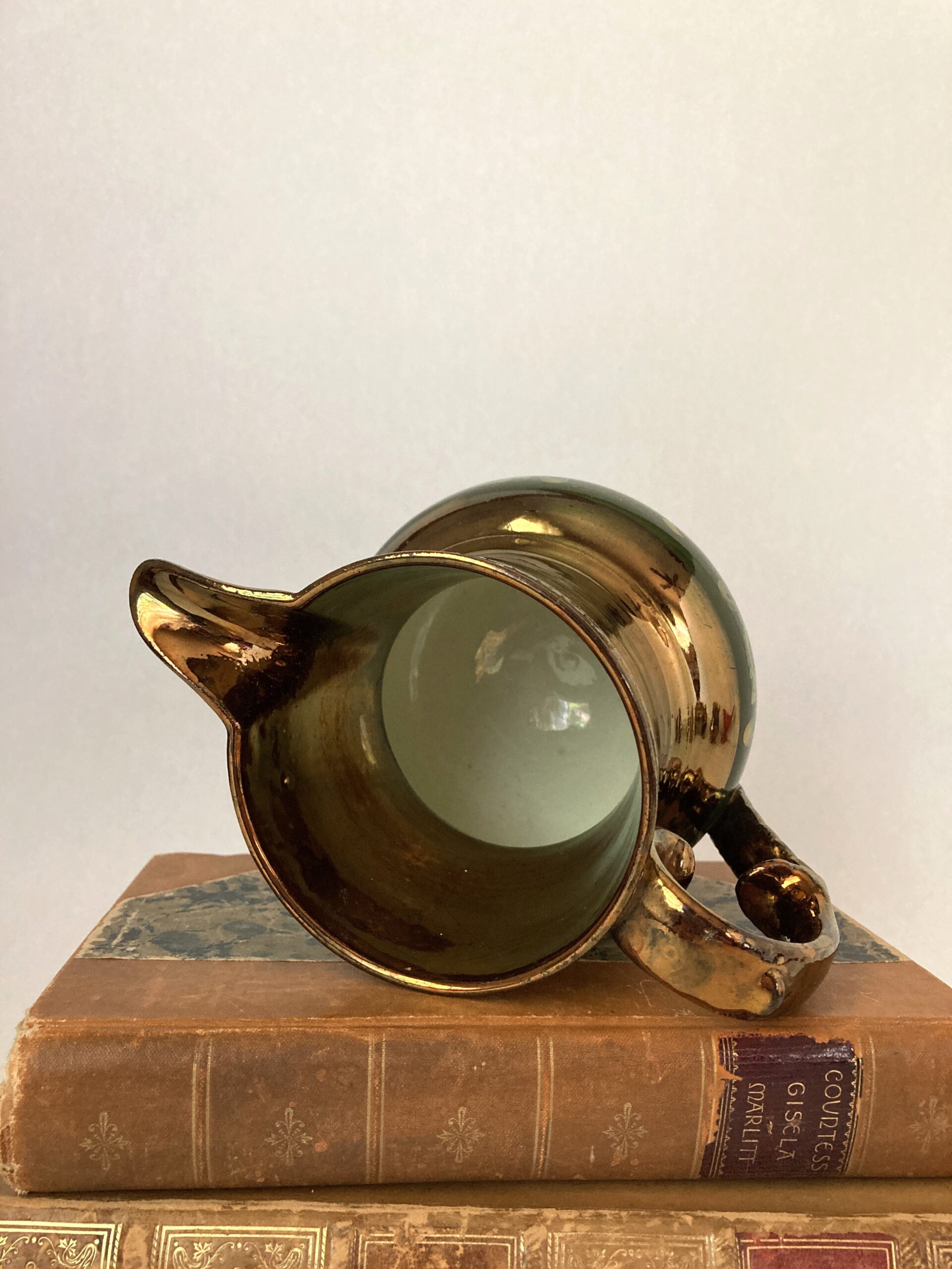 Vintage copper lusterware pitcher dark green bands creating an abstract design, and beaded detail at rim. Glazed interior, part white. Excellent preowned vintage condition; no chips or cracks. Not marked but likely English. Overall measurements are 5.5″ tall x 6.25″ spout to handle x 3.5″ diameter at rim. Lovely addition to a collection. Additional copper lusterware pieces are available in my shop–see last photo.