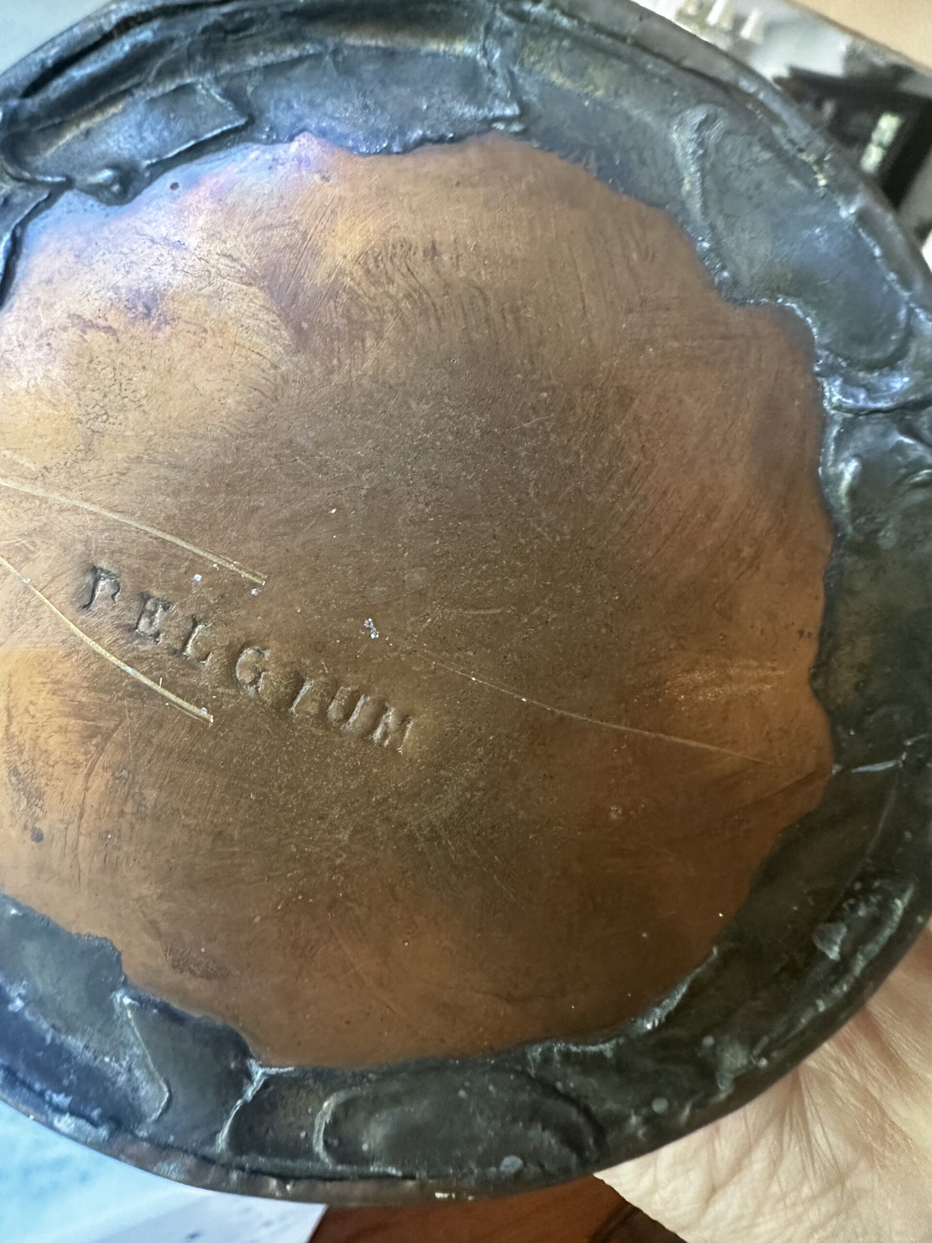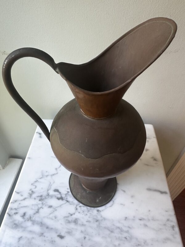 Copper pitcher from Belgium as inscribed on the bottom of the piece. Gorgeous vintage patina