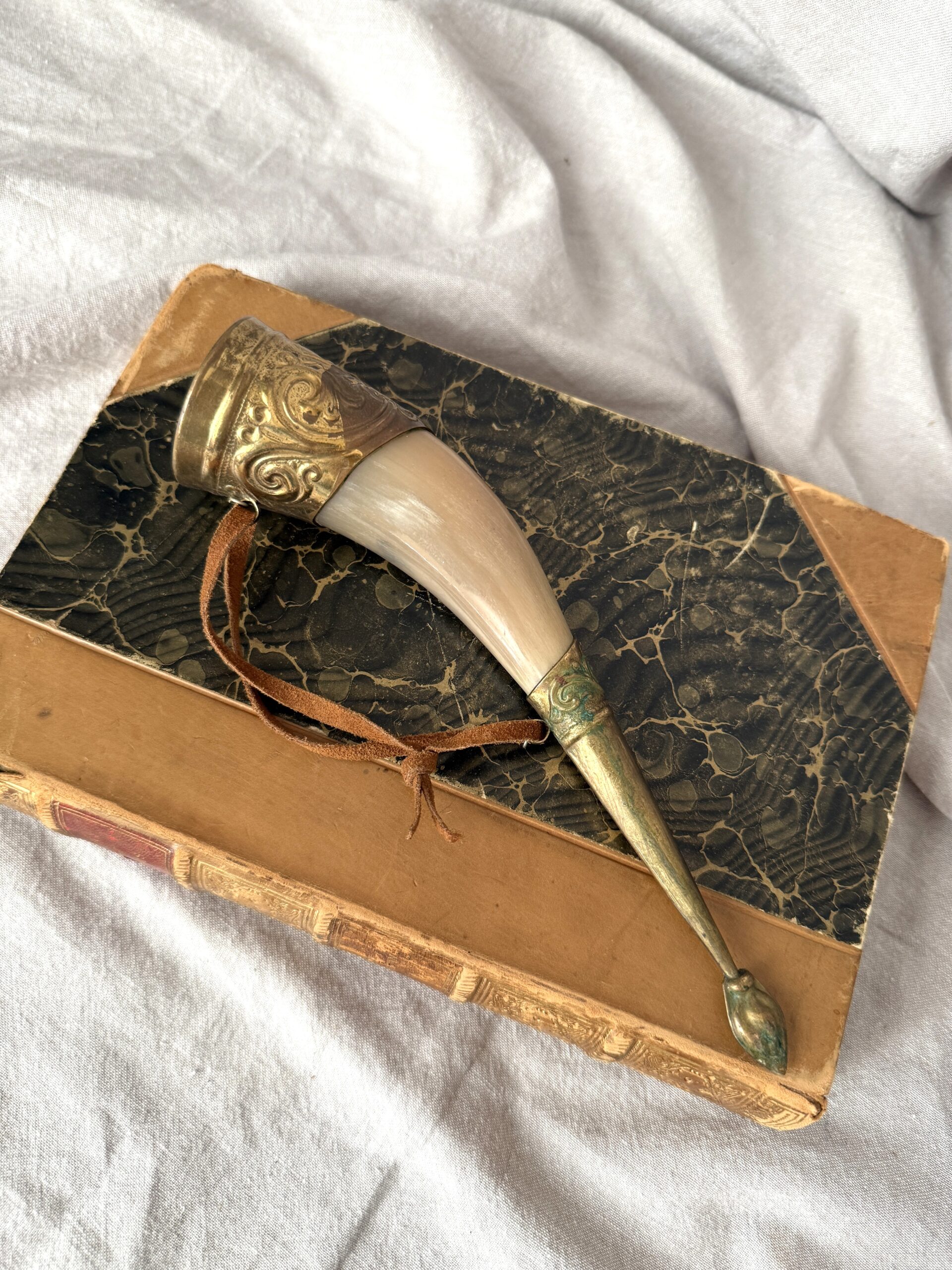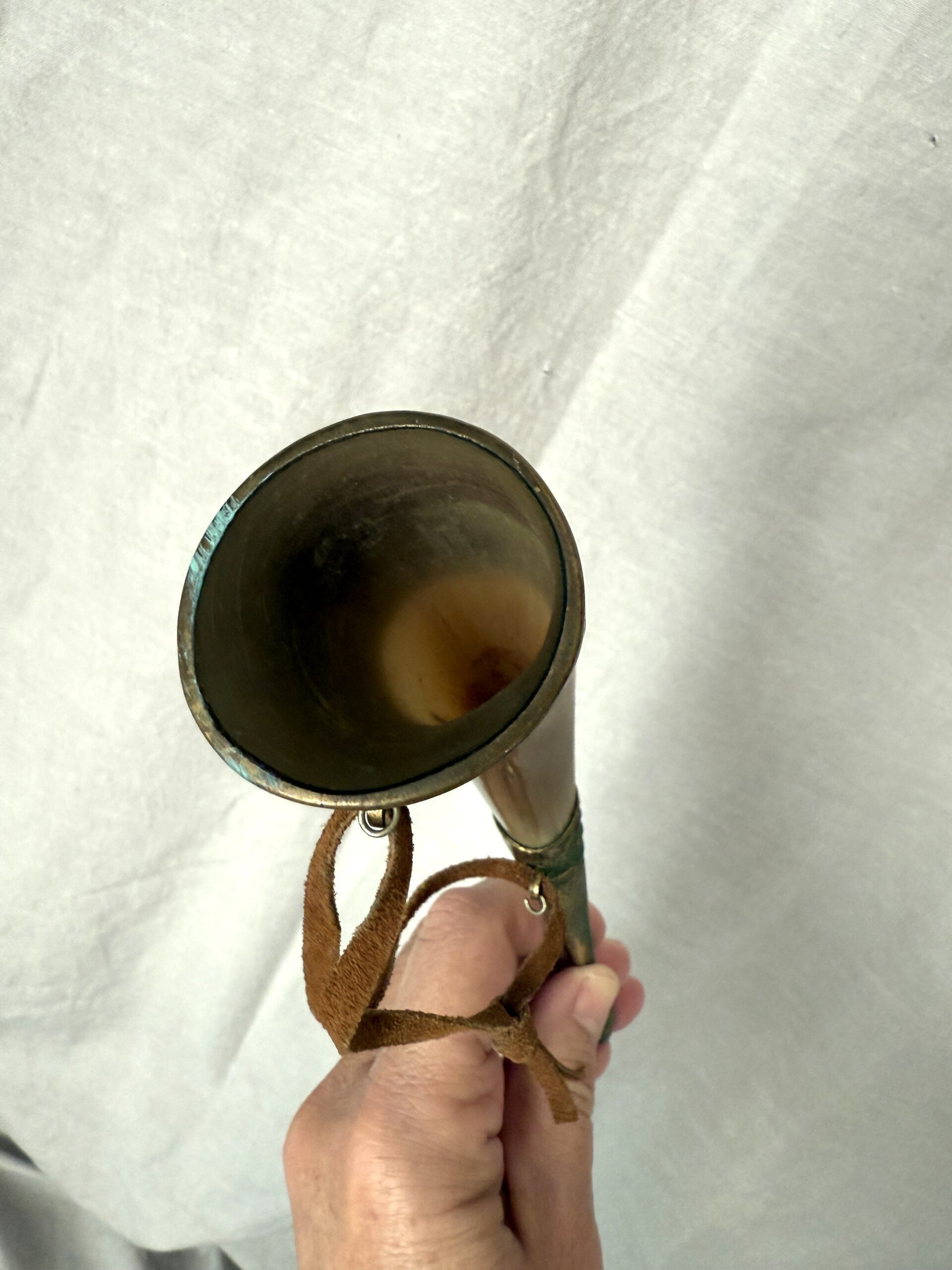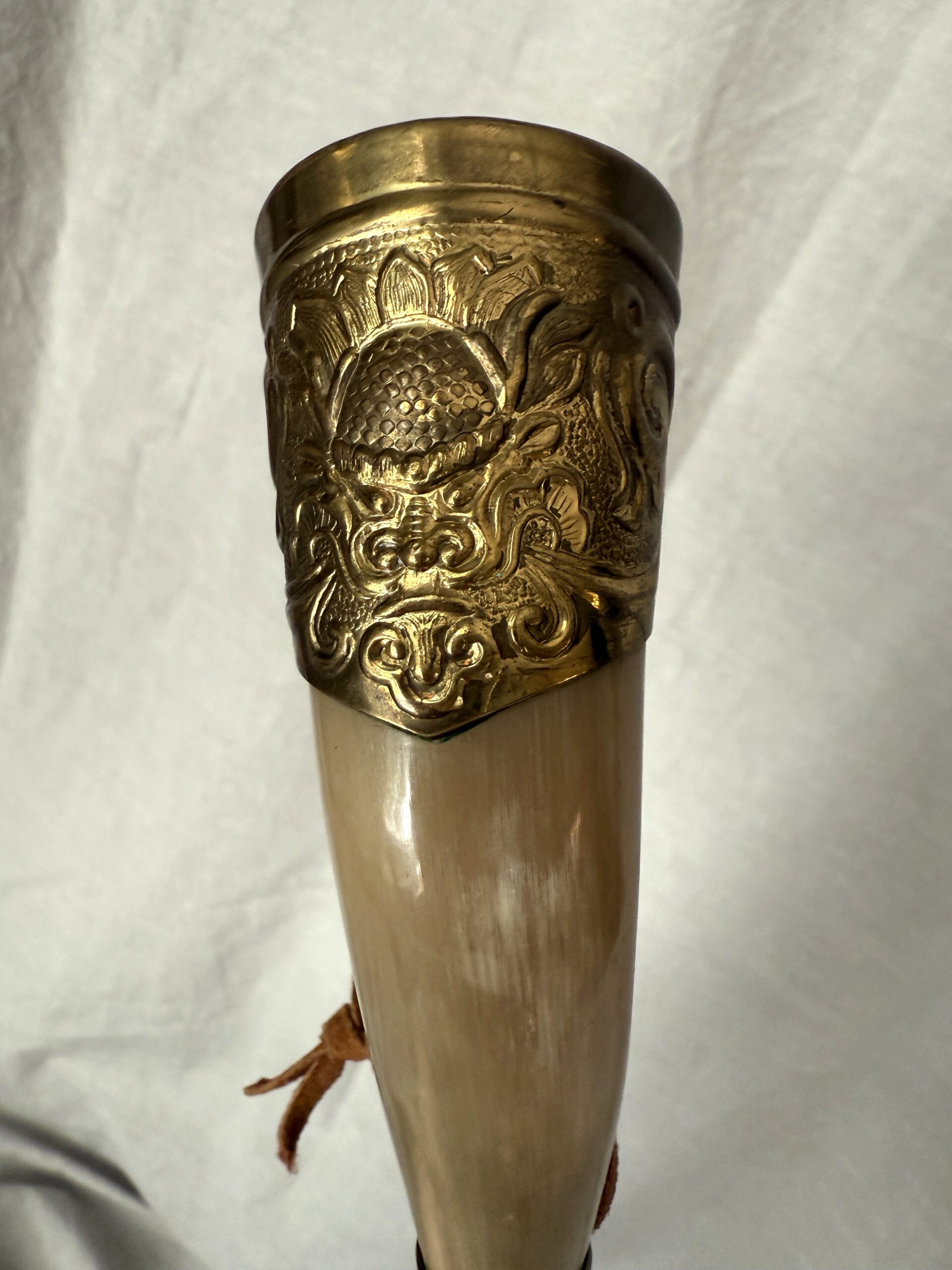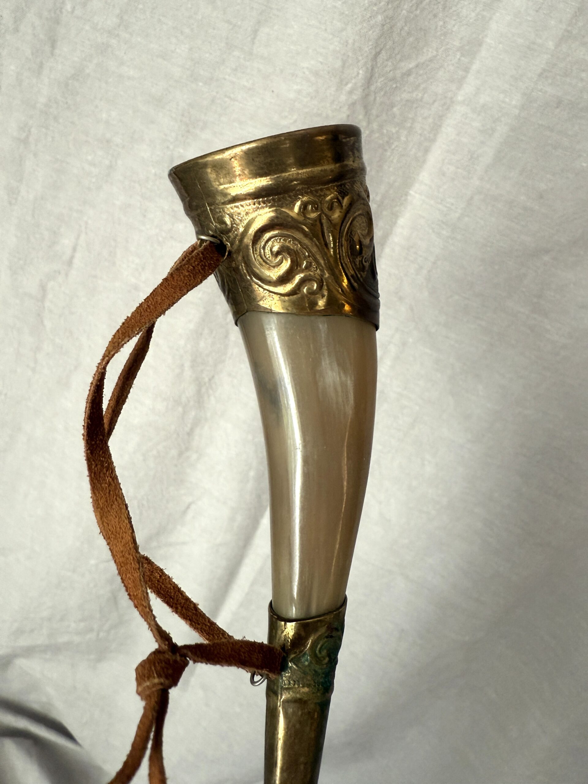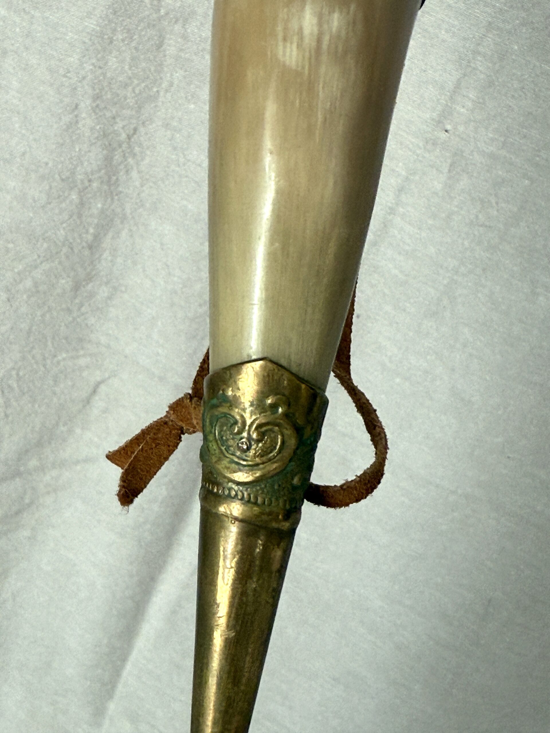 Vintage decorative drinking horn made from bovine horn with stamped metal embellishments. This piece comes from what is now the Republic of Georgia from the country’s time under Soviet rule. The metal features scrolls and a flower, perhaps a sunflower or a thistle. There is a suede thong for hanging, which likely replaced the original gold-color chain. The horn measures 8.25″ long x 1.75″ in diameter at the opening; measures along the curve, it’s 8.75″ long. Very good preowned vintage condition with minor verdigris tarnish. Great shelf-styling piece or addition to the gallery wall for a European rustic vibe.