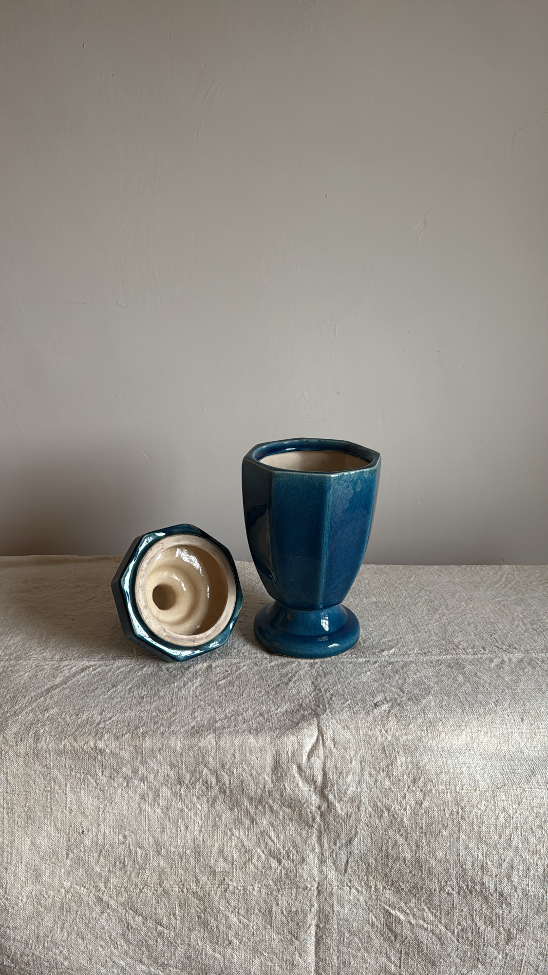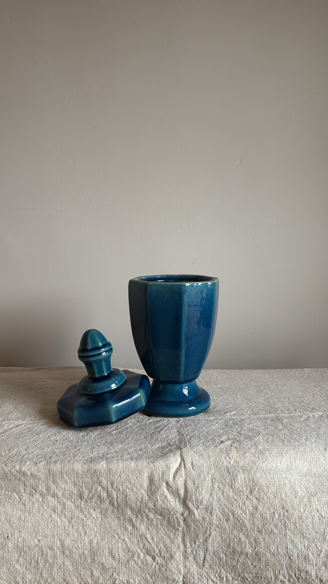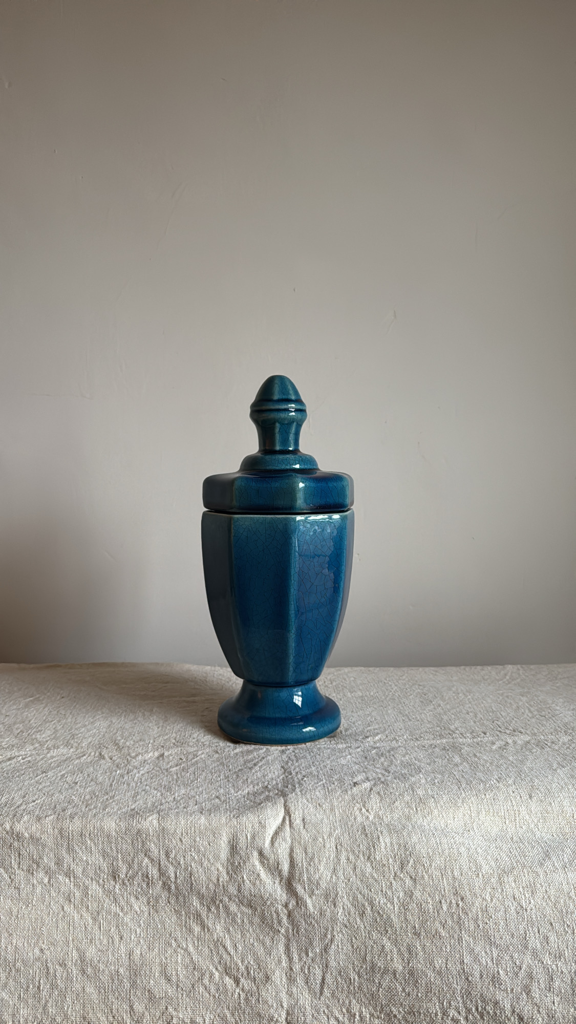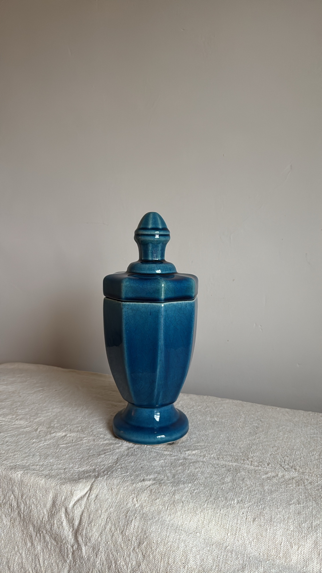 A striking vintage ceramic urn in a rich, deep blue glaze with subtle crackle detailing. Its classic silhouette and glossy finish make it a timeless statement piece—perfect for display on a mantel, shelf, or styled vignette. Elegant, sculptural, and full of quiet depth. In great condition and ready to use.