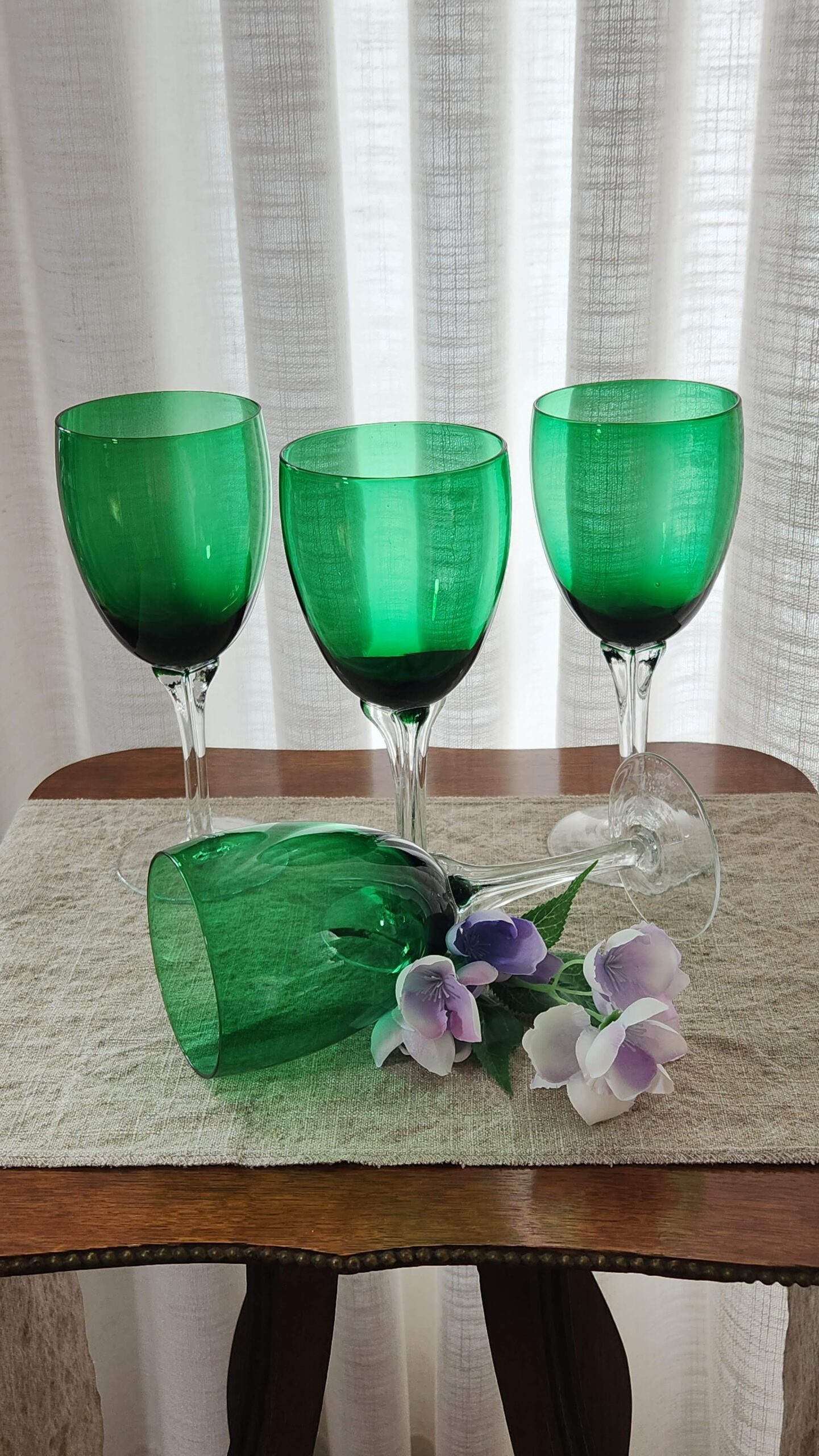 Vintage Emerald Green Goblets with Clear Stem – Set of Four