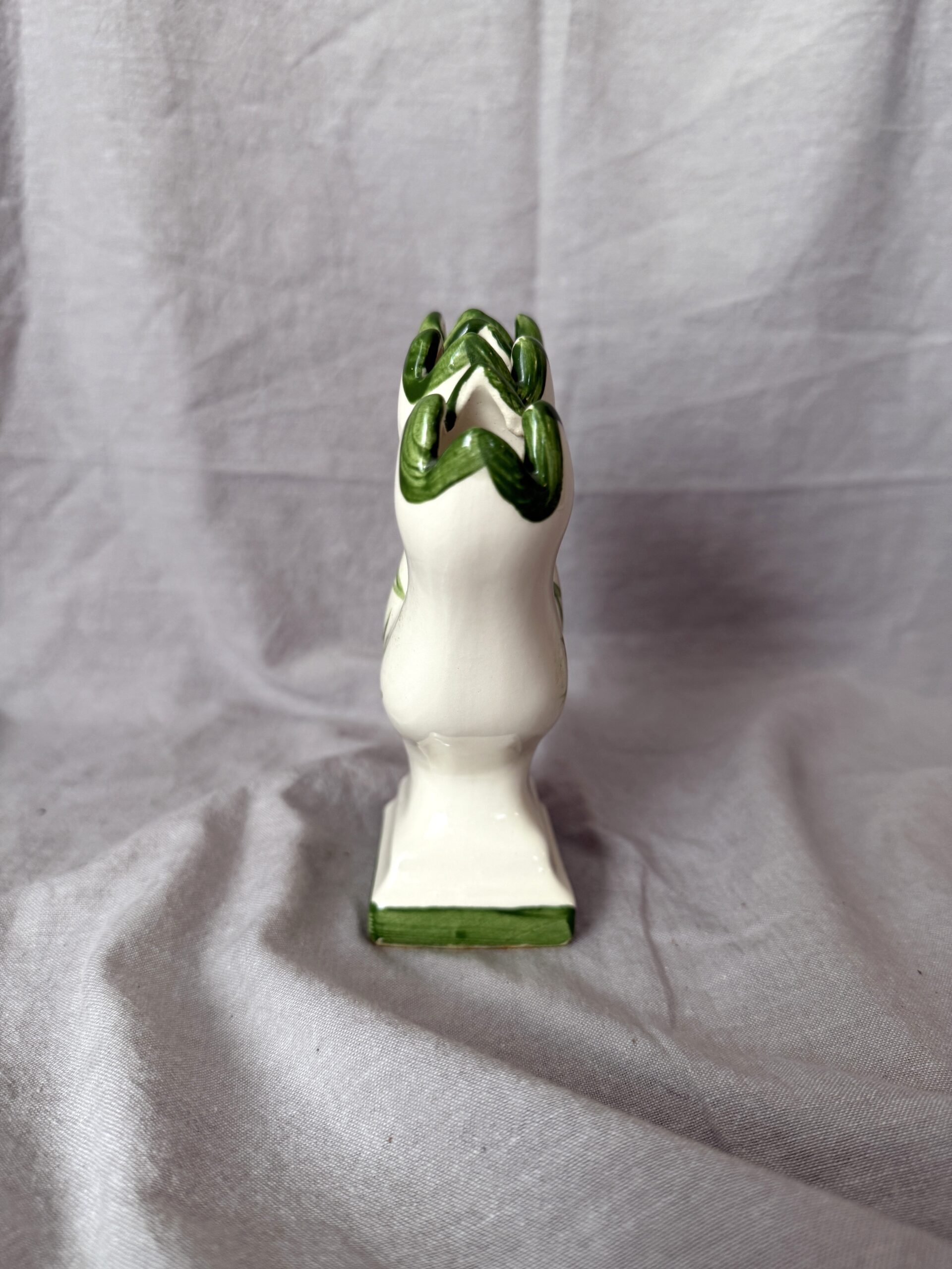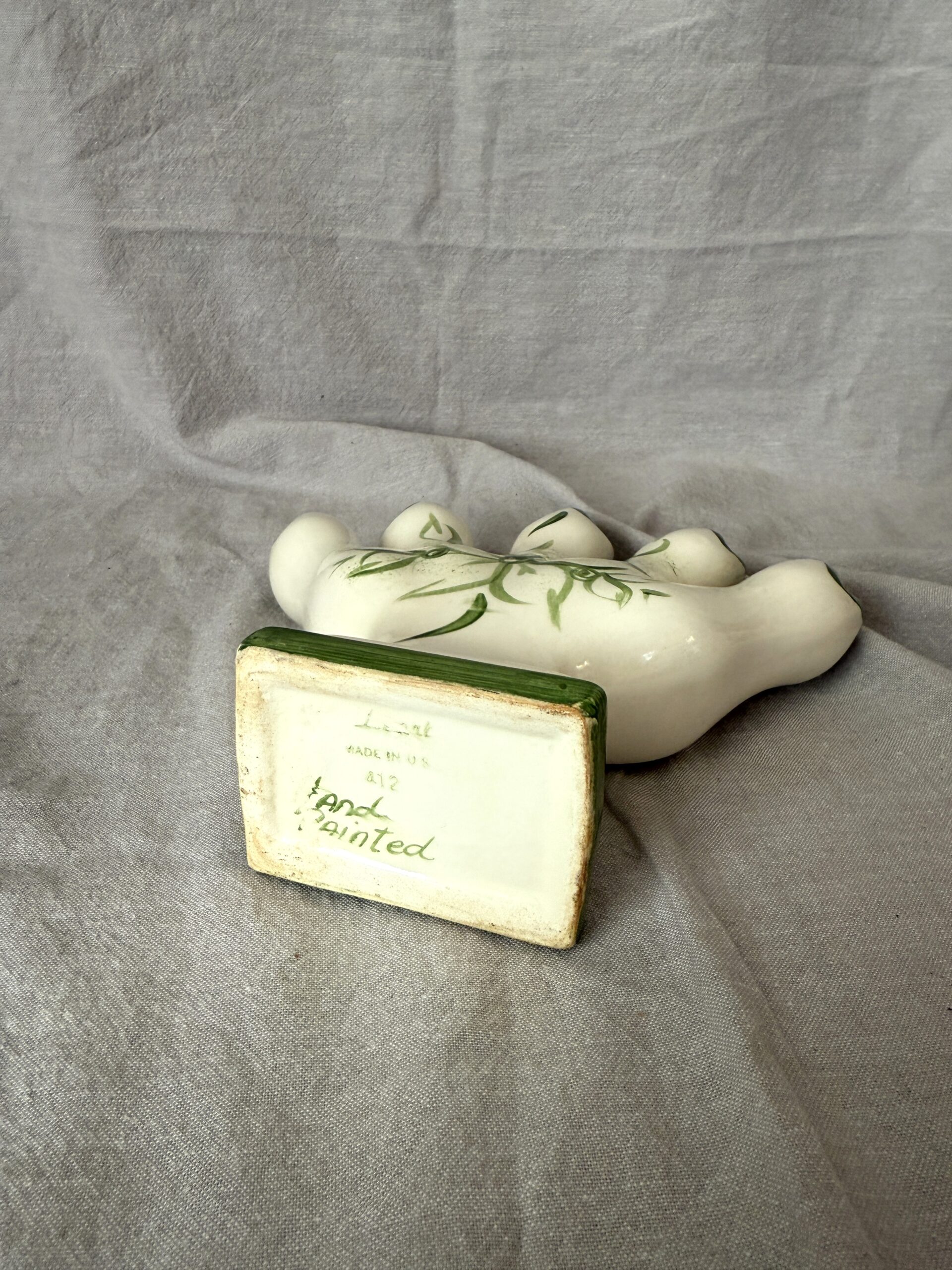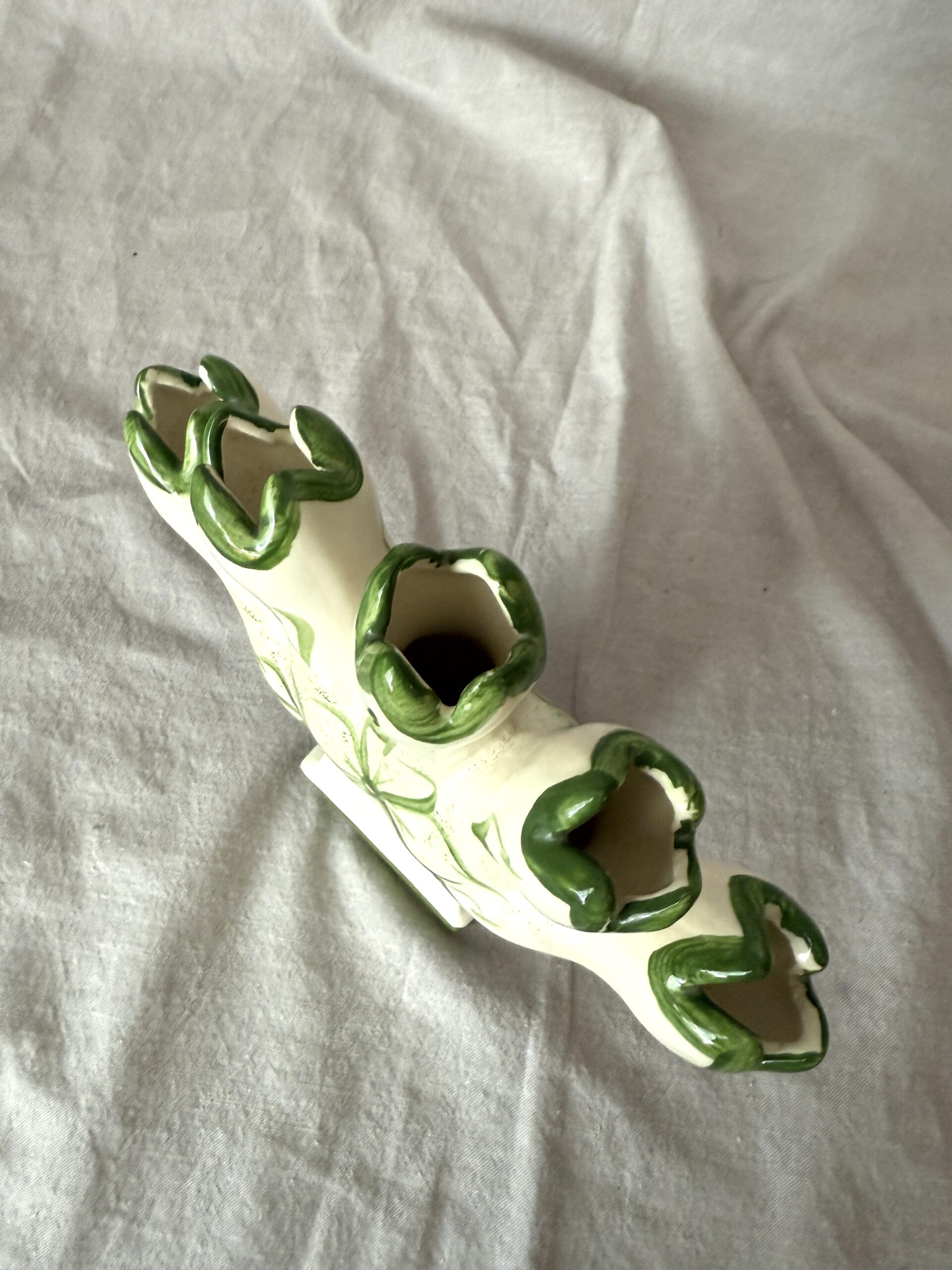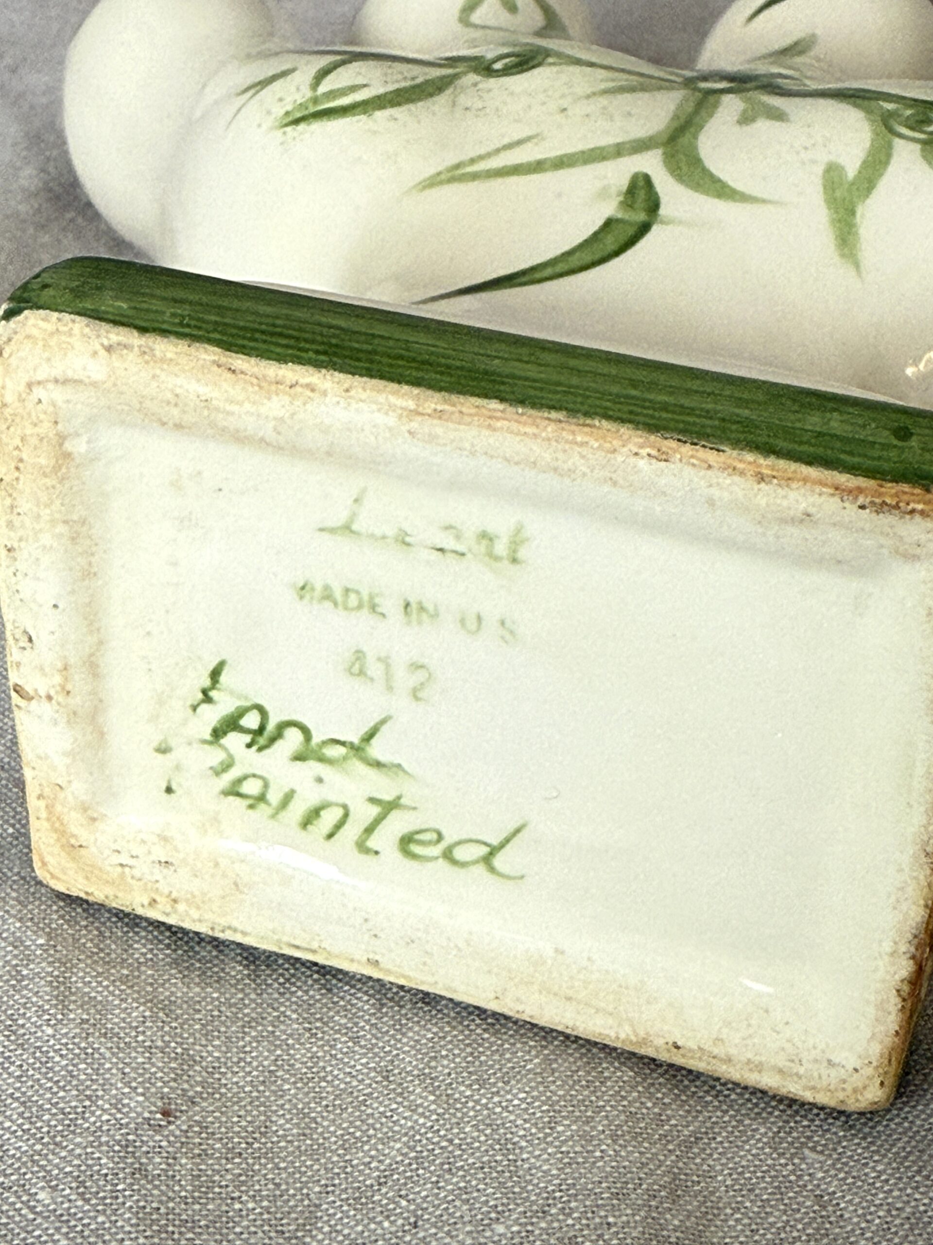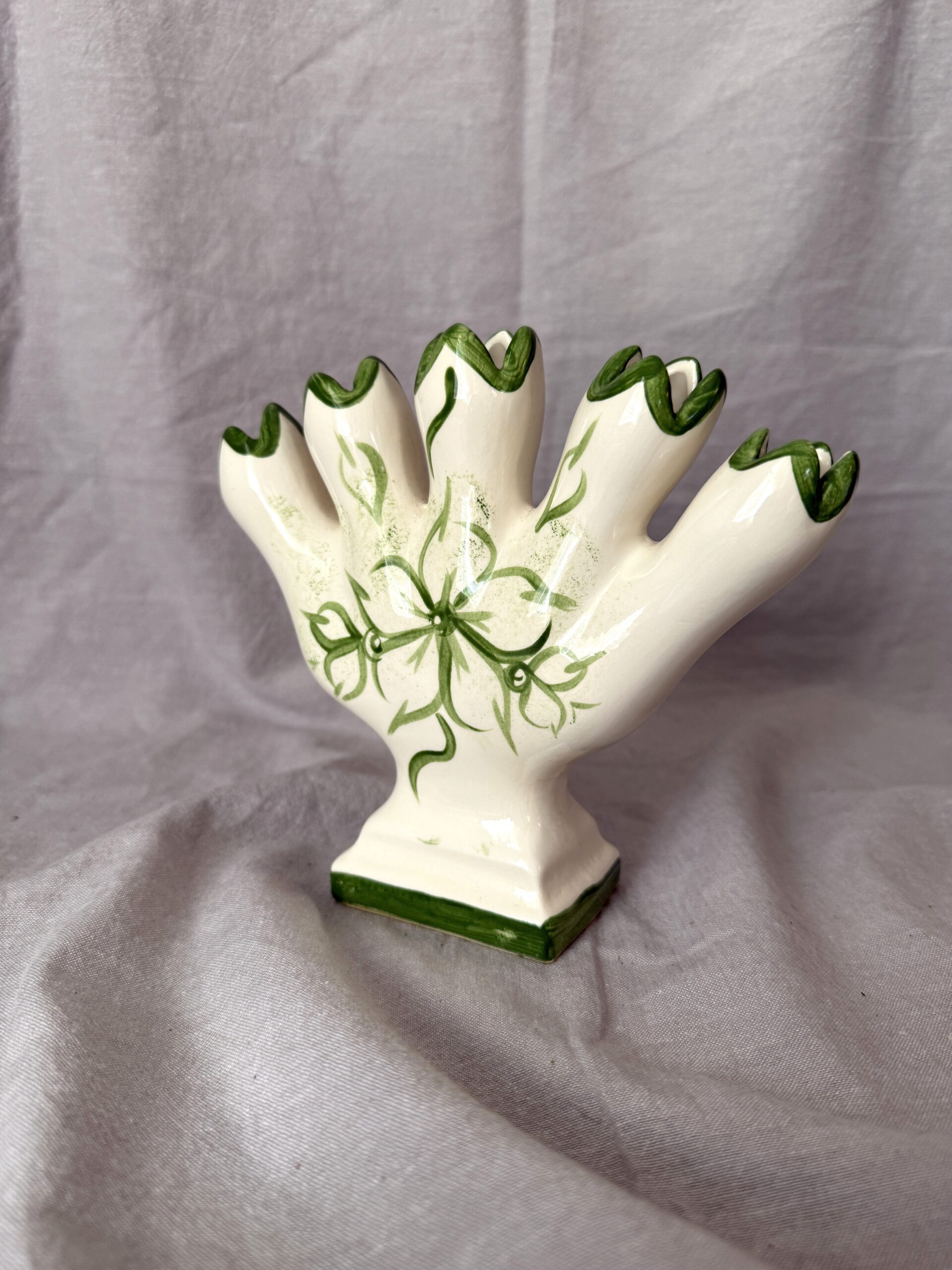 Vintage five-finger ceramic vase in creamy white with green embellishments, hand painted, made in USA, mark illegible. It measures 6.25″ tall x 7.25″ wide. Excellent preowned vintage condition. Great for tulips.