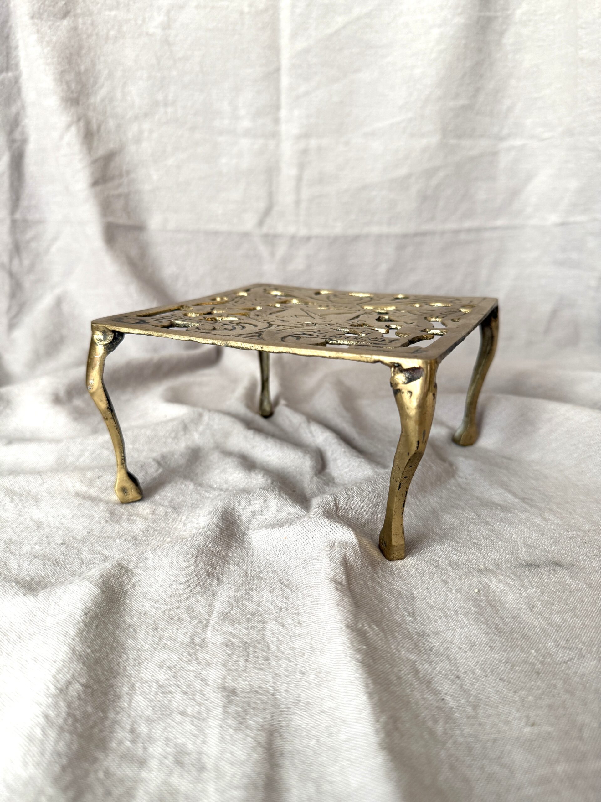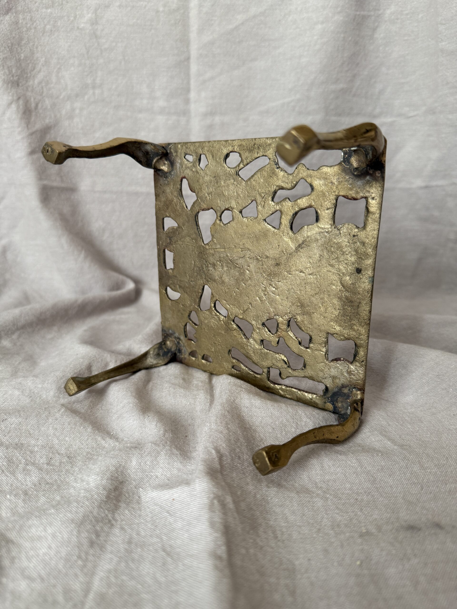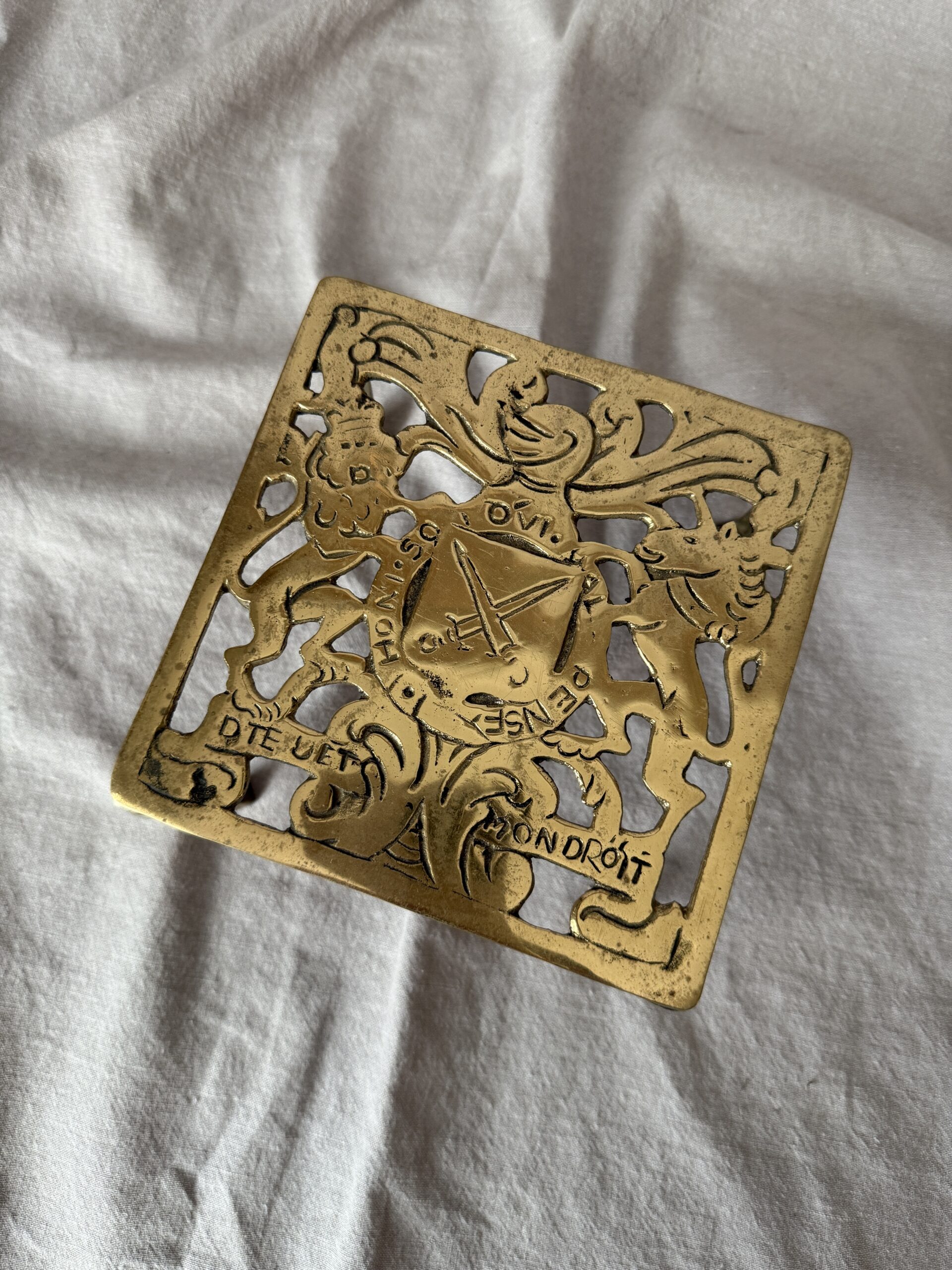 Vintage footed brass trivet featuring a version of the royal coat of arms of the United Kingdom, with the Old Norman French mottoes of English monarchs, “Dieu et mon droit” [God and My Right], and of the Order of the Garter, “Honi soit qui mal y pense” [Shame on him who thinks evil of it], featuring the lion and unicorn.  The trivet measures 5-5/8 square x 3.25″ tall and is in excellent preowned vintage condition.  Great gift for the Anglophile, riser for shelf styling, as a kettle stand, etc.