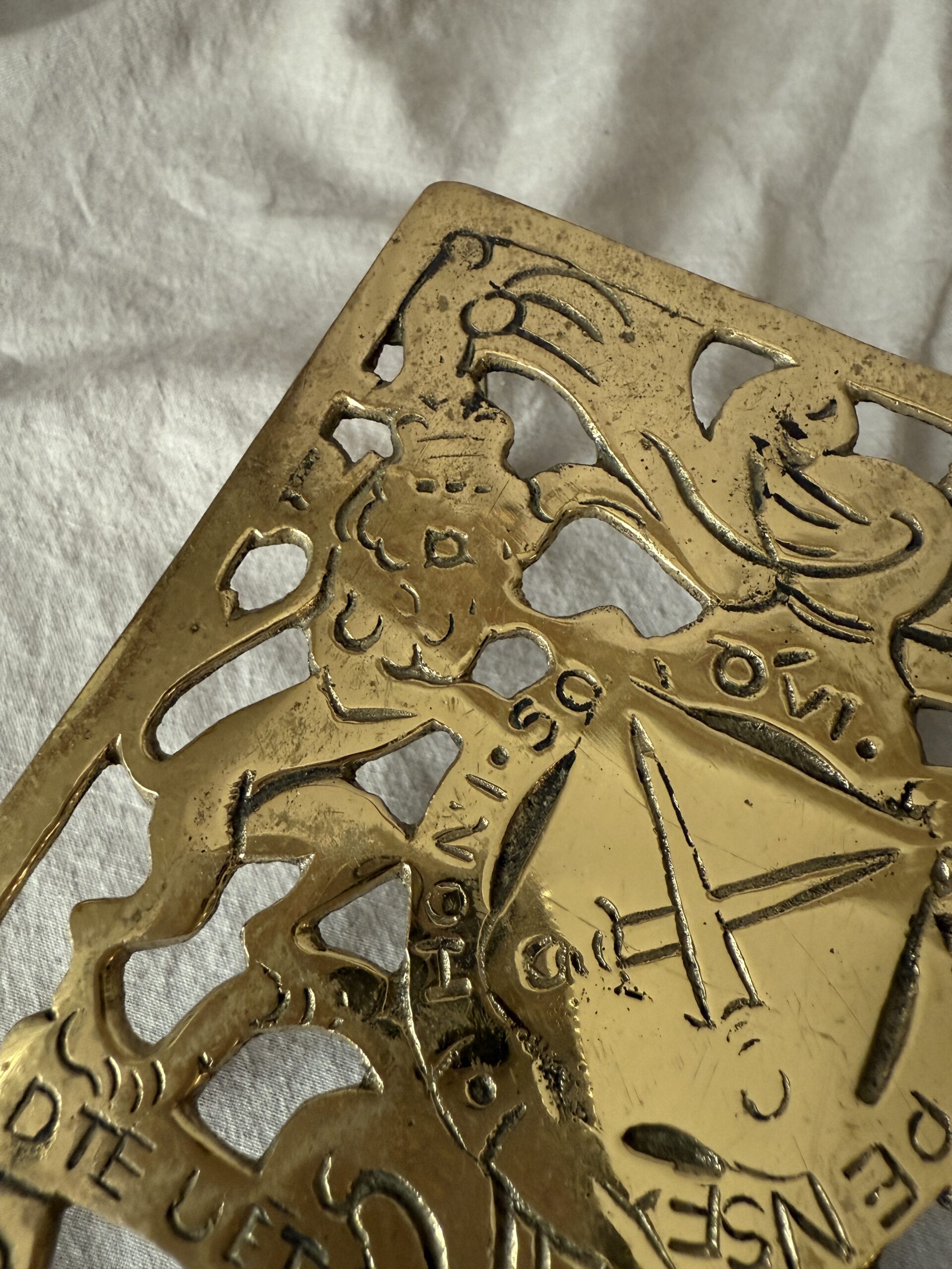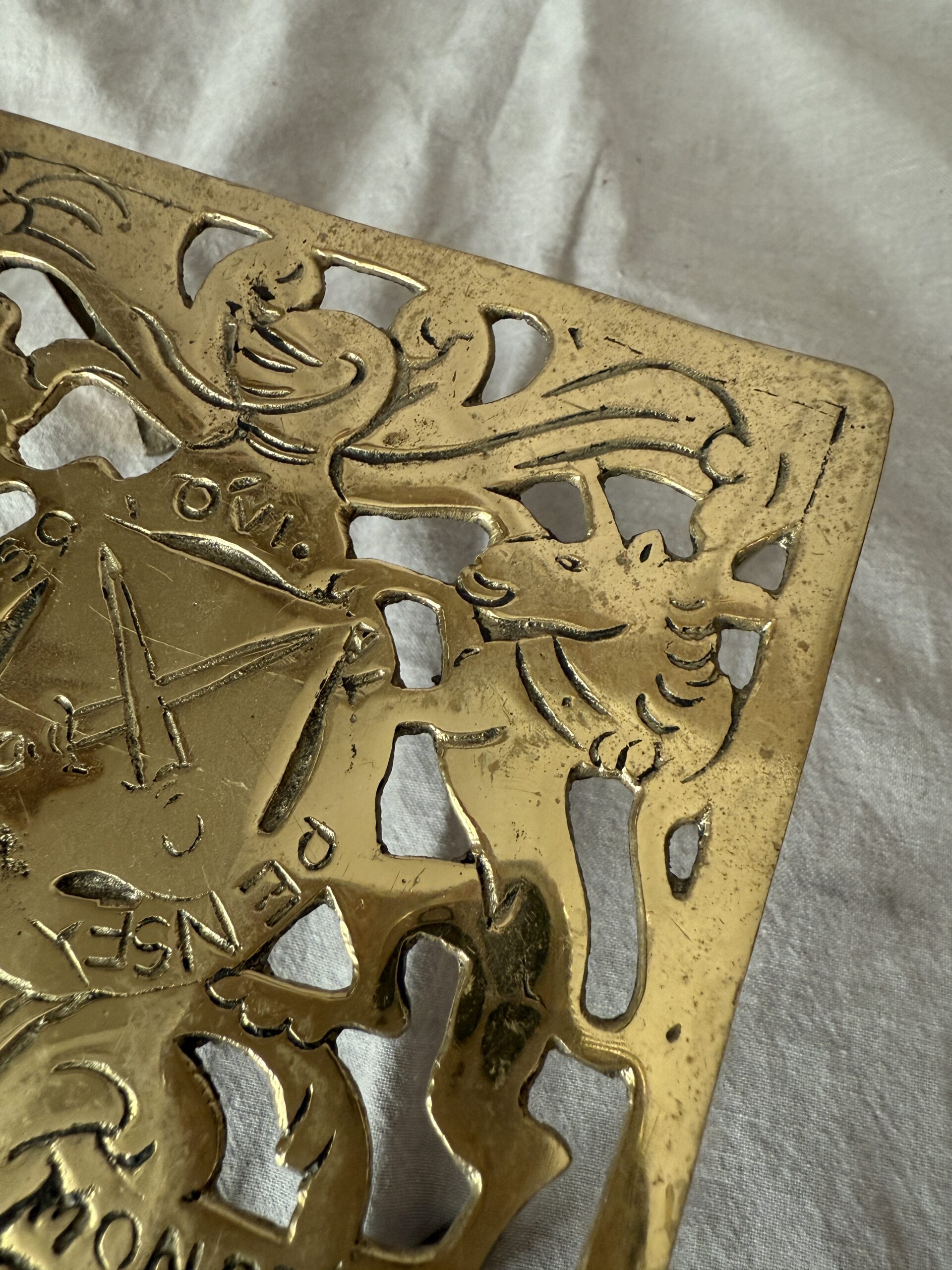 Vintage Footed Brass Trivet with Mottoes of British Monarchs and Order of the Garter Lion and Unicorn 5-5/8″ Square