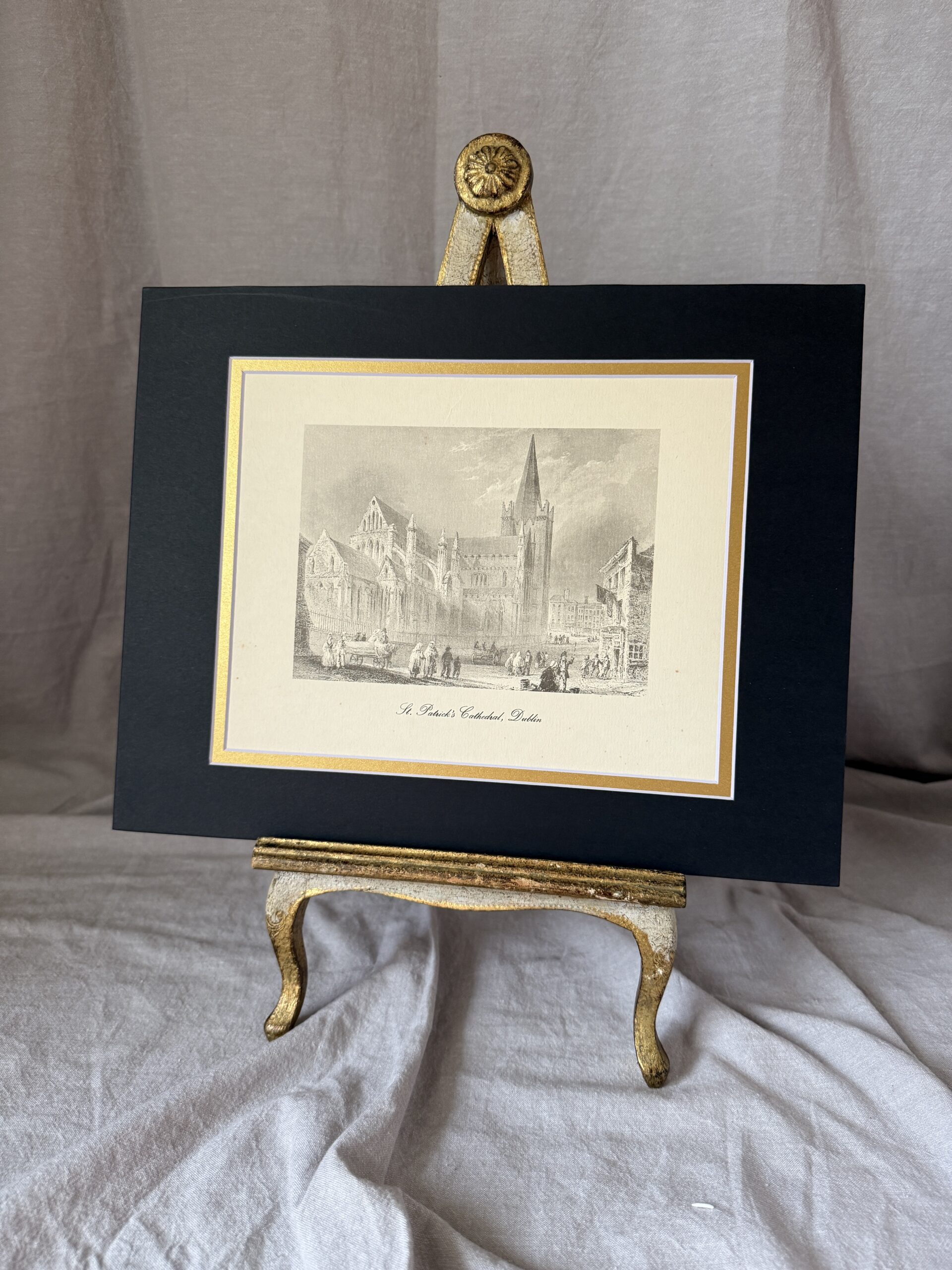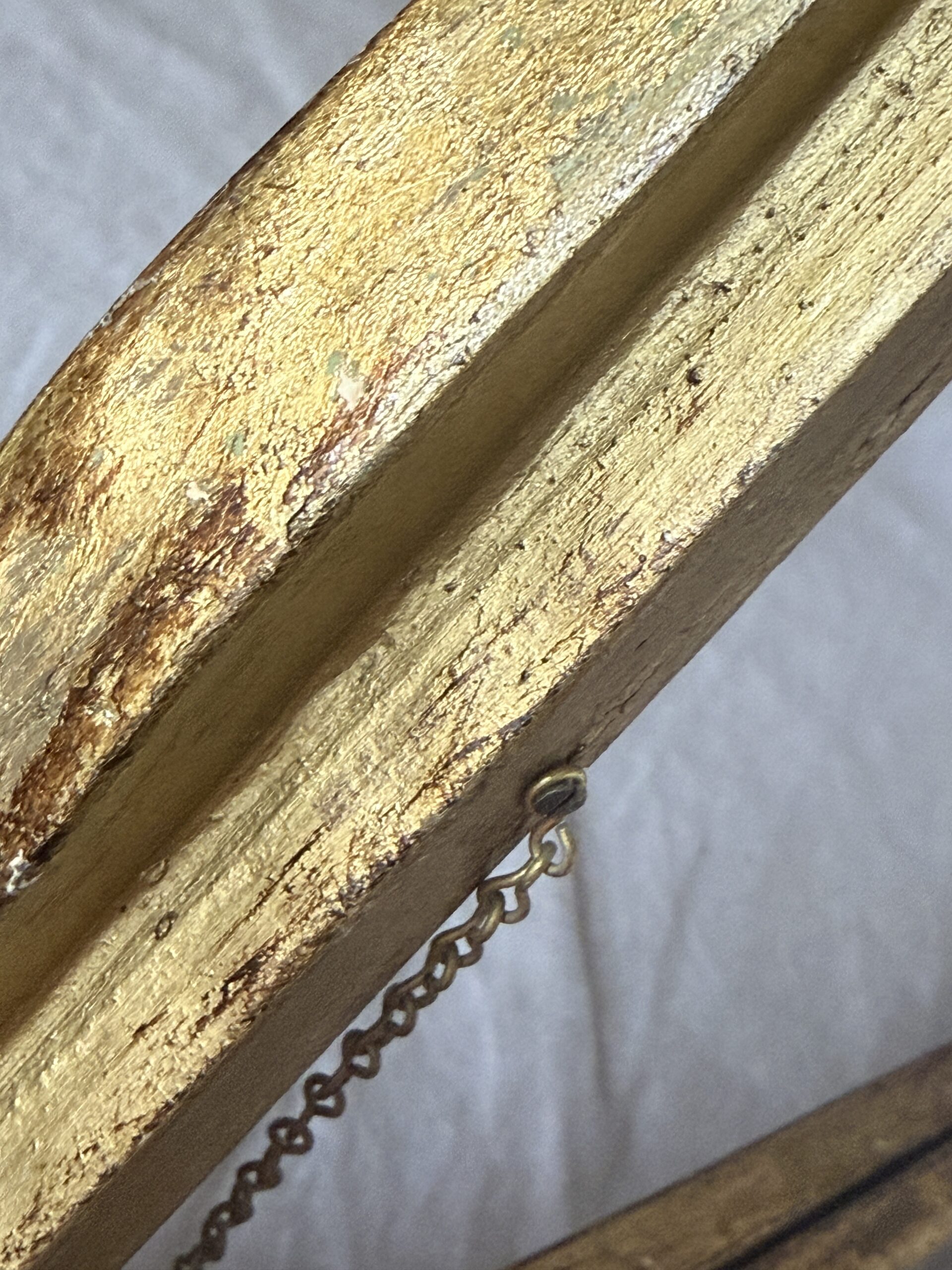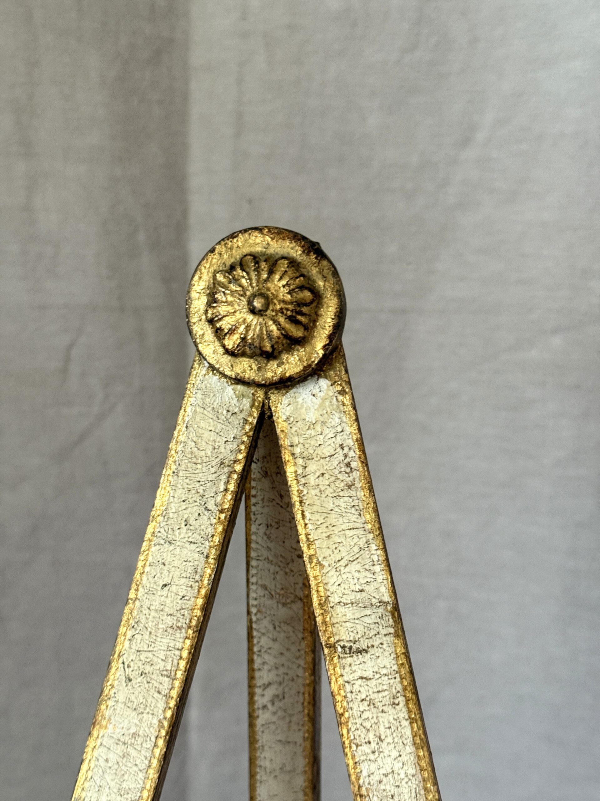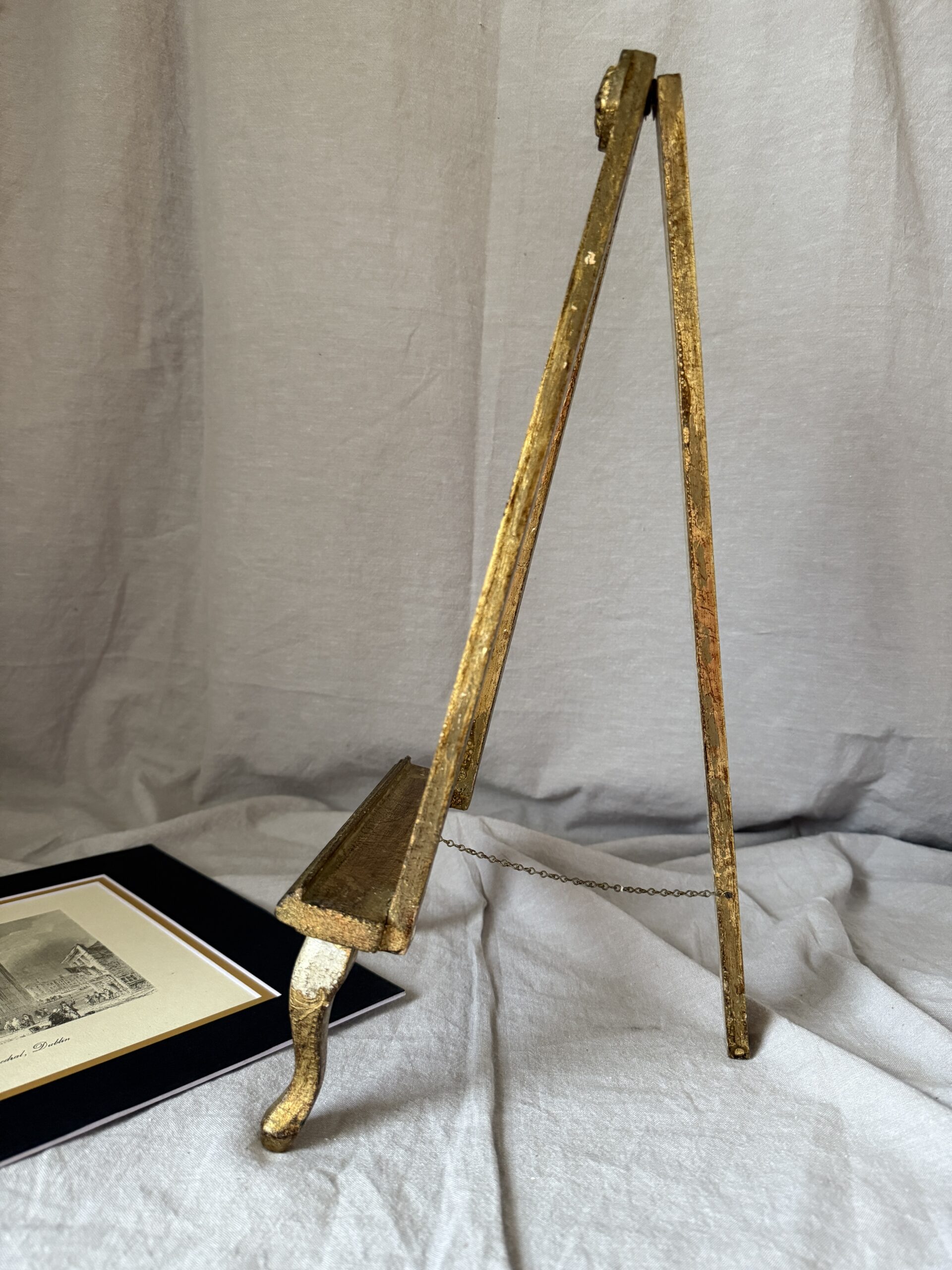 Vintage Florentine wooden easel with gilded finish. It measures 17.75″ x 8-1/8″; the “ledge” where the art would rest is 1-1/8″ deep. For reference, the print shown in the second image measures 14″ x 11″ (not included). Marked “Made in Italy” on the underside; almost illegible. Very good preowned vintage condition.