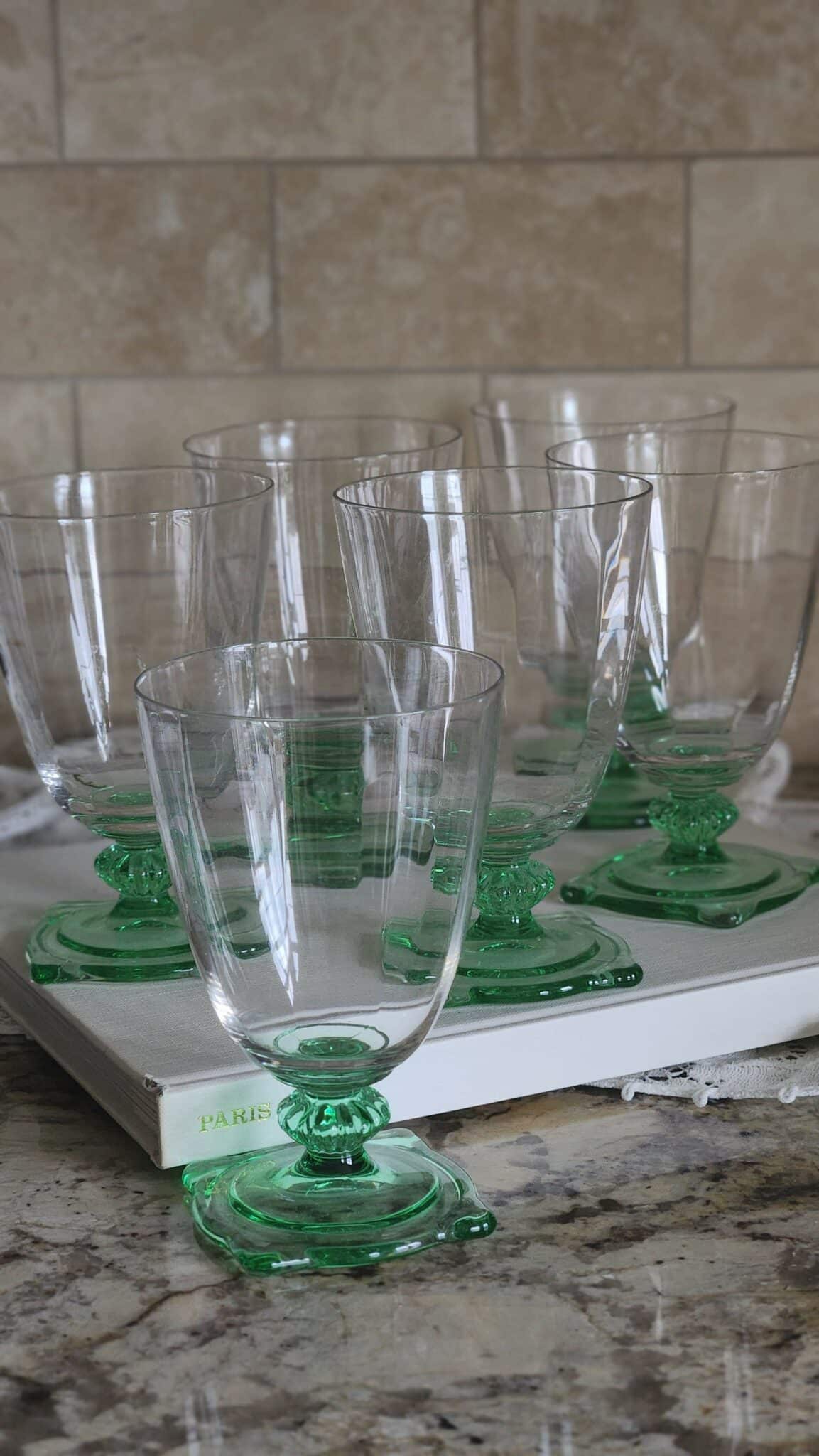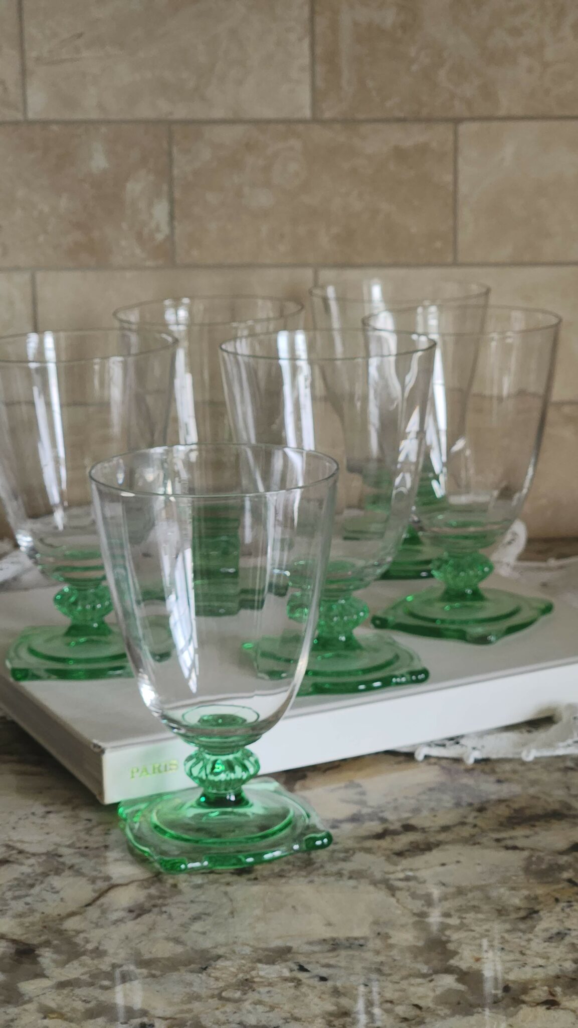 Square Base Green Stemware – Set of Six base 2 3/4″ x 5 1/4″ x 3 1/2″ wide Excellent Condition Perfect for your summer table!