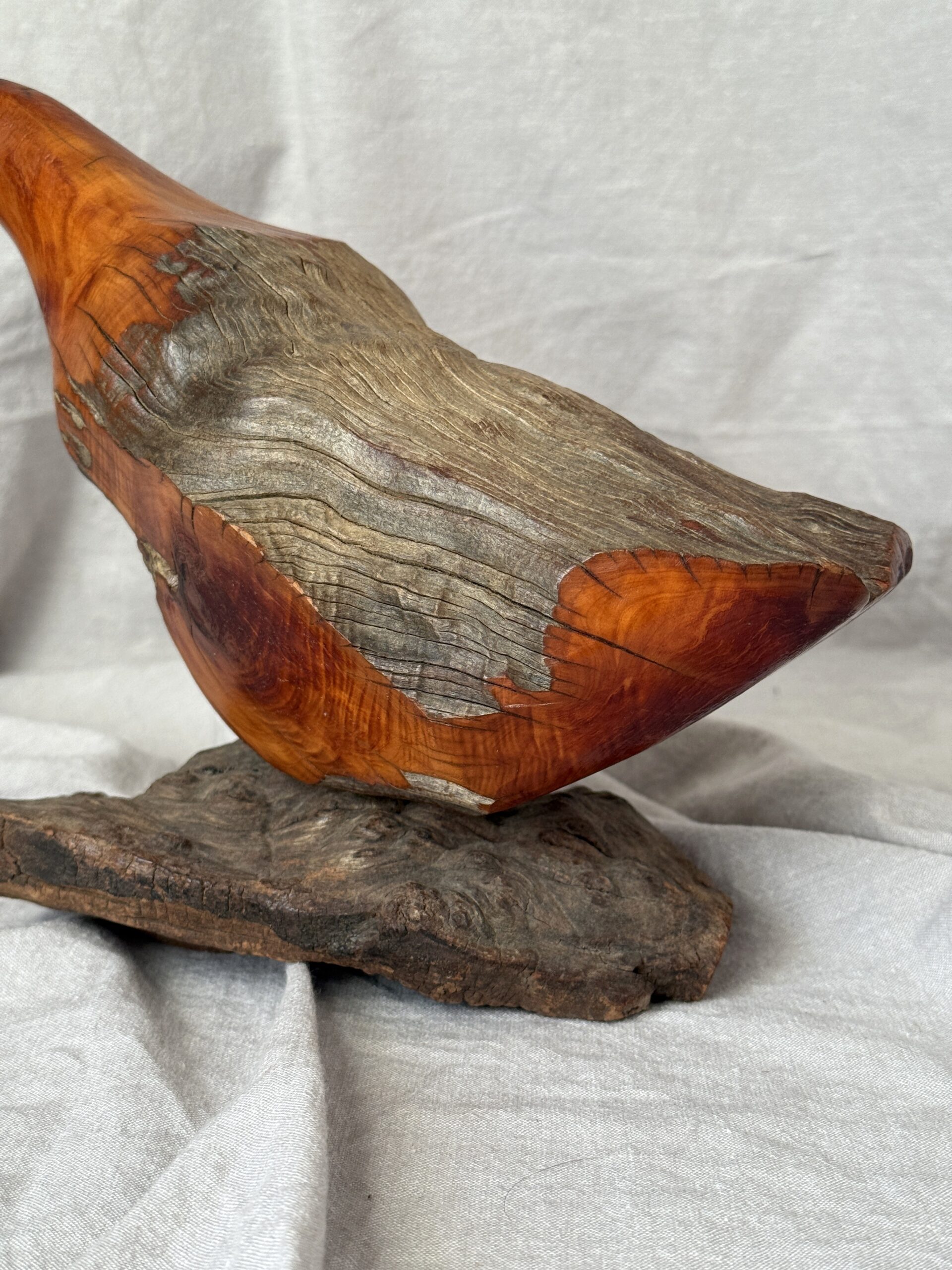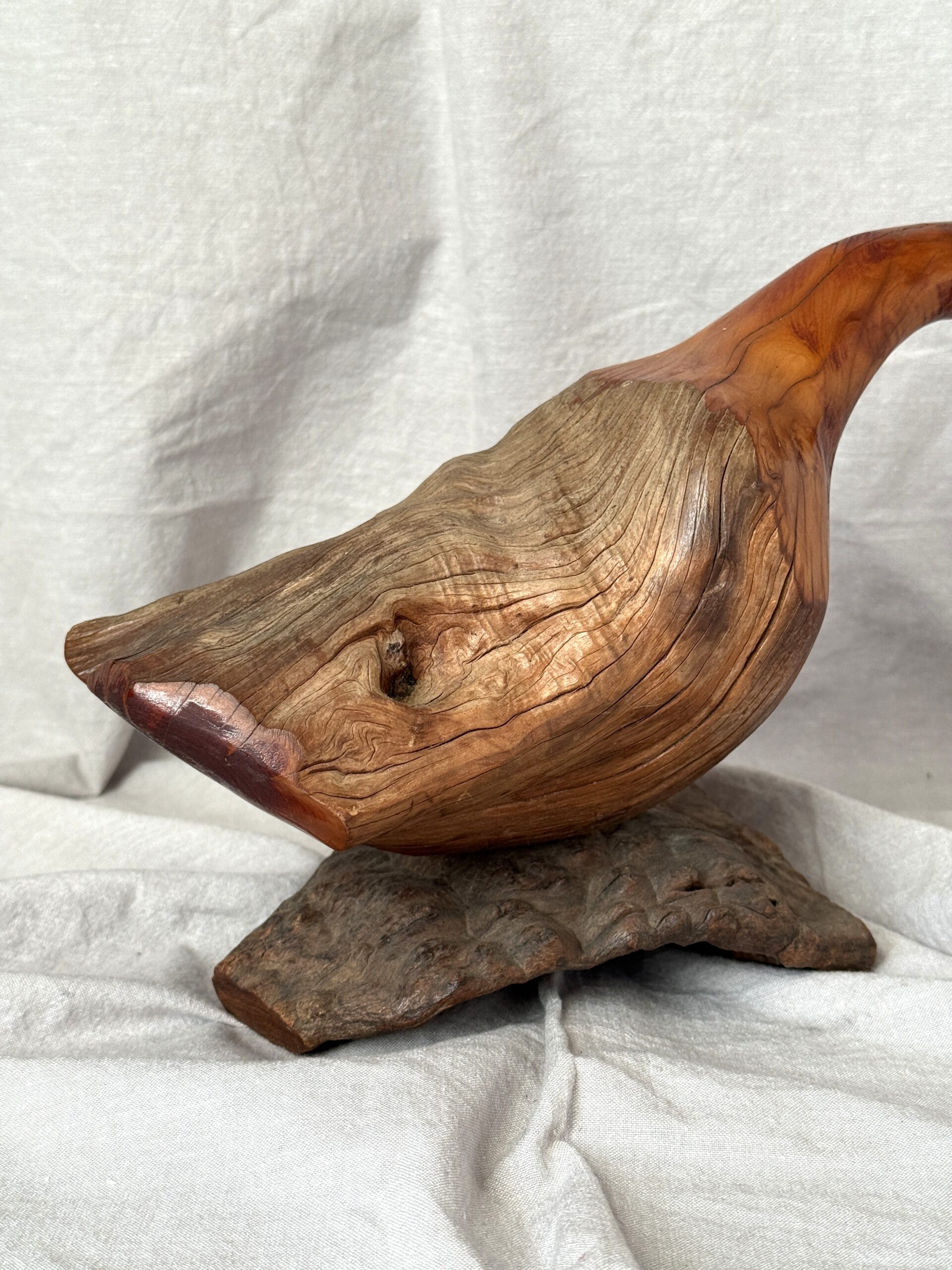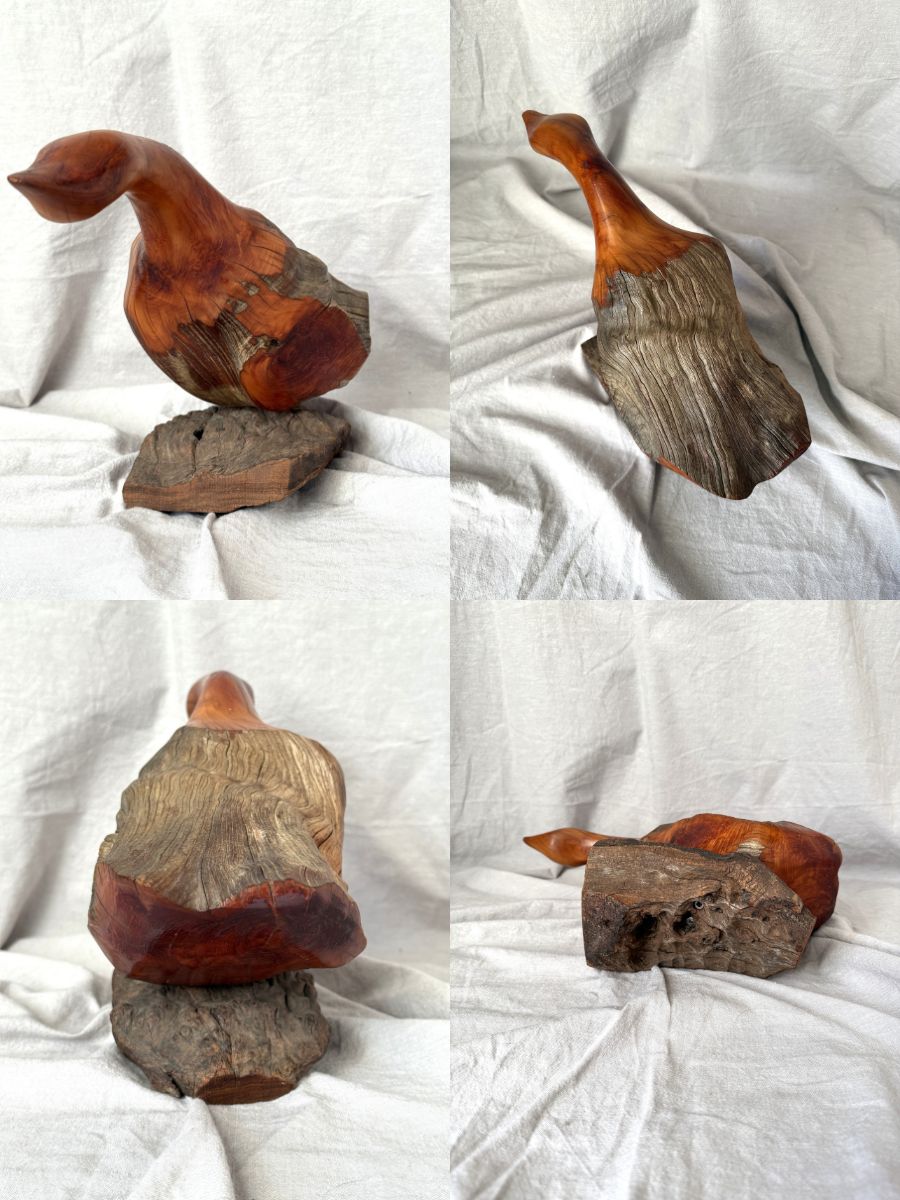 This exceptional hand-carved wooden goose (or duck) with live edges is incredibly realistic.  The shape, stance, and treatment of the wood to simulate feathers make it come alive.   Hand carved from a single section of genuine, century-old cedar fence post sourced from early ranches in the American West, it offers a piece of American history.  Unique and one-of-a-kind, it shows natural variations in the wood grain, color, and shape telling its own past.  The sculpture features a striking contrast between the smooth, polished head and neck and the rugged, live-edge body with a lightly-charred sealed finish.  It sits on a rustic, unfinished wooden base screwed from the underside.  Overall dimensions are 14.75″ long x 8-3/8″ at its tallest x 5.25″ at its widest.  This rustic yet elegant work of art is perfect for adding a touch of wilderness charm to any decor, particularly in a library, office or game room.