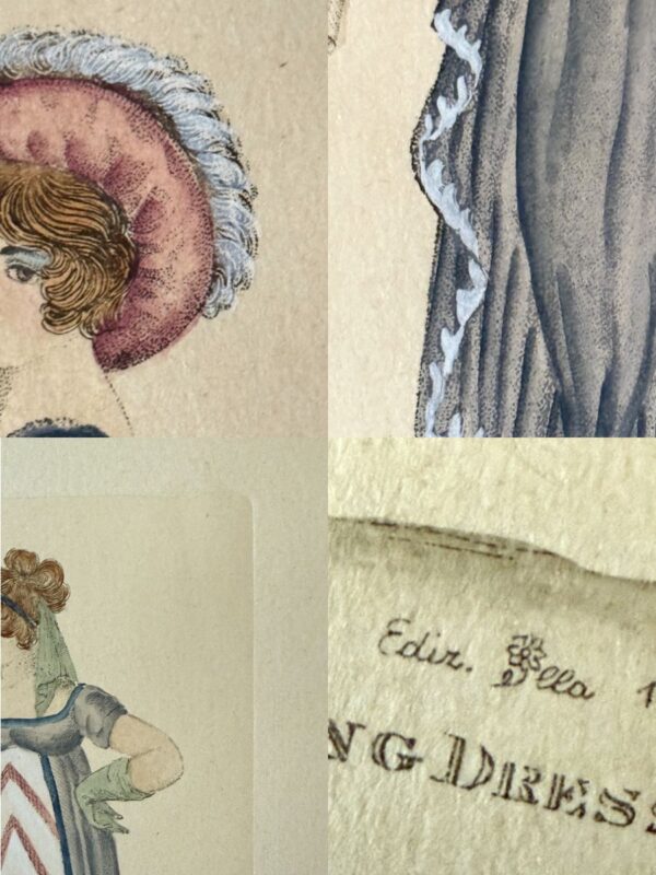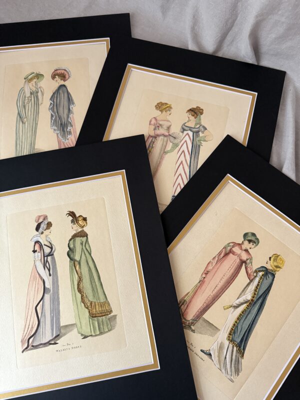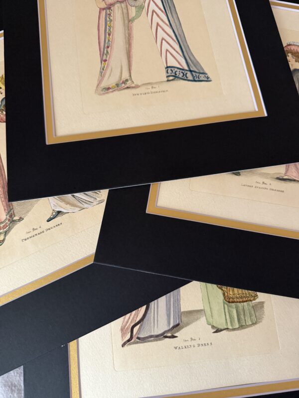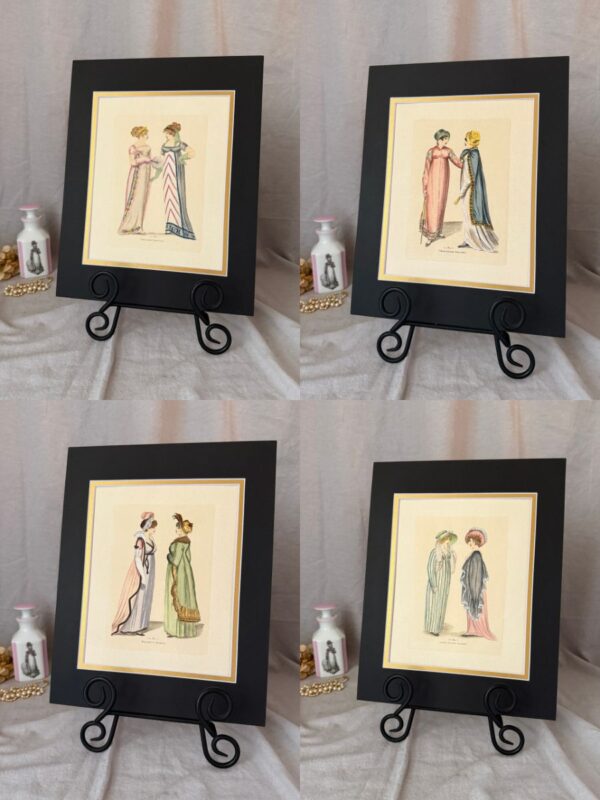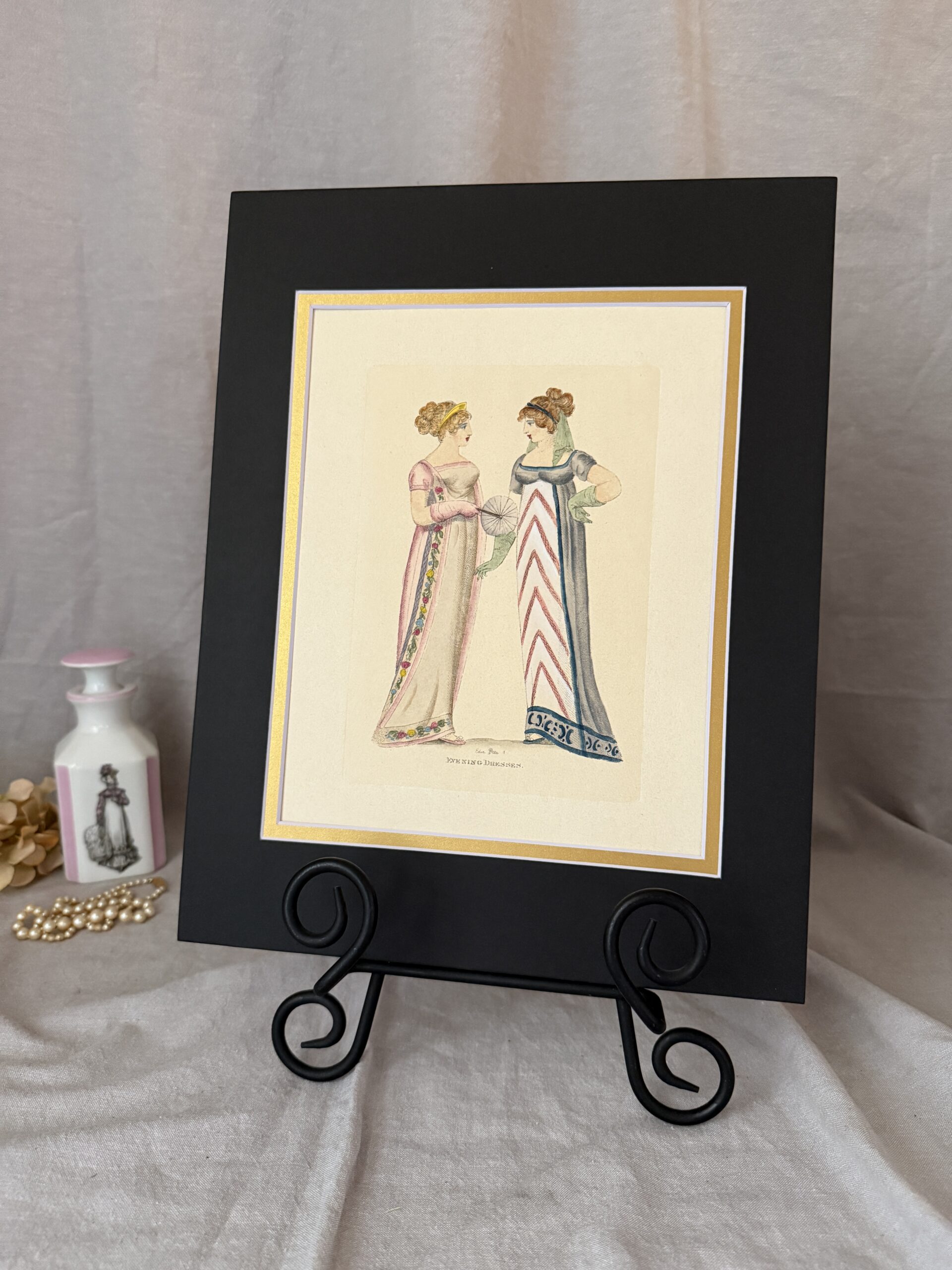 Vintage hand-colored engraving featuring Regency-style fashion printed by Edizioni Fiorella, verso stamped “Made in Italy.” Exquisite details and hand coloration. Plate marks visible. Matted under new double mats, black with gold border, 14″ x 11″, and ready for your custom frame. We have four available, sold separately; discount available for multiples. The photos truly don’t do them justice–they are very special. This listing is for “Evening Dresses.” Find the other three here: https://www.vintage-keepers.com/shops/alegriacollection/