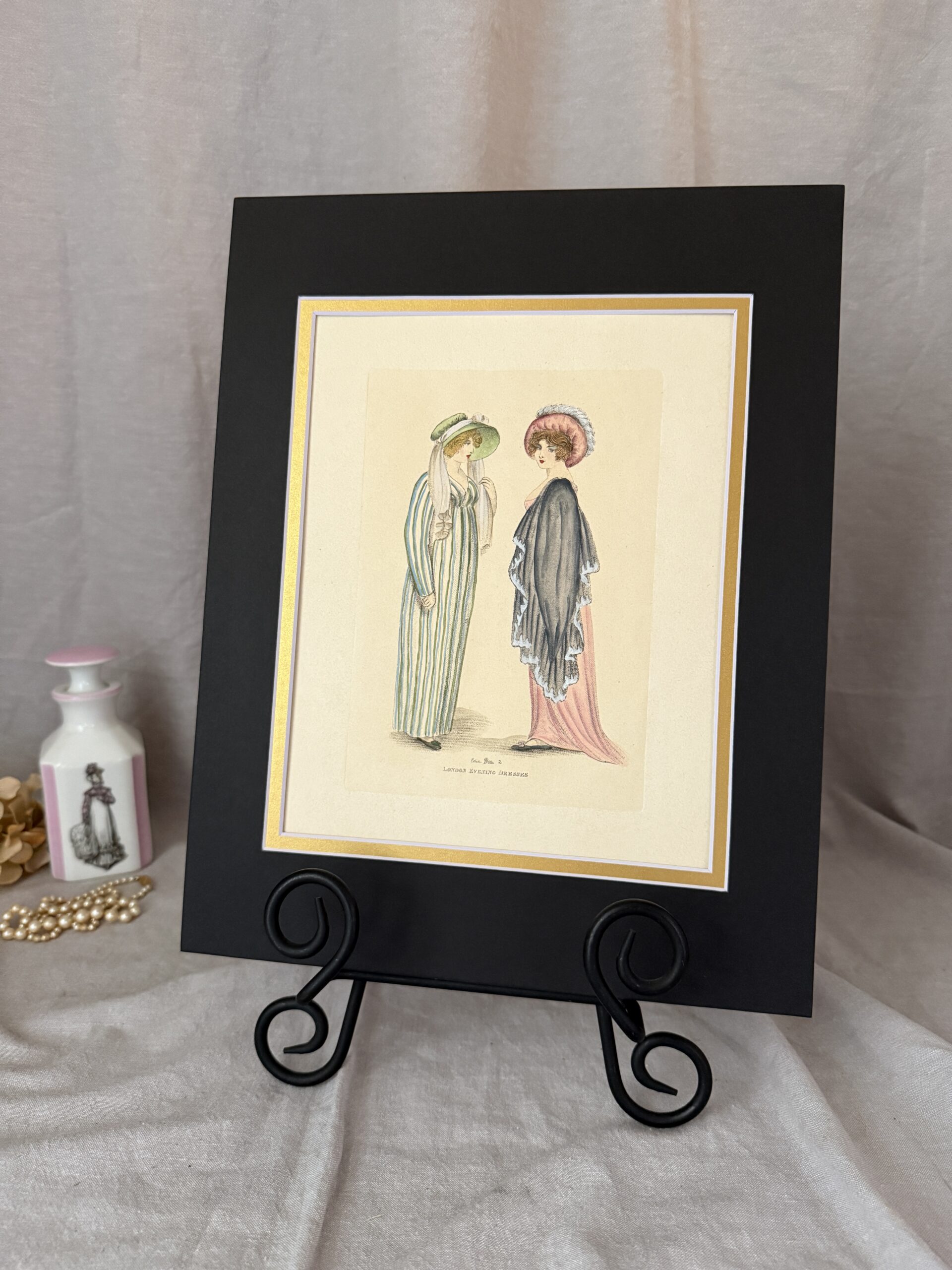 Vintage hand-colored engraving featuring Regency-style fashion printed by Edizioni Fiorella, verso stamped “Made in Italy.” Exquisite details and hand coloration. Plate marks visible. Matted under new double mats, black with gold border, 14″ x 11″, and ready for your custom frame. We have four available, sold separately; discount available for multiples. The photos truly don’t do them justice–they are very special. This listing is for “London Evening Dresses.” Find the other three here: https://www.vintage-keepers.com/shops/alegriacollection/