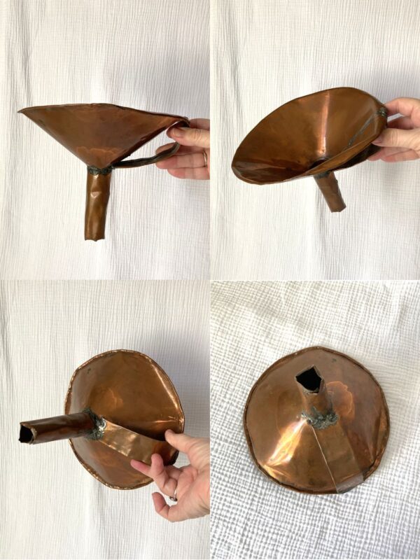 Large hand-crafted copper funnel with handle and rolled edge, very rustic, for European-inspired kitchen decor. The tube seam below the handle is not water tight. It measures 8-7/8″ in diameter x 7-1/8″ tall. Great patina; spotting, some dents and creases consistent with hand made nature and previous use–so much character!