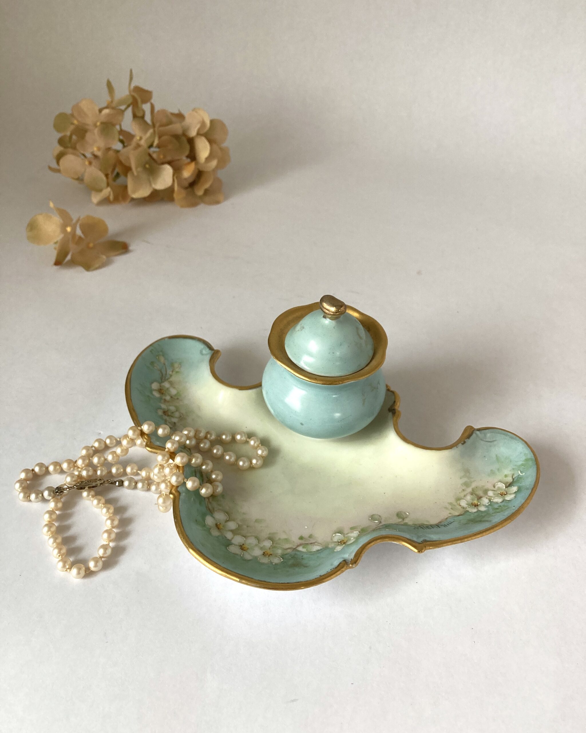 Lovely hand painted porcelain ink stand, perfect repurposed as jewelry catchall. It’s painted a pale blue with an ombre treatment and accented with delicate white blossoms with yellow centers and gold embellishments. The little ink pot with lid is removable.