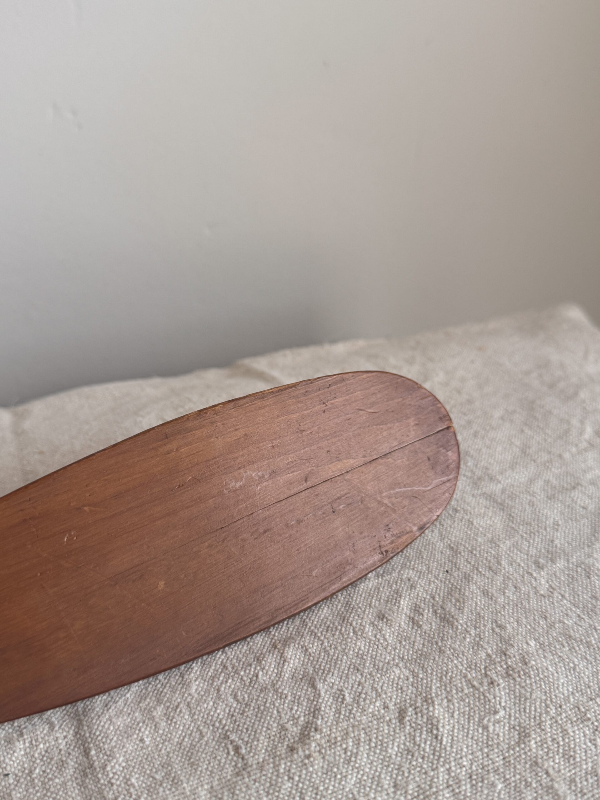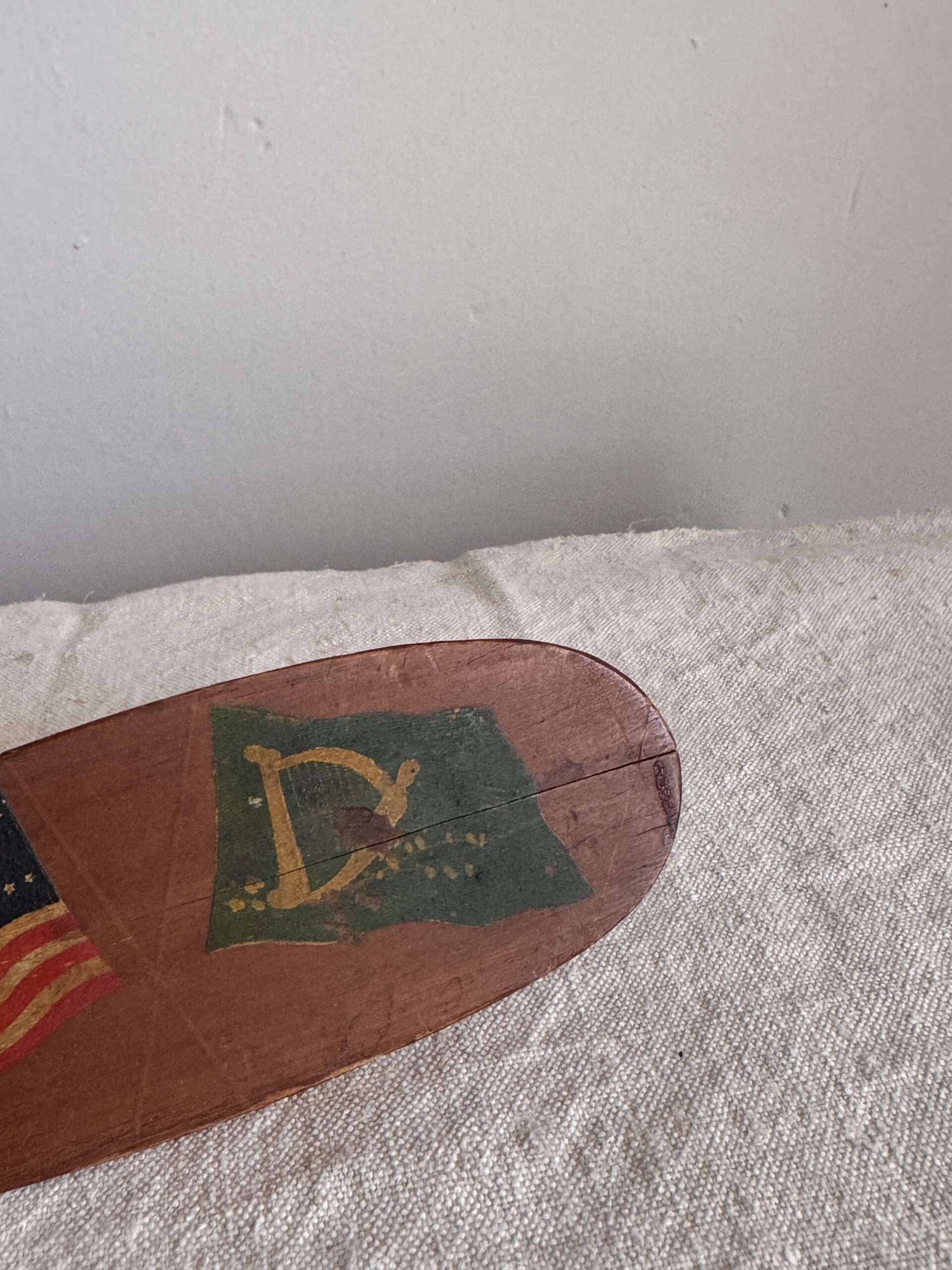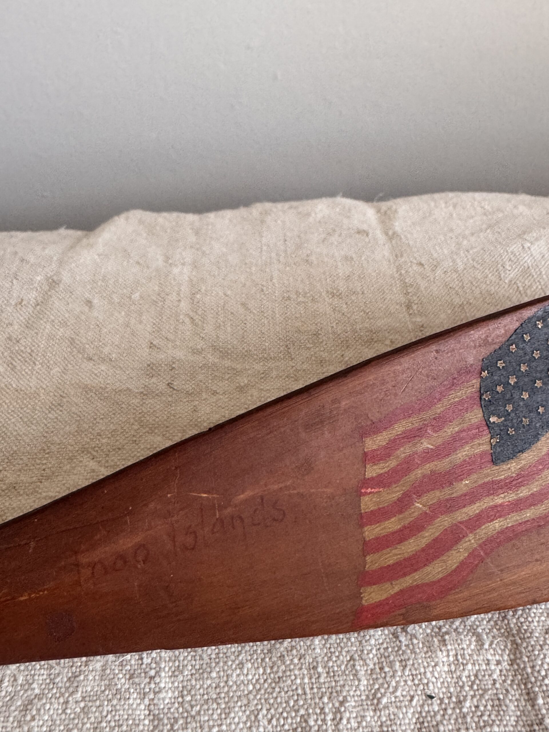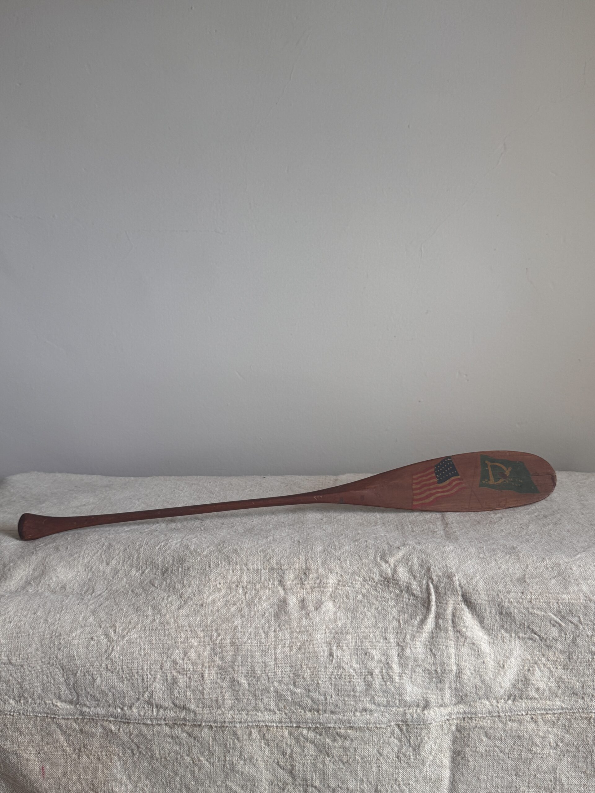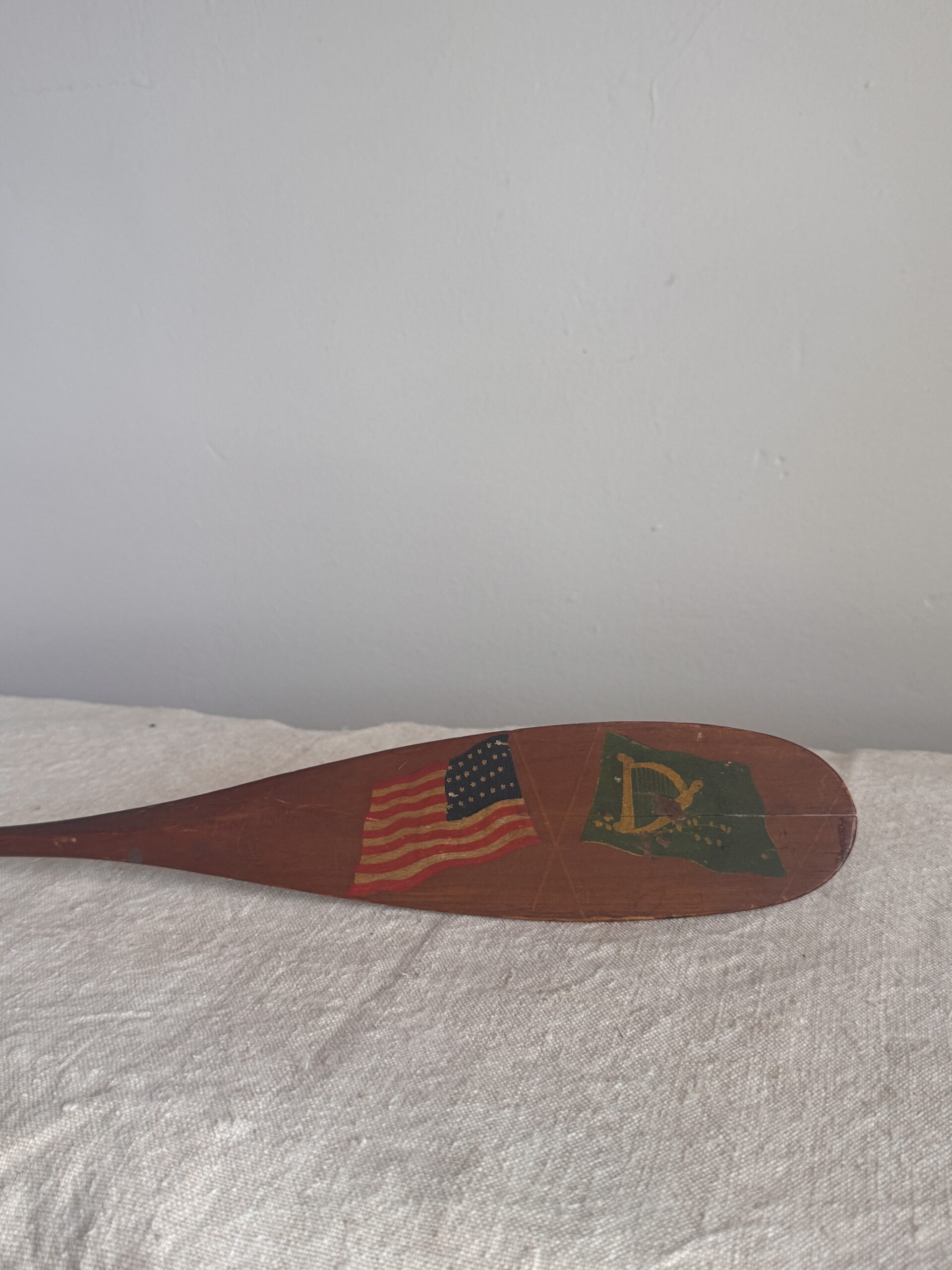 A beautifully timeworn wooden paddle with a long, elegant silhouette and original hand-painted detailing, including an American flag and emblem motif. Likely once ceremonial or commemorative, this piece carries the quiet poetry of use and age – more sculptural than functional now.
