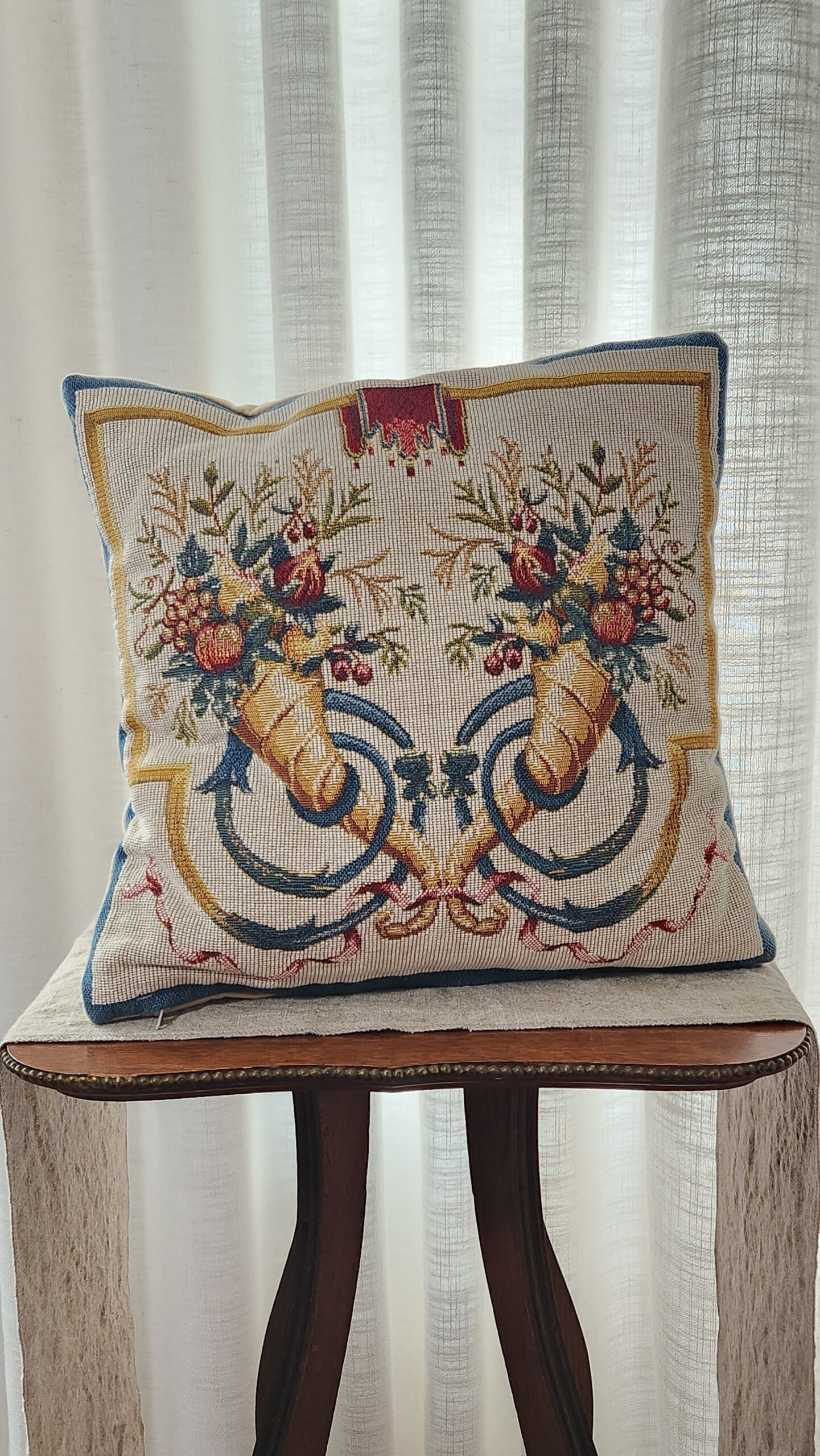 Tapestry is on the front, and light creamy velvet is on the back. Has a zipper enclosure with a gold velvet pillow on the inside. Measures 13 x 13. Blue edge with cornucopia motif. Made in France