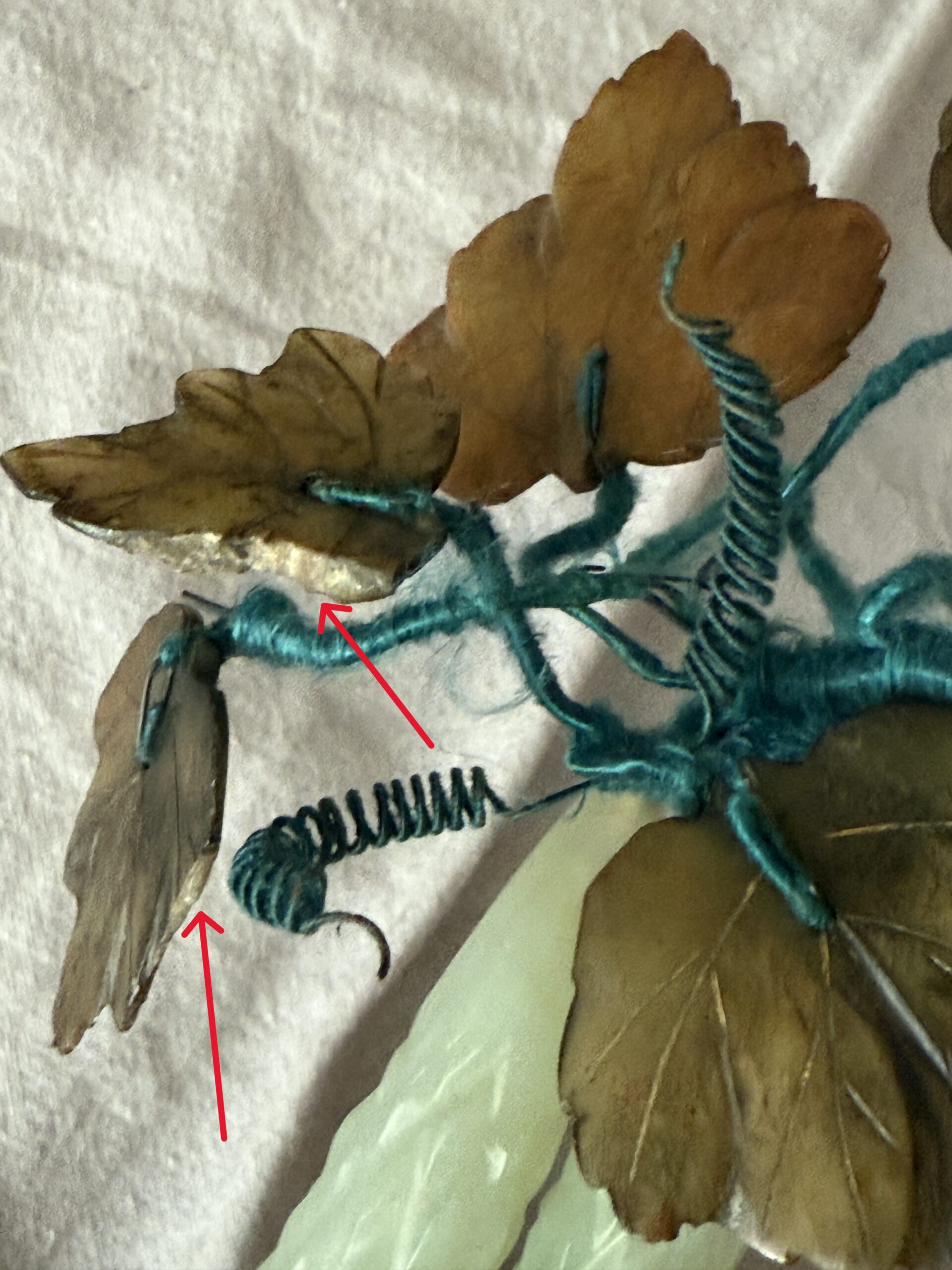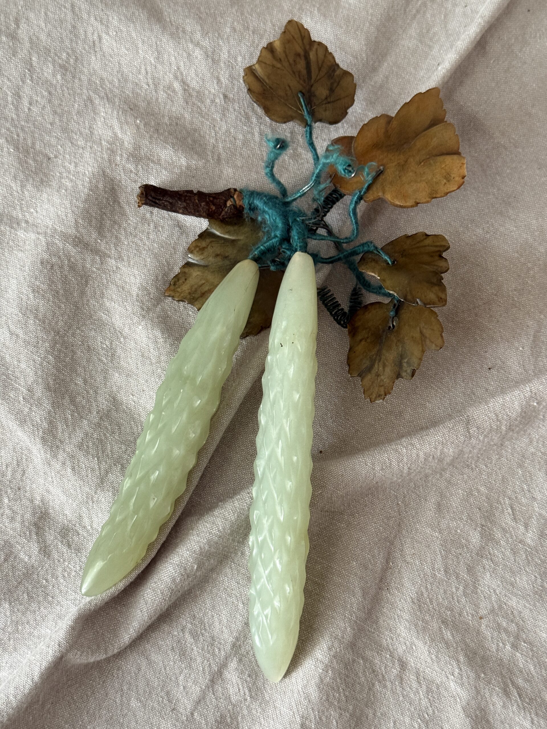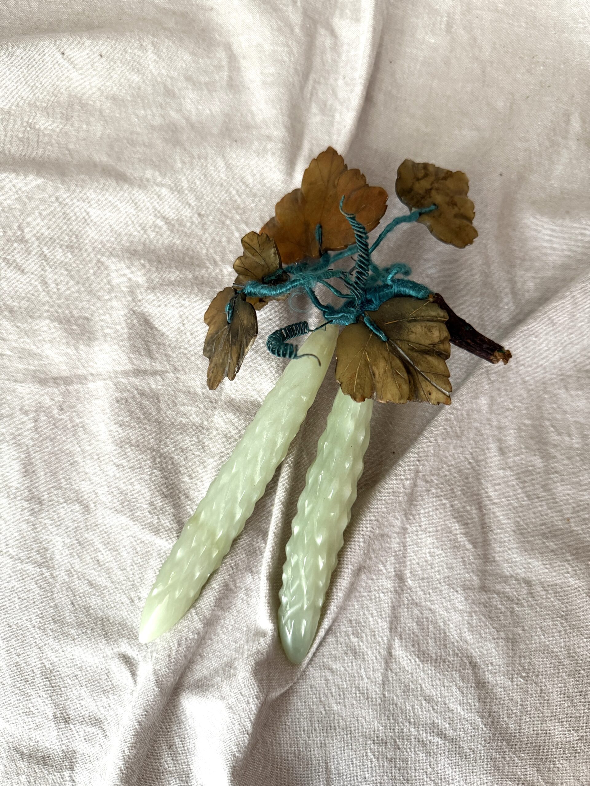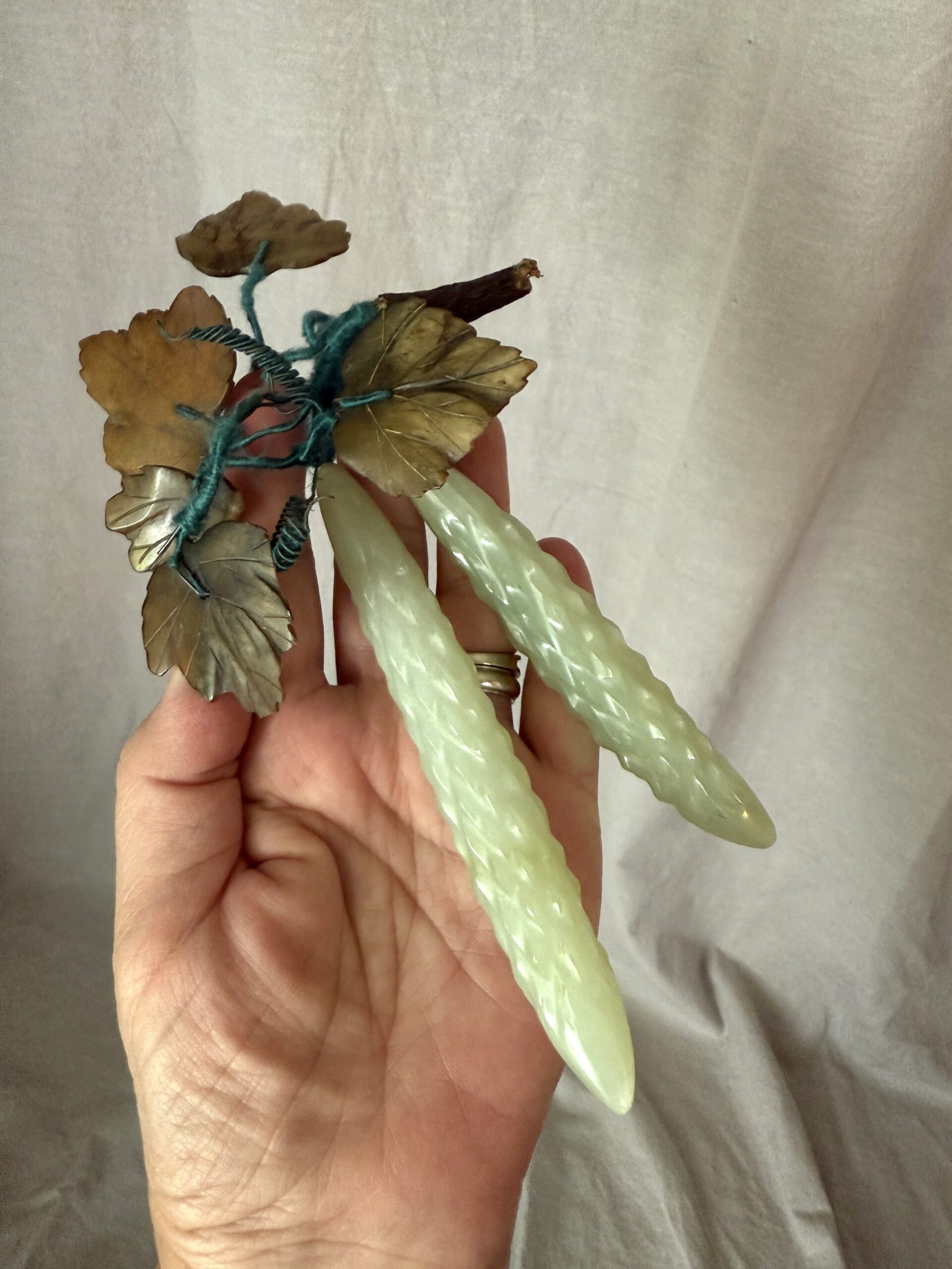 Vintage jade Chinese cucumbers with stem. Wires on the back side allow for displaying in a slightly more vertical position. Two of the leaves have minor damage; some fraying on the covered wires. Great addition to a bowl of decorative jade fruit, etc. Style on a book or shelf. Overall length is approximately 8.5″. Grapes and snow peas in last photo listed separately.