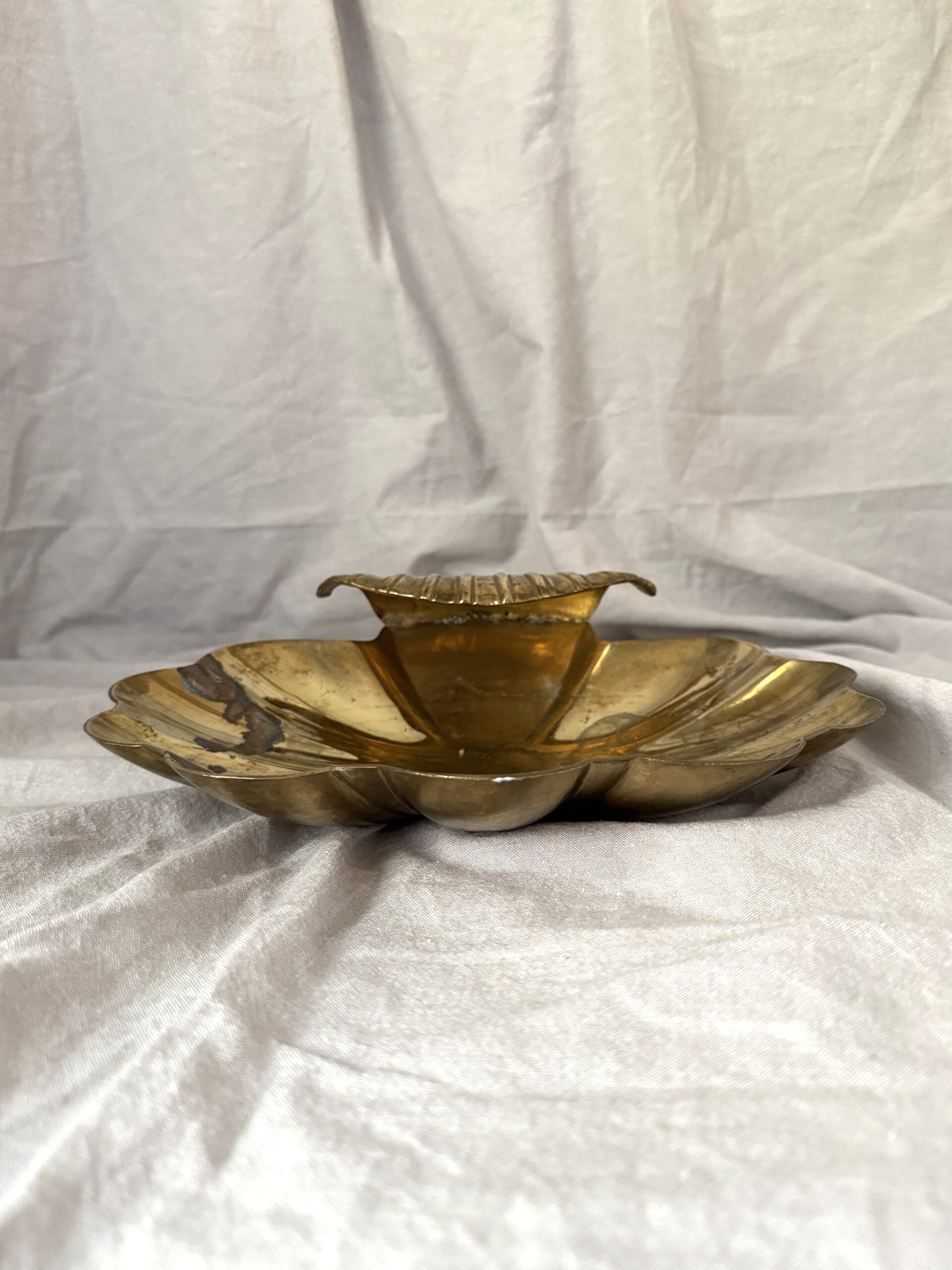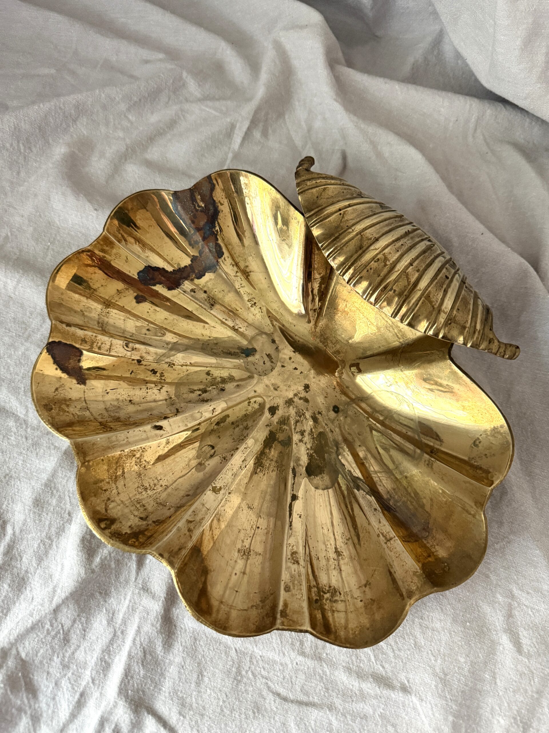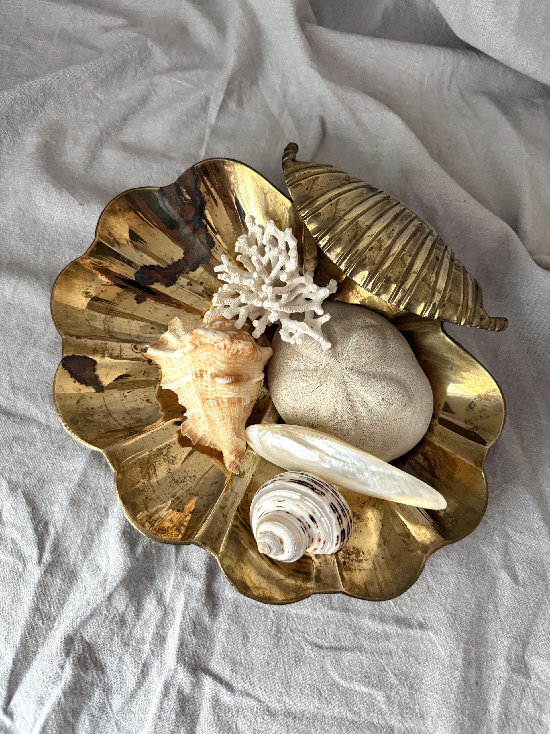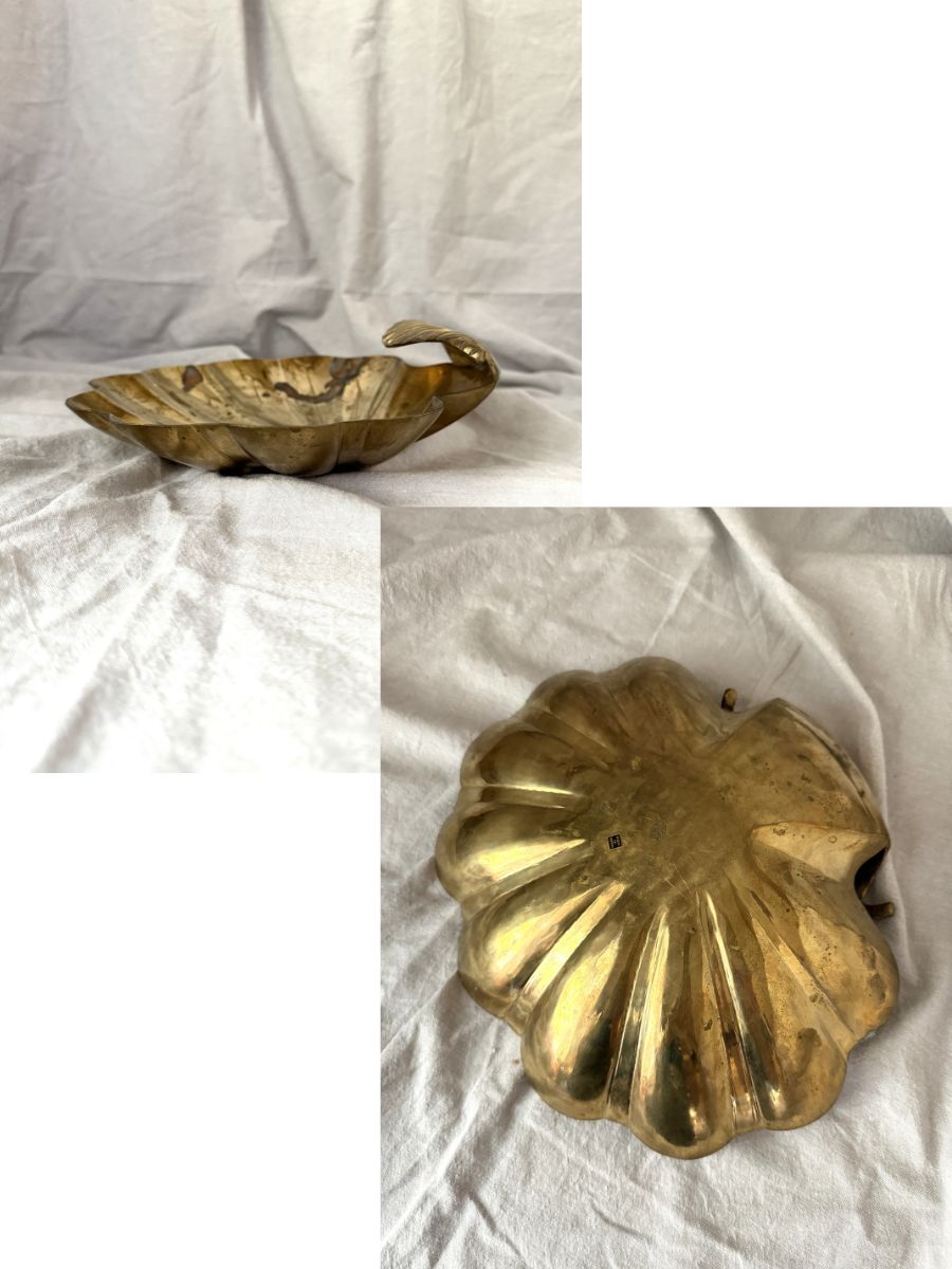 Vintage large brass clam shell dish for a variety of uses. The dish measures 11.5″ side to side by 9.75″ front to back x about 3.25″ at its tallest and weighs 3 lbs. 2 oz. It shows color variations, lots of patina and oxidation (second image), some of which may polish out–but we love how it all adds to the vintage character. However, we’ve adjusted the price accordingly. Made in India. Use it to display seashells or found objects, jade grapes, alabaster eggs, or a variety of small collections. Pictured seashells not included but available, along with jade grapes and alabaster eggs–just ask if interested.