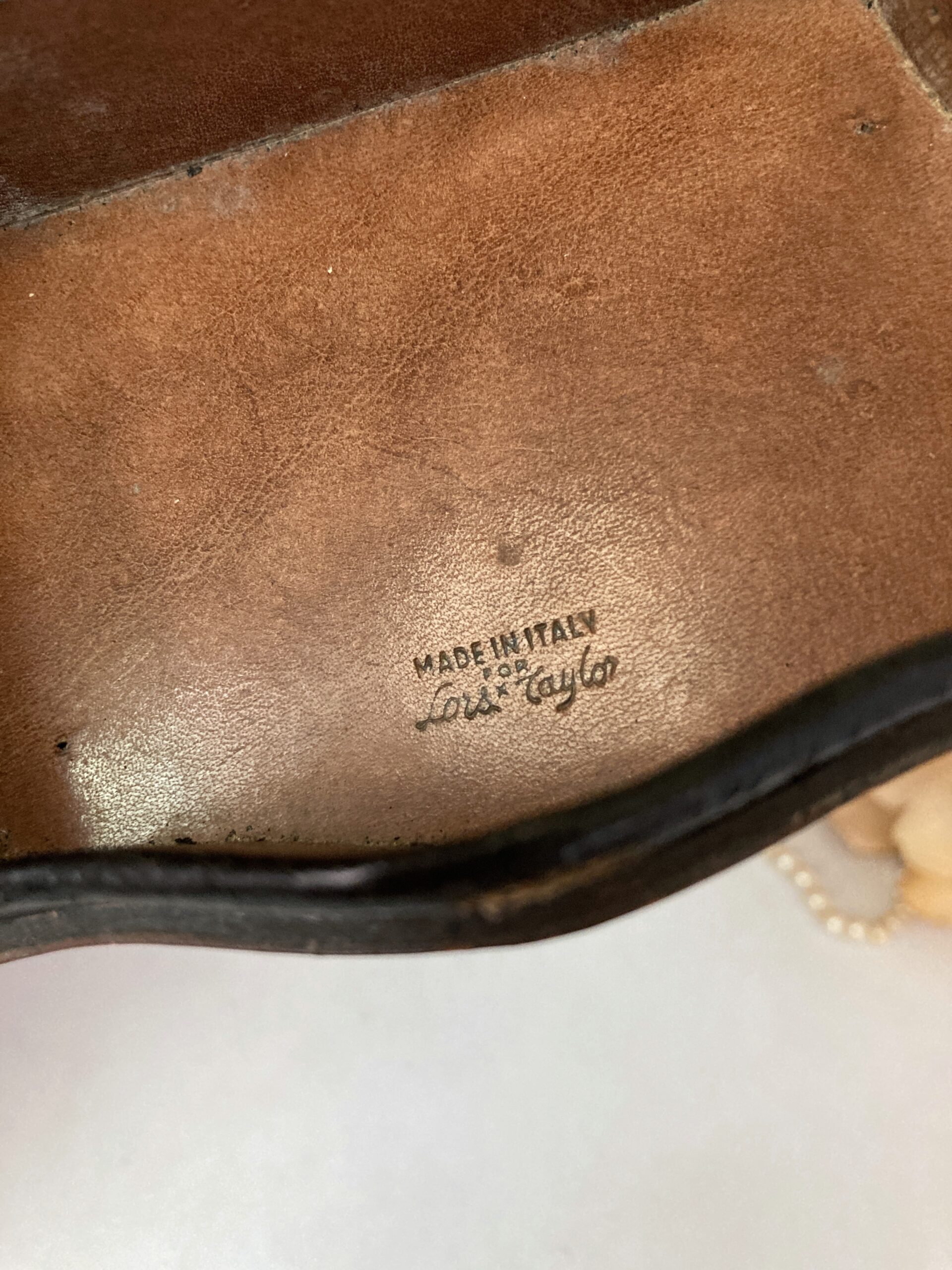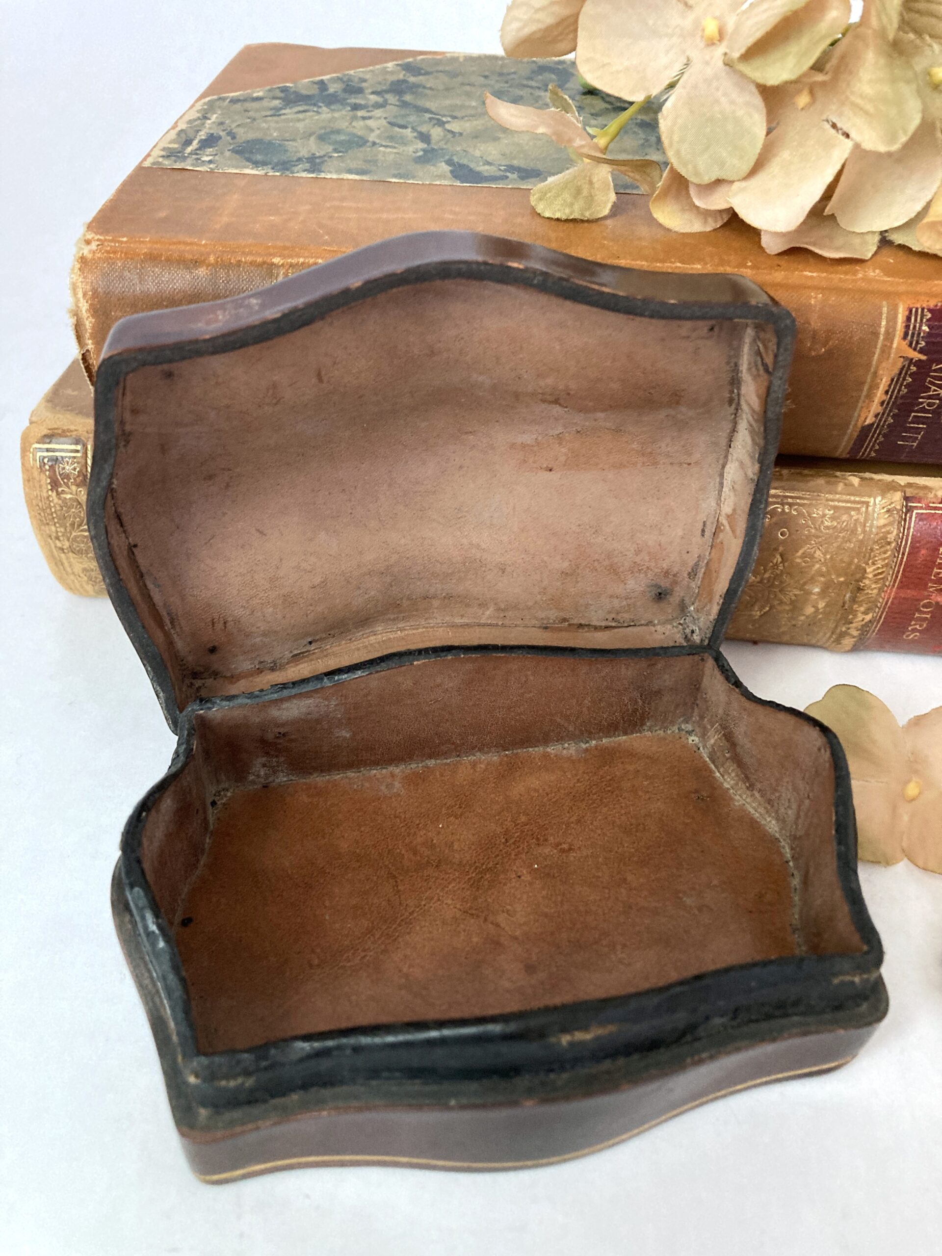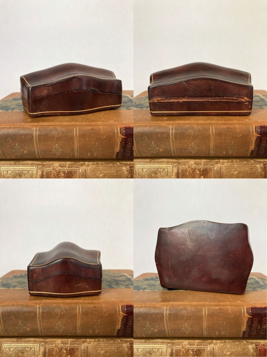Vintage moulded leather jewelry box made in Italy for Lord & Taylor.  Beautifully crafted from 1/8″ leather in a classic design, the box features a curved lid and gold accents.  The interior is marked “Made in Italy for Lord & Taylor.”  The unlined interior is clean and can accommodate a variety of pieces of jewelry: earrings, rings, cufflinks, tie clips or, alternatively, paperclips, postage stamps, etc.  It would also make a unique presentation box for a special piece of jewelry or other small gift item.  The exterior has a reddish finish.  The initials “AB” are lightly hand carved on the underside.  Overall measurements are 4-1/16″ side to side x 2-13/16″ front to back x 1-13/16″ top to bottom.  Overall excellent condition with some wear consistent with age and prior use.  Beautiful addition to a collection of Italian leather boxes.  We have a few more leather boxes listed in our shop (last image).  Simply search “leather box.”