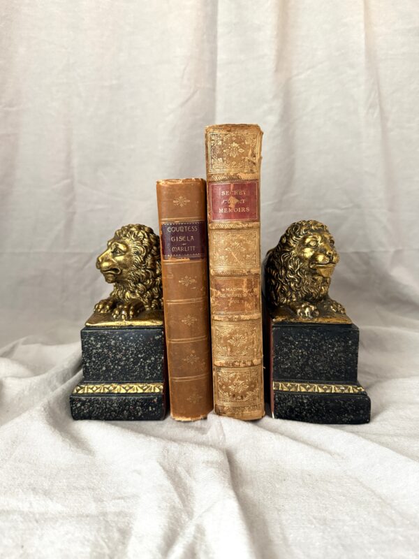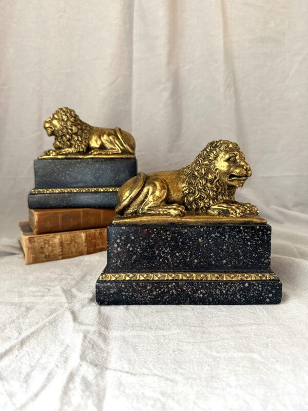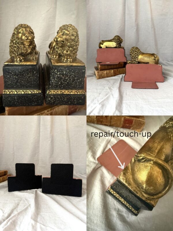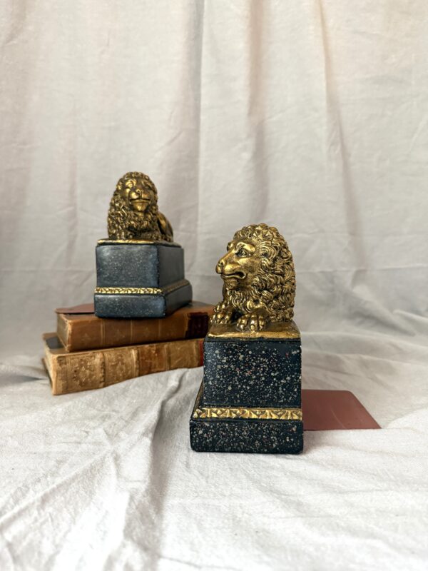 Vintage lion bookends by Borghese (history below) in beautiful black and gold. The gold lions sit on a mottled black plinth that resembles granite, accented with gold details. Very detailed, realistic and stately. They measure 6.5″ x 7″ x 5-5/8″ and combined weight is 6 lbs. 11 oz. One of the bookends has a repair; a few small nicks–priced accordingly. Great addition to the library.