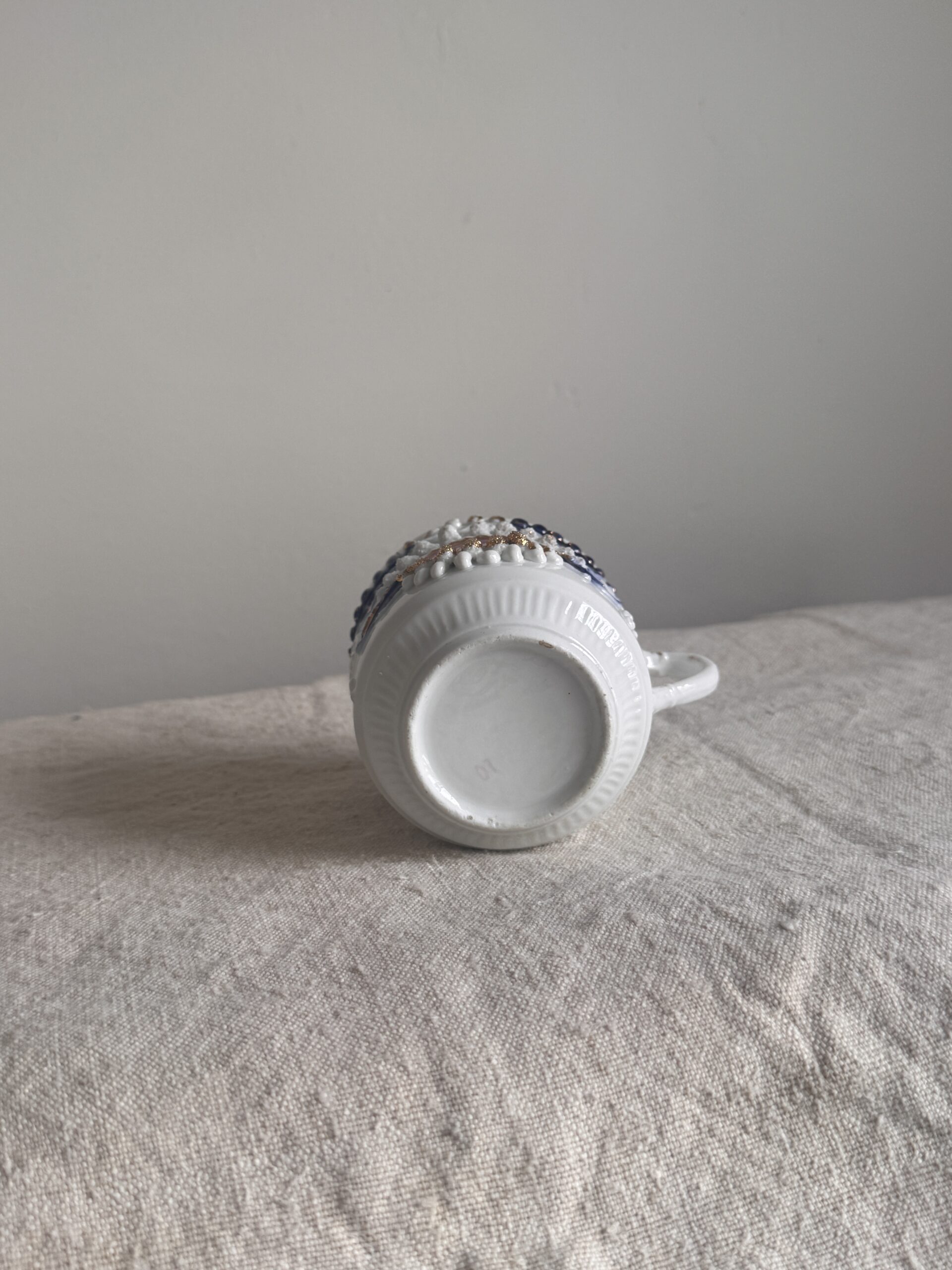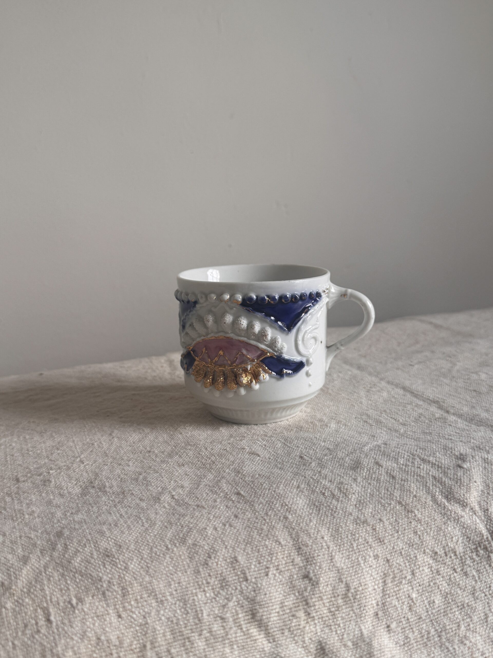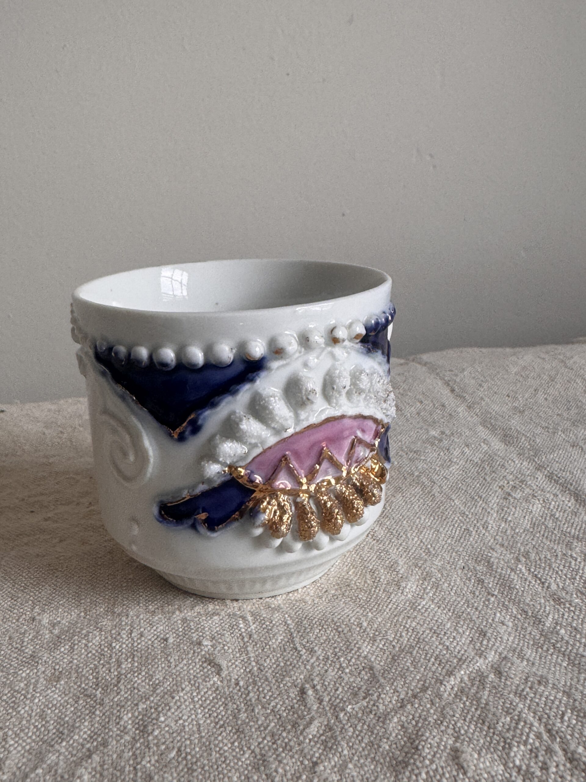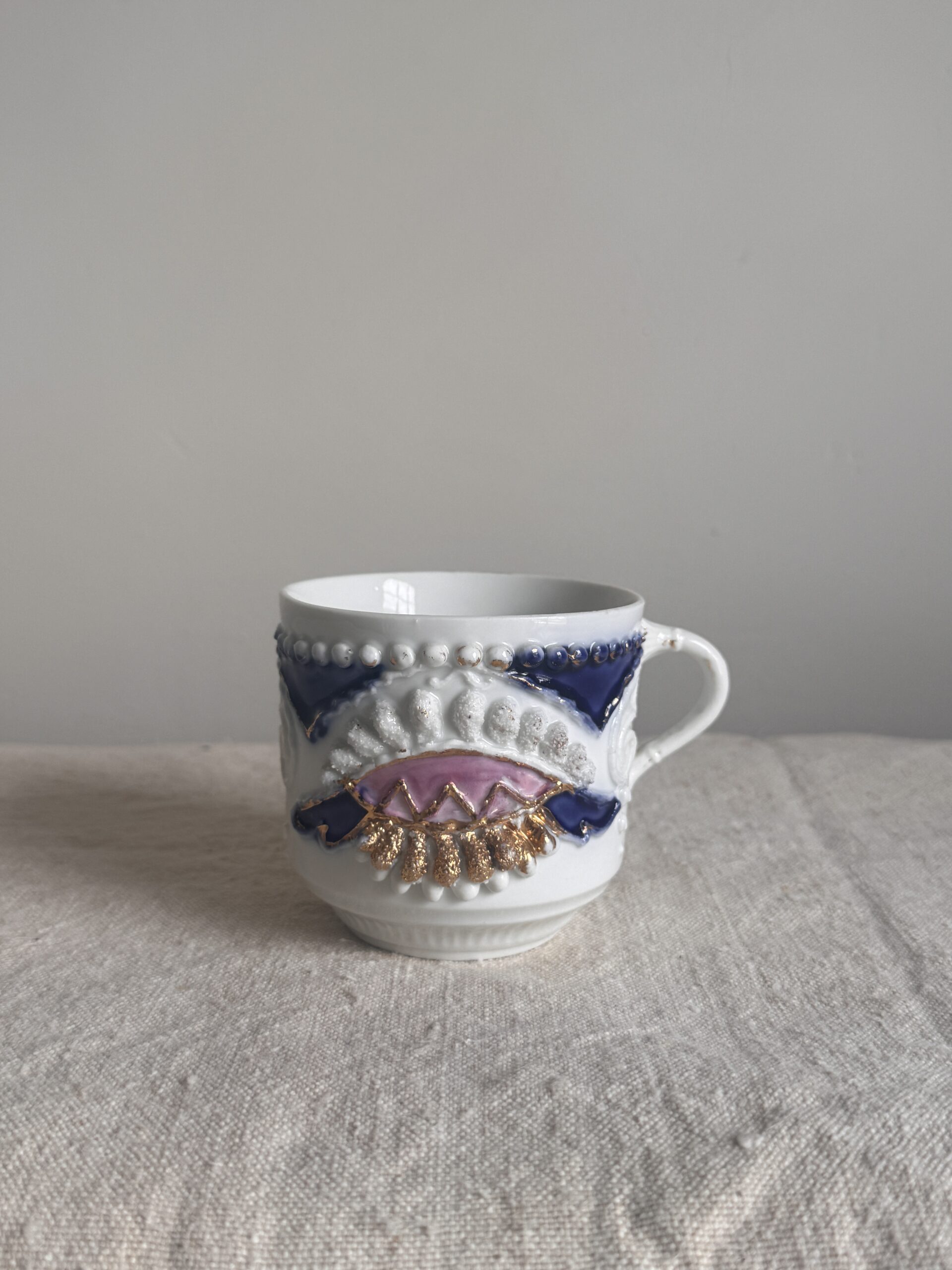 A richly decorative 19th-century lusterware mustache mug, celebrated today less for its original intent and more for its ornate craftsmanship and sculptural presence. The exterior is adorned with raised relief detailing, jewel-toned cobalt and blush accents, and hand-applied gilt that catches the light with quiet drama.