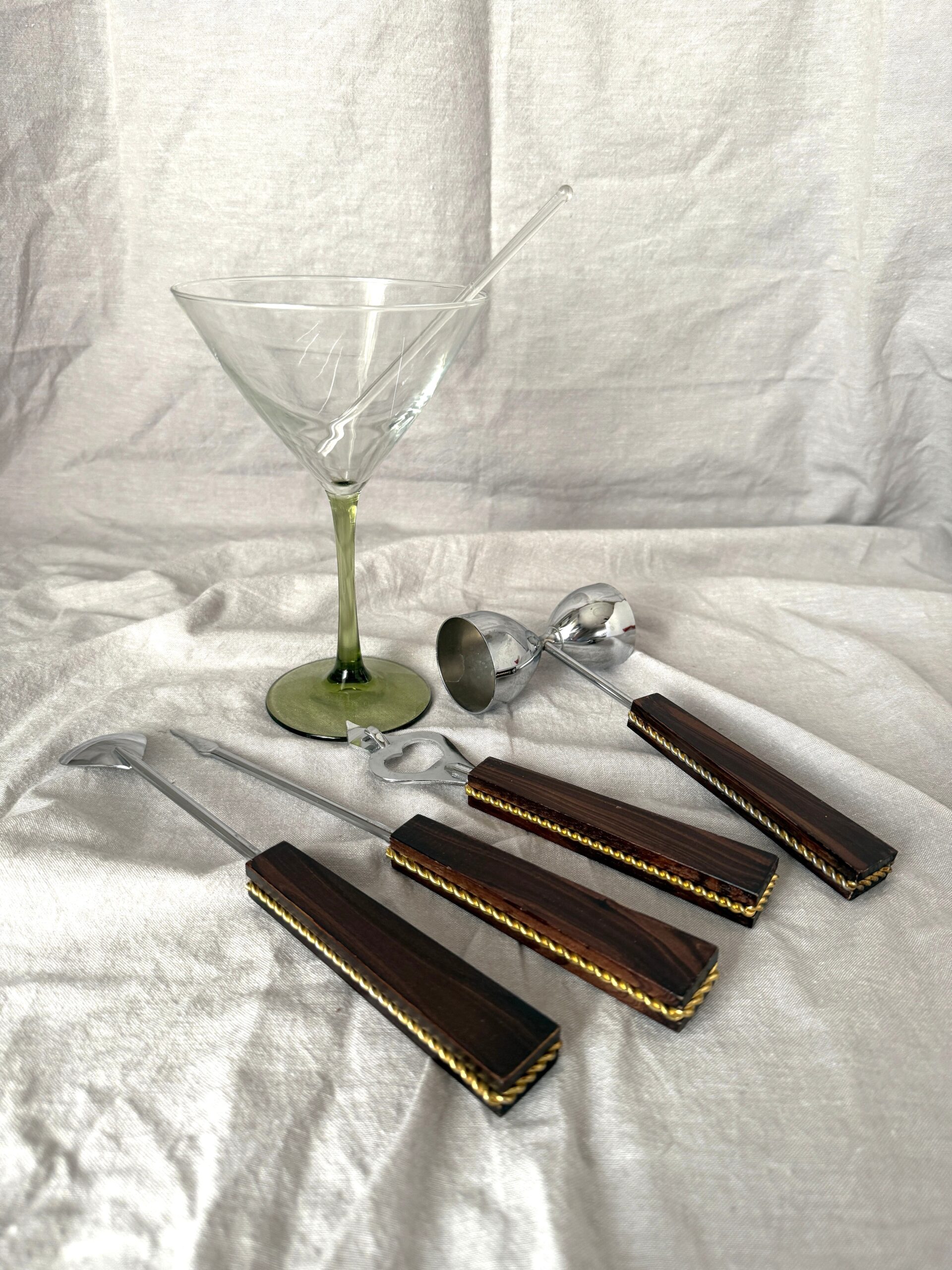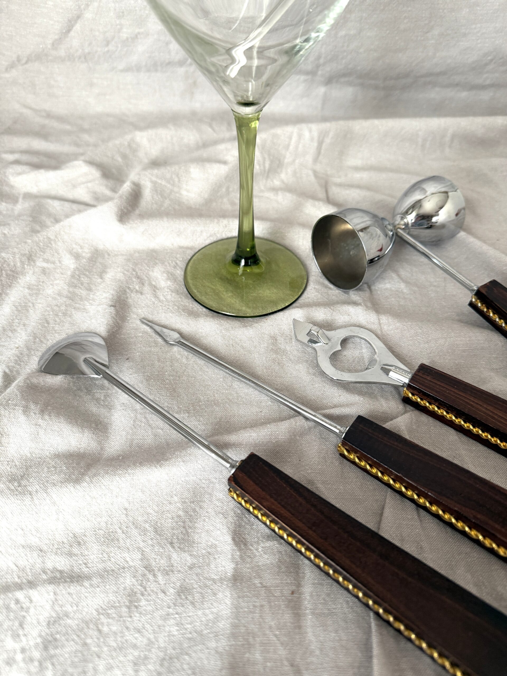 Vintage bar tool set, stainless steel with wooden handles from the 1970s.  The set consists of four pieces: double jigger measure, bottle/can opener, olive/onion spear, and spoon.  Each piece is marked “Japan” or “Made in Japan.”  The wooden handles, stained a dark brown, feature a gold “rope” detail.  I believe this set was originally marketed in a storage box by Riviera.  The set is in very good used vintage condition with minor wear consistent with age and prior use.  Glass stirrer and champagne glass not included.  Great modern addition to the bar cart.