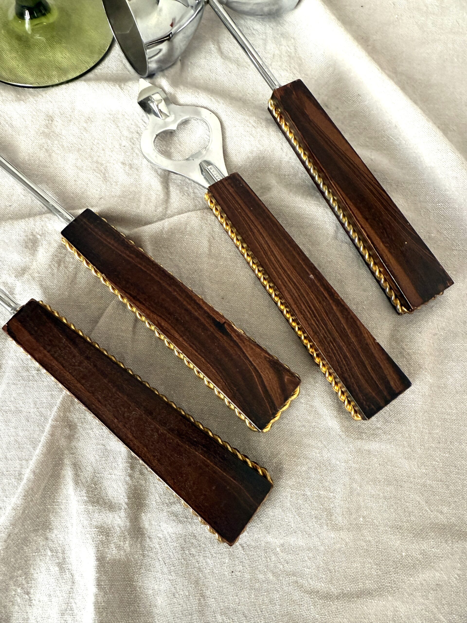 Vintage 1970s Bar Tool Set with Wooden Handles and Gold Rope Detail 4 Pieces