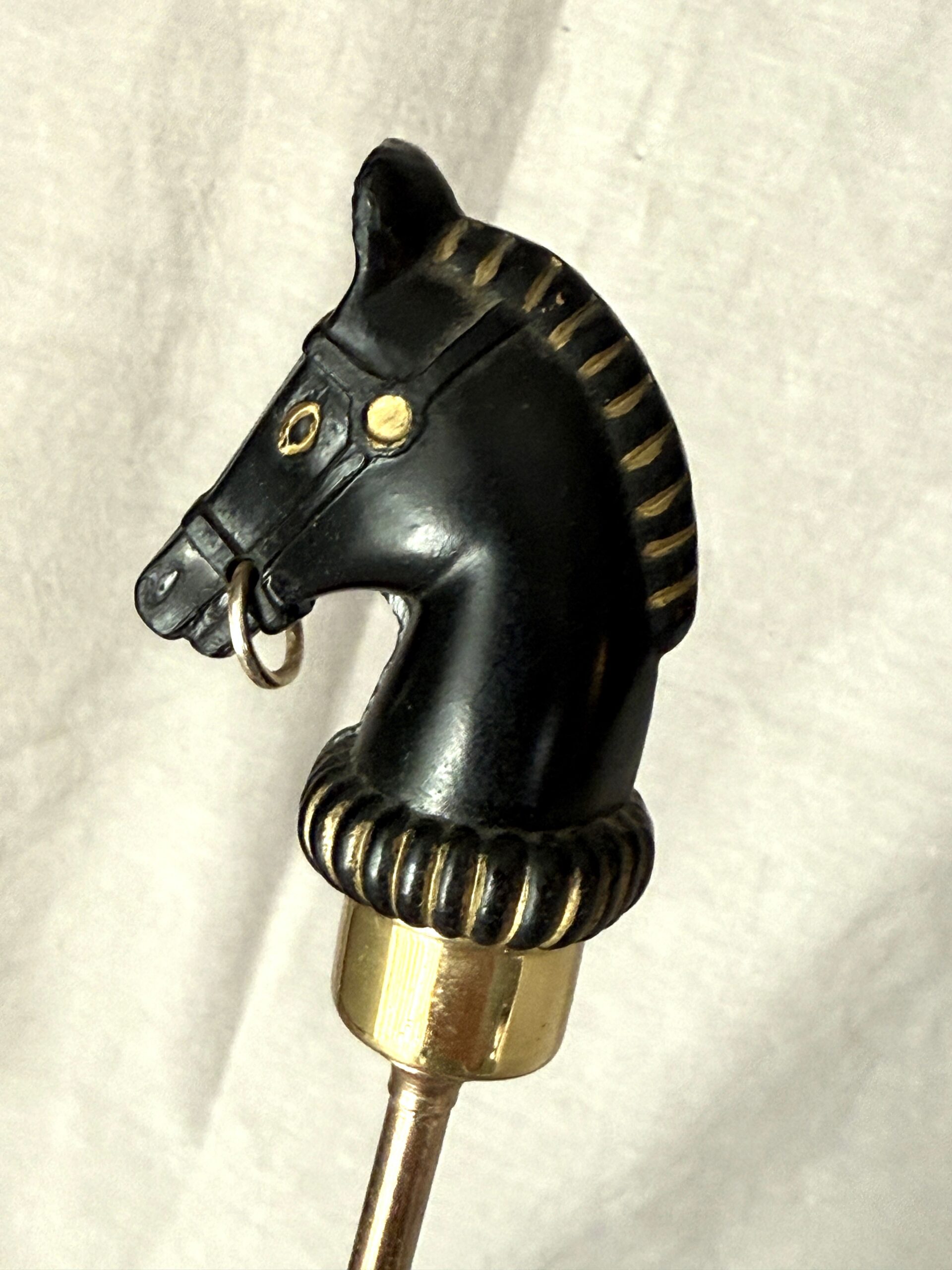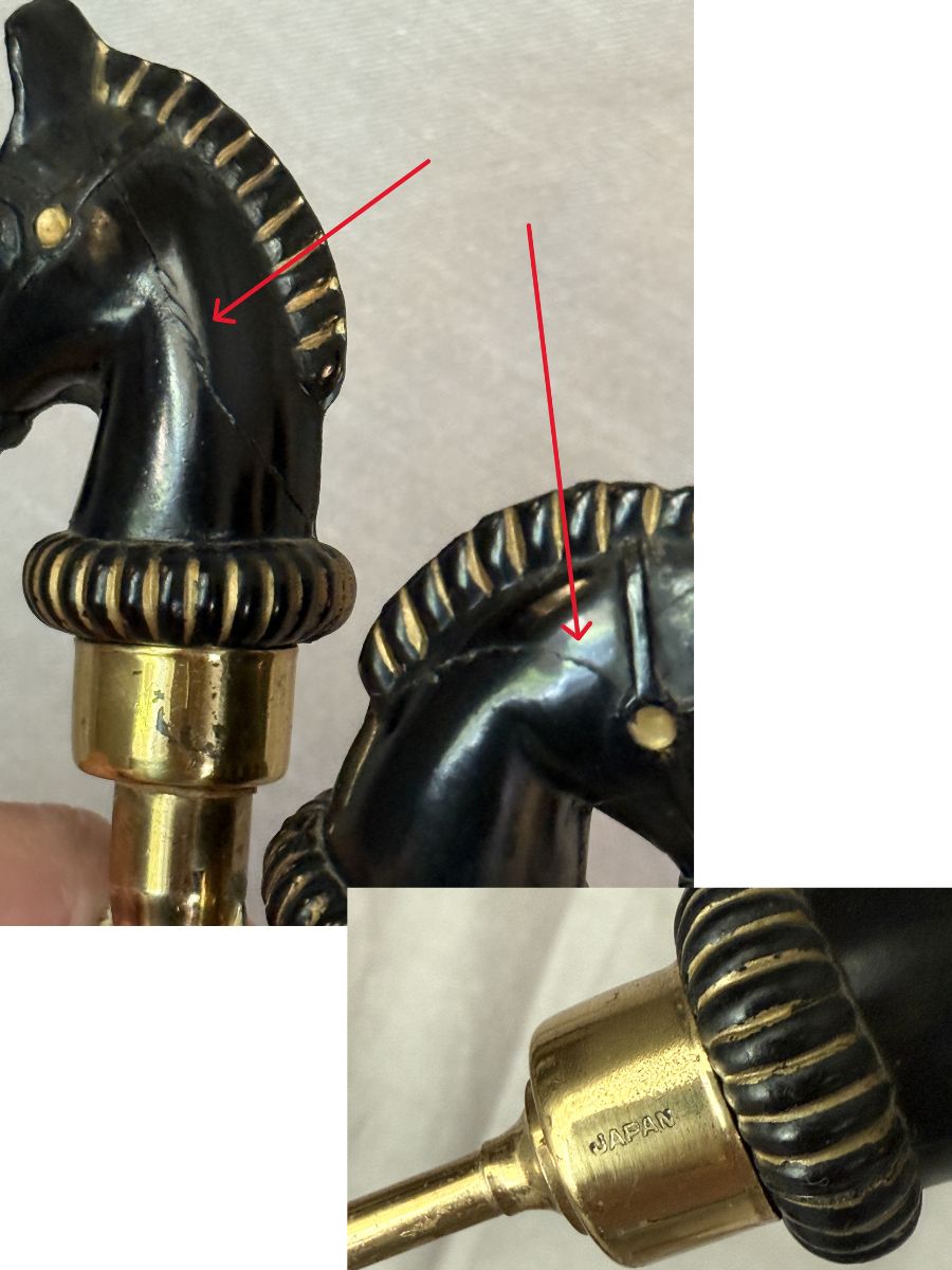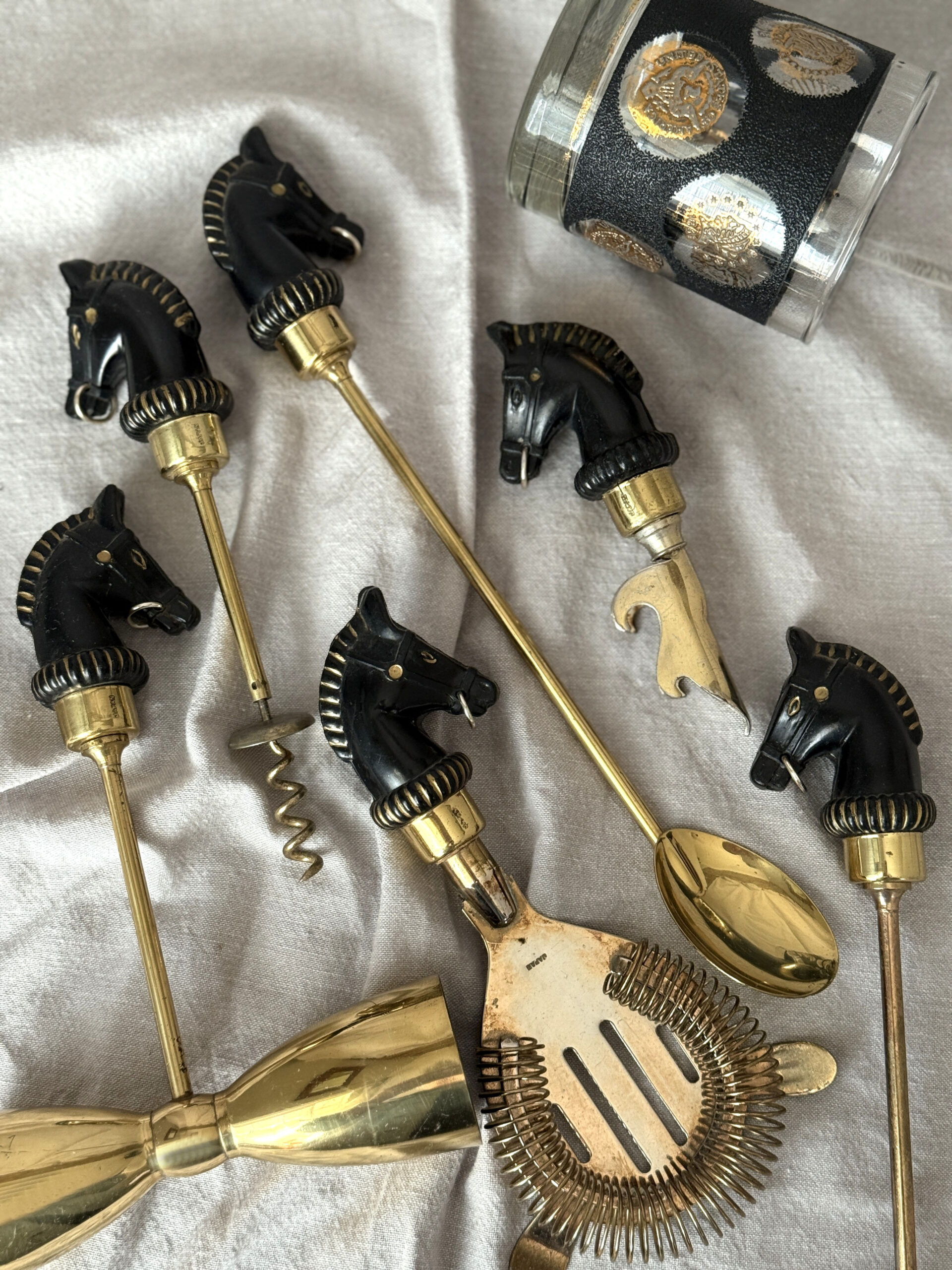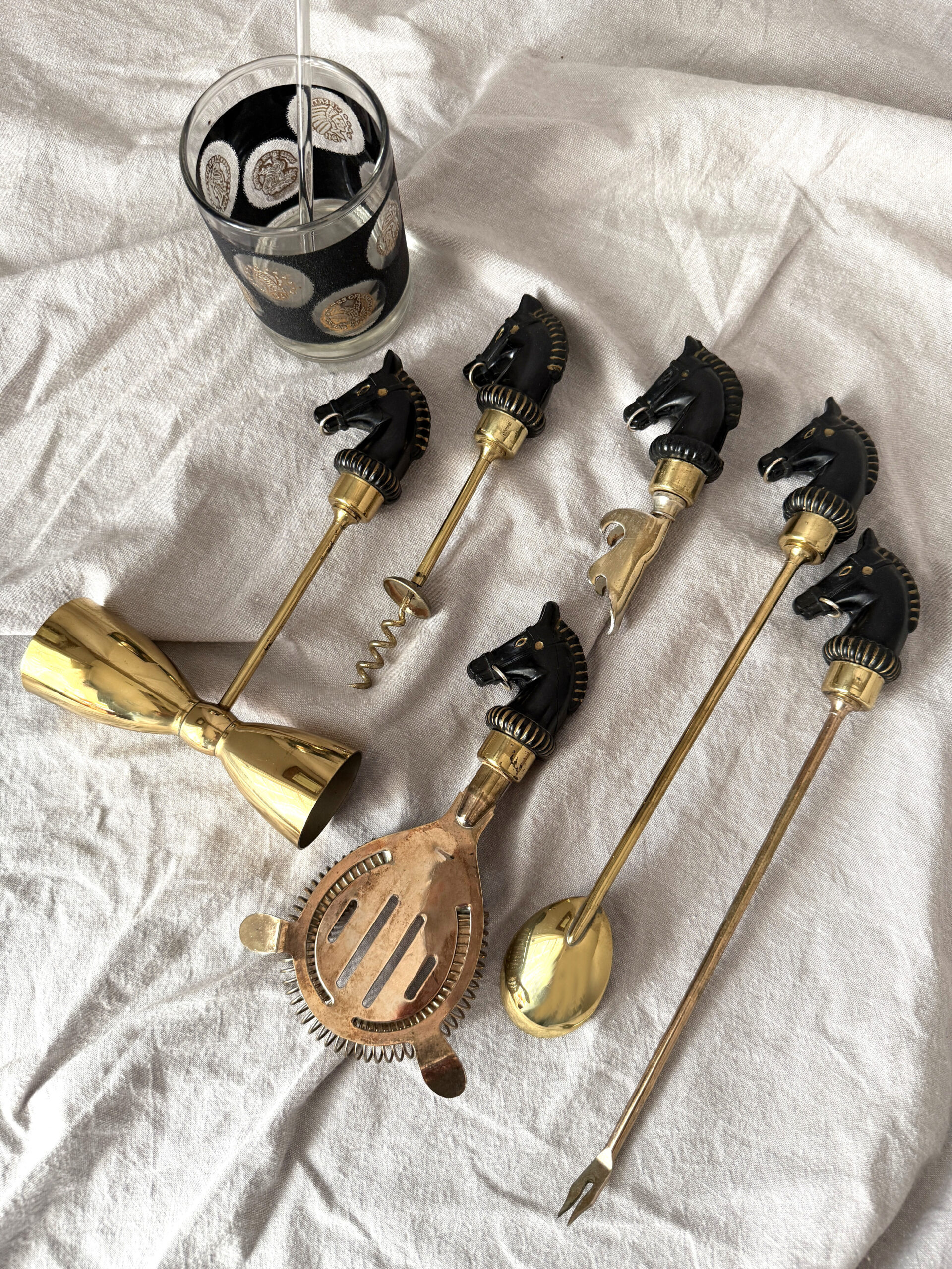 Vintage bar tool set with horse head handles from the mid-1900s.  The set consists of six pieces: double jigger measure, bottle/can opener, olive/onion fork, corkscrew, strainer, and spoon.  Each piece is marked “Japan.”  I believe this set was originally marketed in a storage/presentation box by Crown Awards.  The set is in good used vintage condition with wear consistent with age and prior use, including minor scuffs and scratches and a hairline crack on two of the pieces–last image–priced accordingly.  Glass stirrer and cocktail glass not included.   Great mid-century modern addition to the bar cart or Ralph-Lauren-inspired decor.