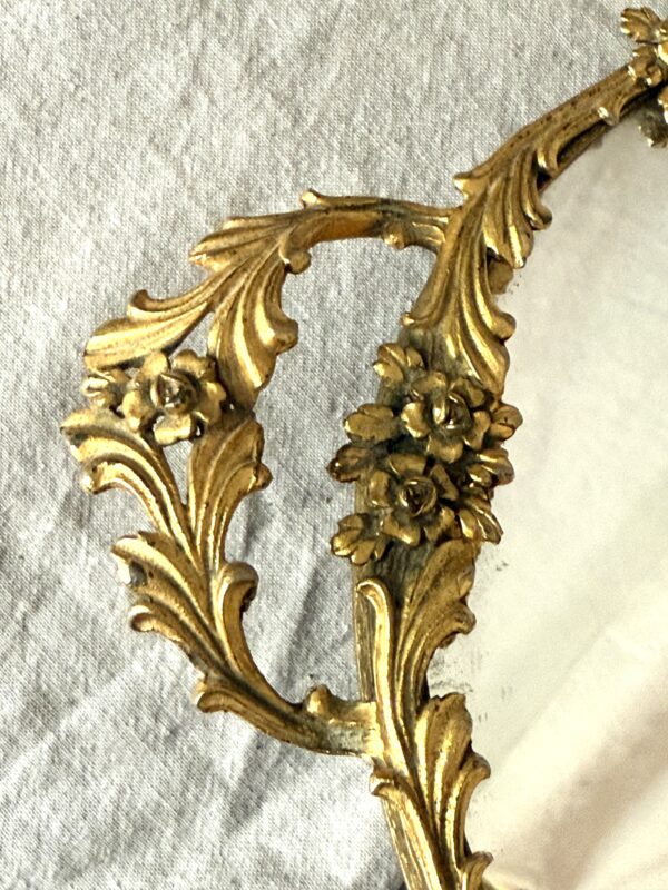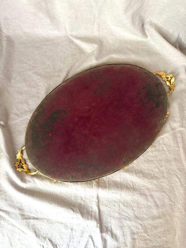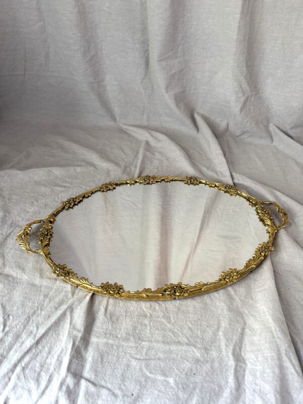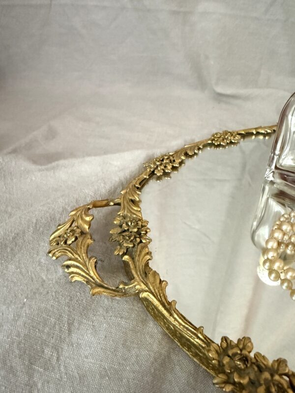 Vintage mirrored vanity tray featuring an ornate ormolu frame and handles with floral motif. The outer edging features an etched foliate design. Not marked but likely made by Matson or Stylebuilt, manufacturers of gold-plated vanity accessories in the mid-1900s. The mirror surface has a few minor scratches consistent with prior use. The felt paper on the underside is worn–see last image. Otherwise, in excellent used vintage condition. Overall measurements are 19″ long x 11.25″ wide x 1″ tall at the handles.