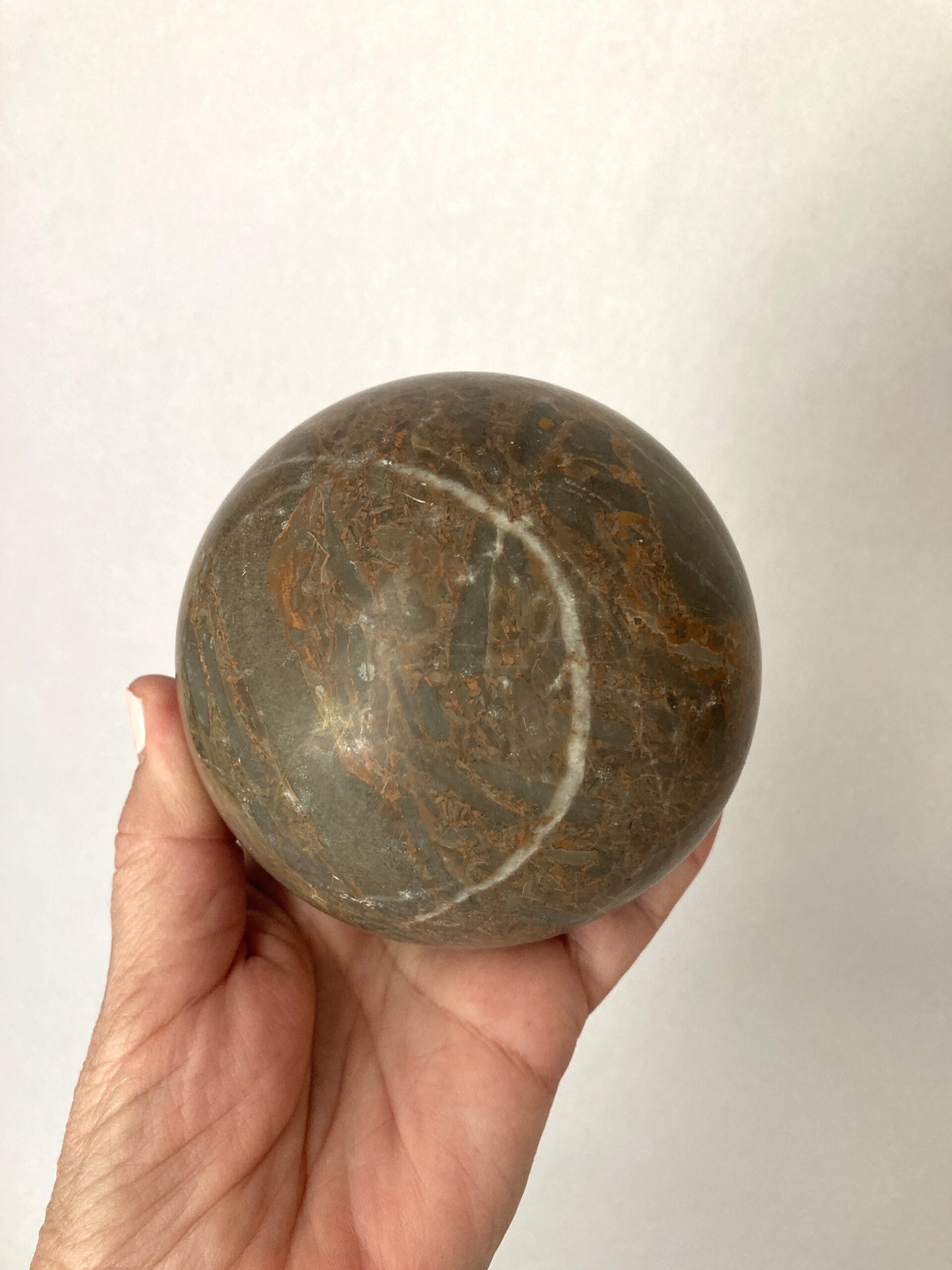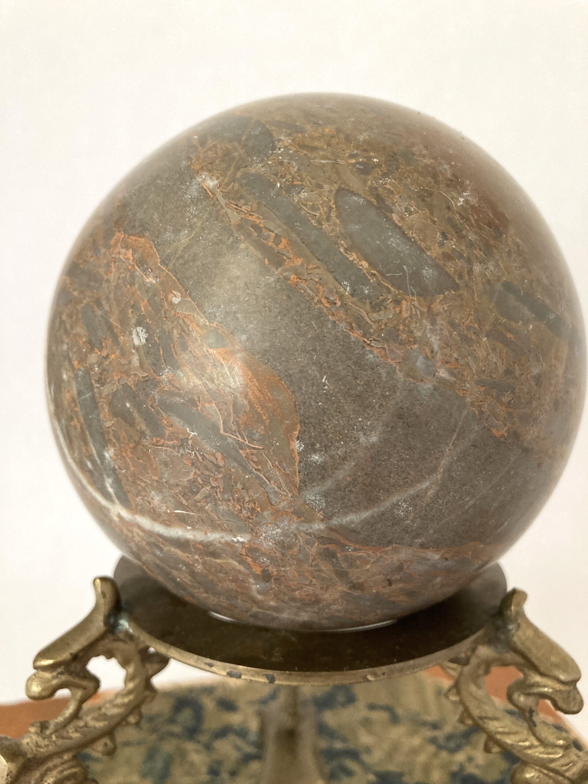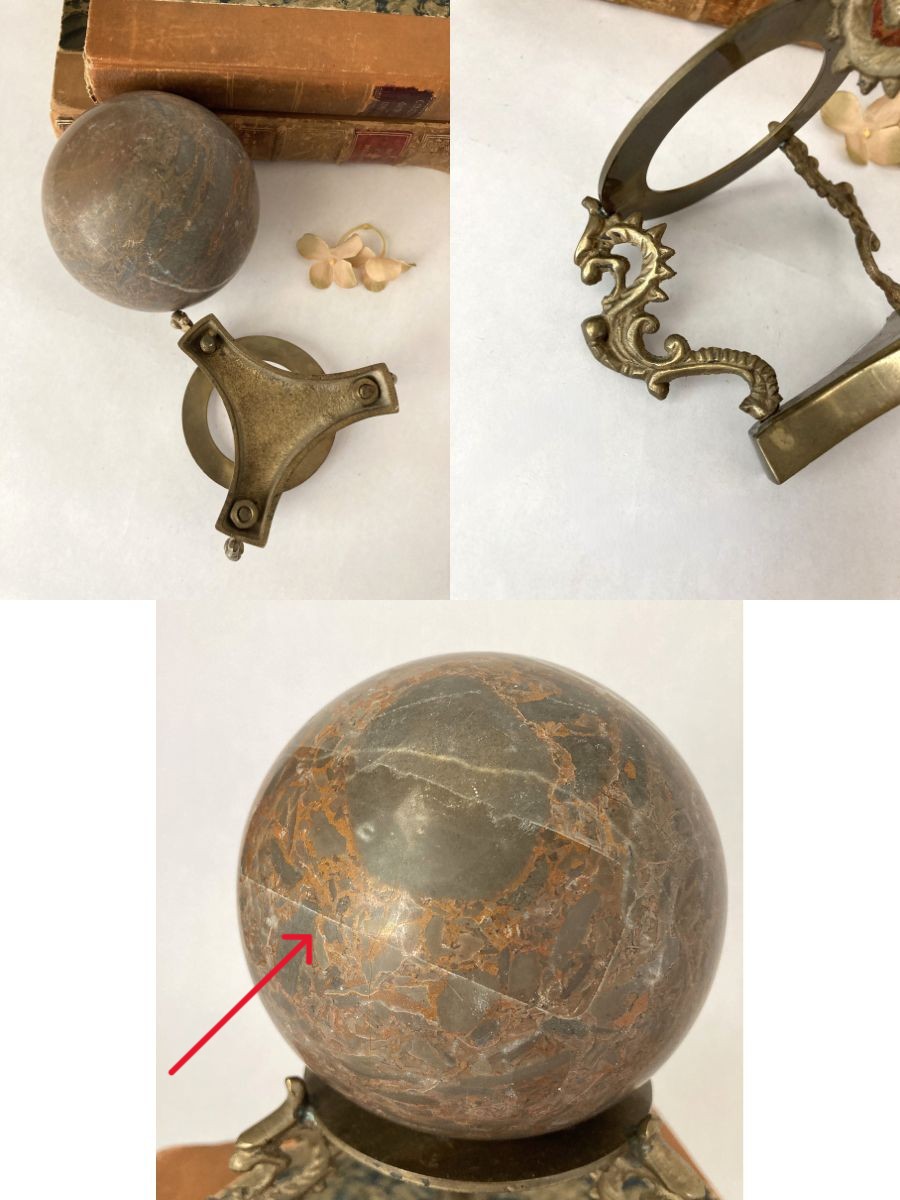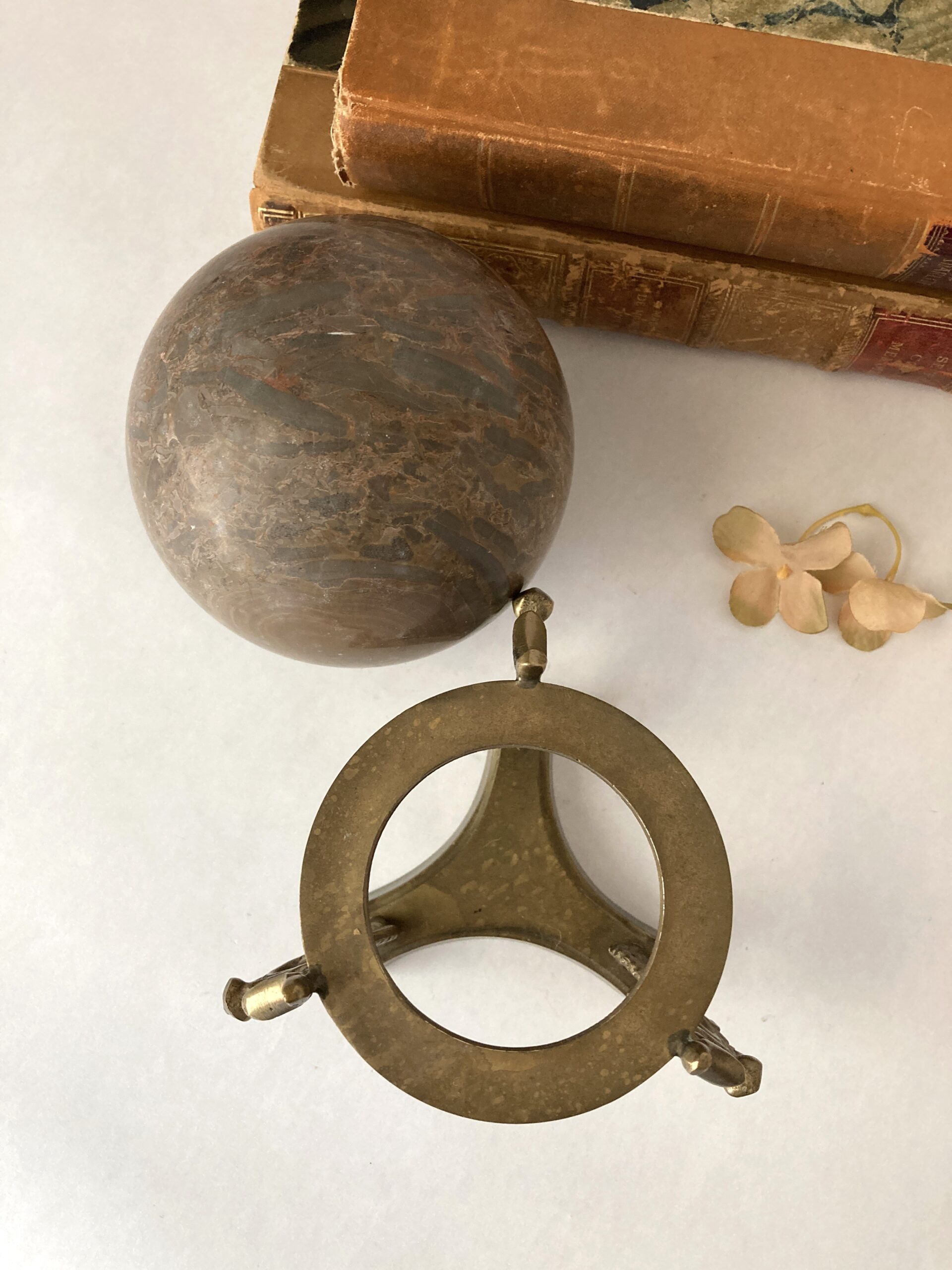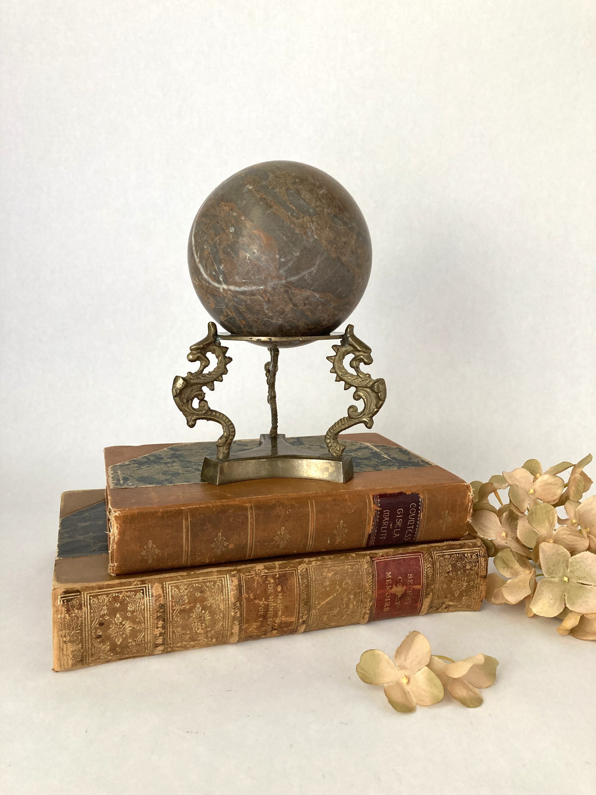 Vintage natural stone orb on brass mythical creature tripod stand. The orb has beautiful coloration: tans and greys with white veining. The orb measures about 4″ in diameter and on the stand approx. height is 6.75″. Very good preowned vintage condition. Note that the orb has a “shadow” from an old label–see last image. Weighs over 3 lbs. Great for shelf or coffee table styling. See below for measurements and condition.