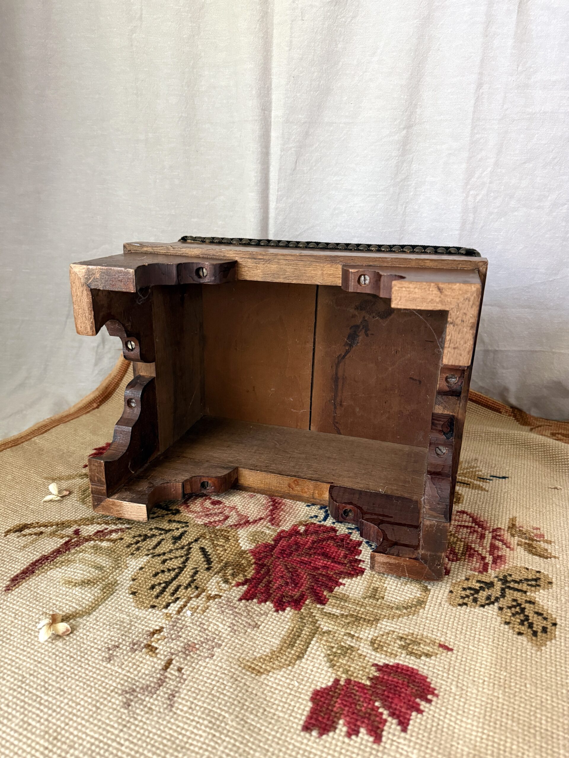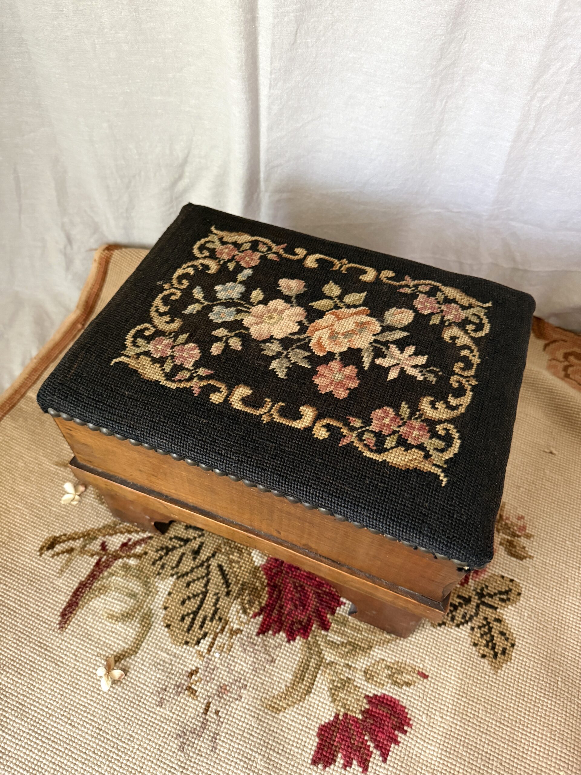 Lovely vintage footstool with needlepoint covering, floral motif on black background, with bracket feet. A medallion of C-scrolls and flowers encircle a central floral motif in muted colors: tan, green, blue, and rose. Needlepoint seat is secured with nail-head trim. It measures 9.25″ tall x 13.25″ wide x 10″ deep; the seat measures 13″ x 10. Very good preowned vintage condition, with a chip on the wood on one of the legs–see last image. Ready for its second act.