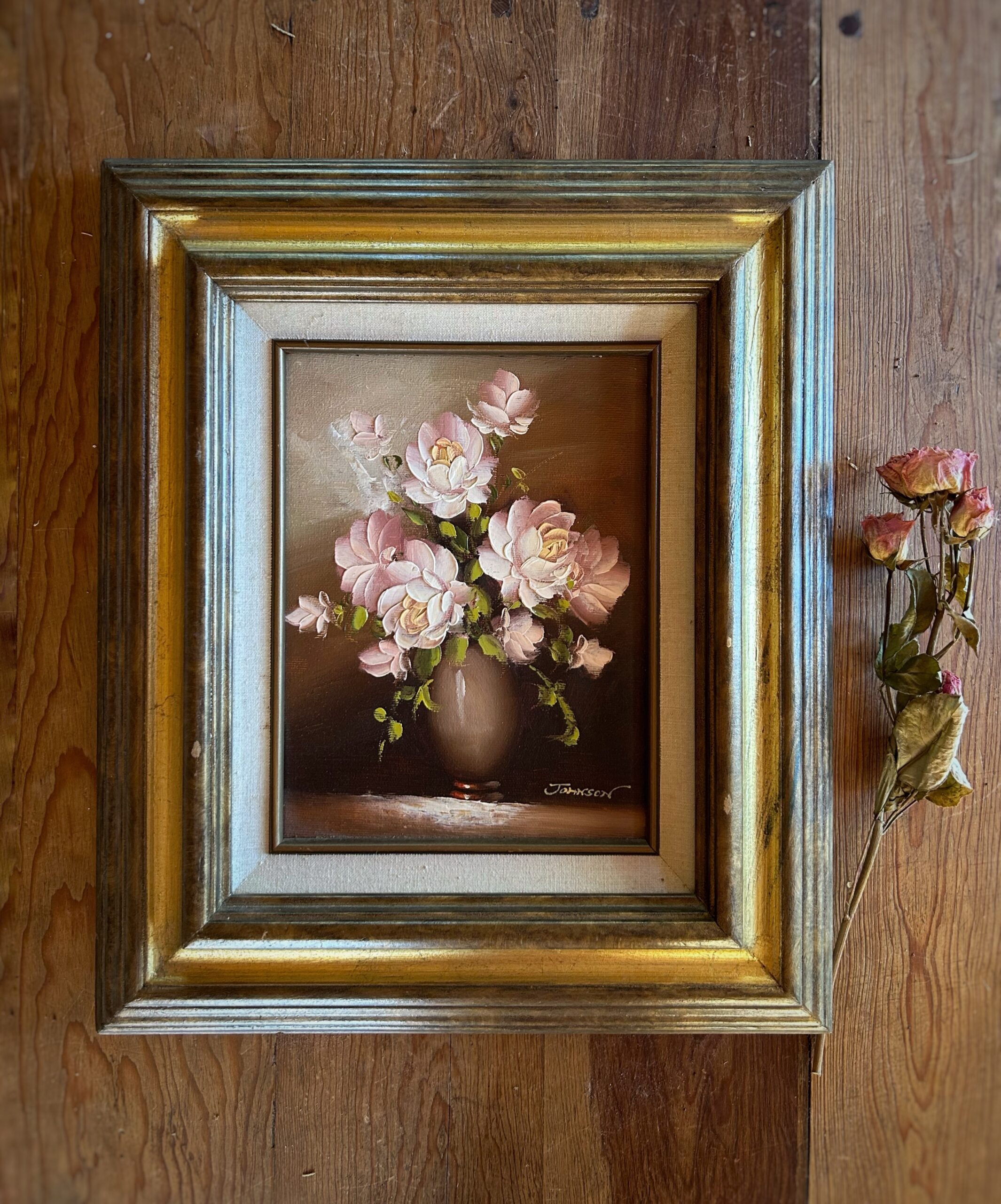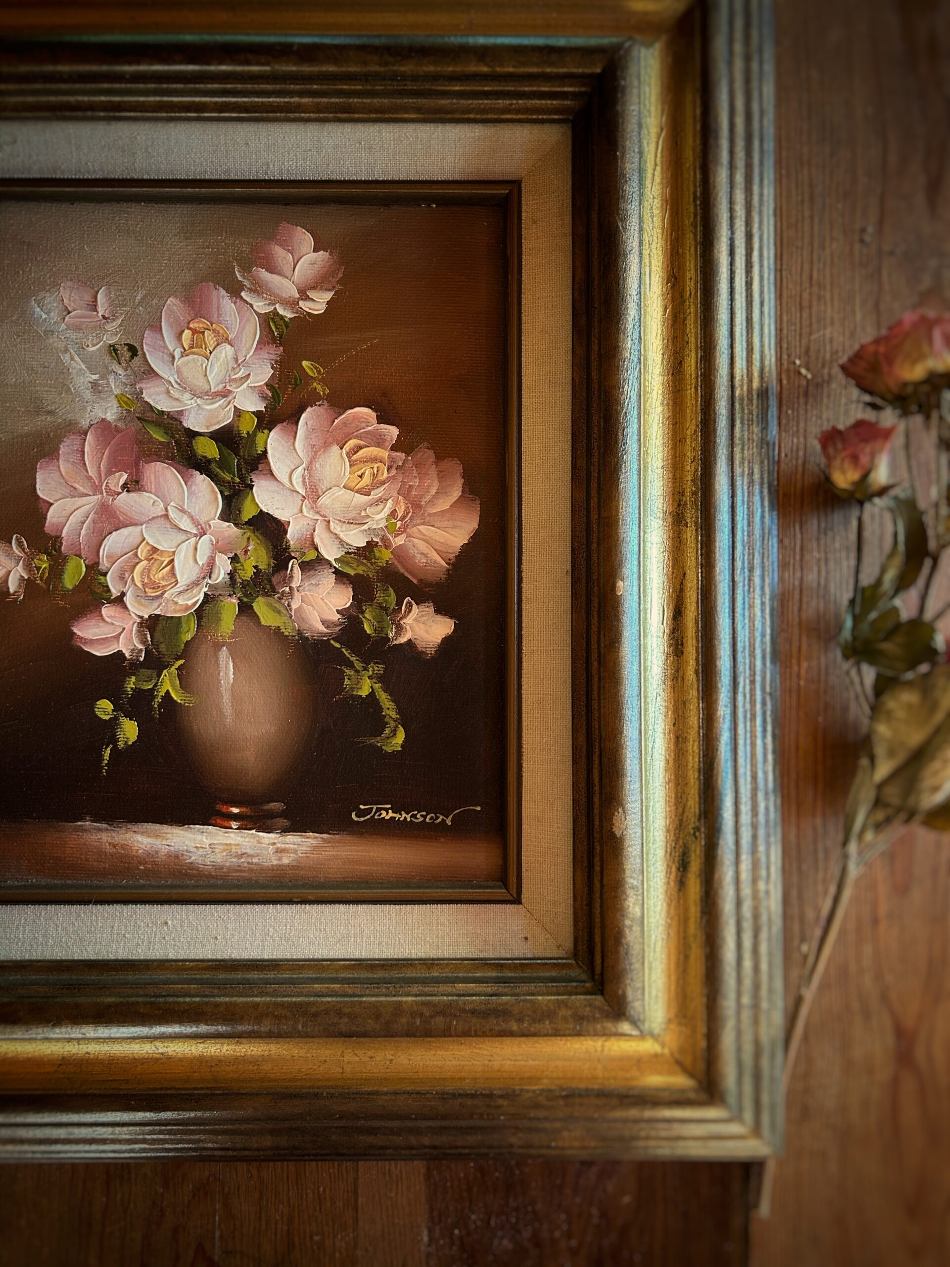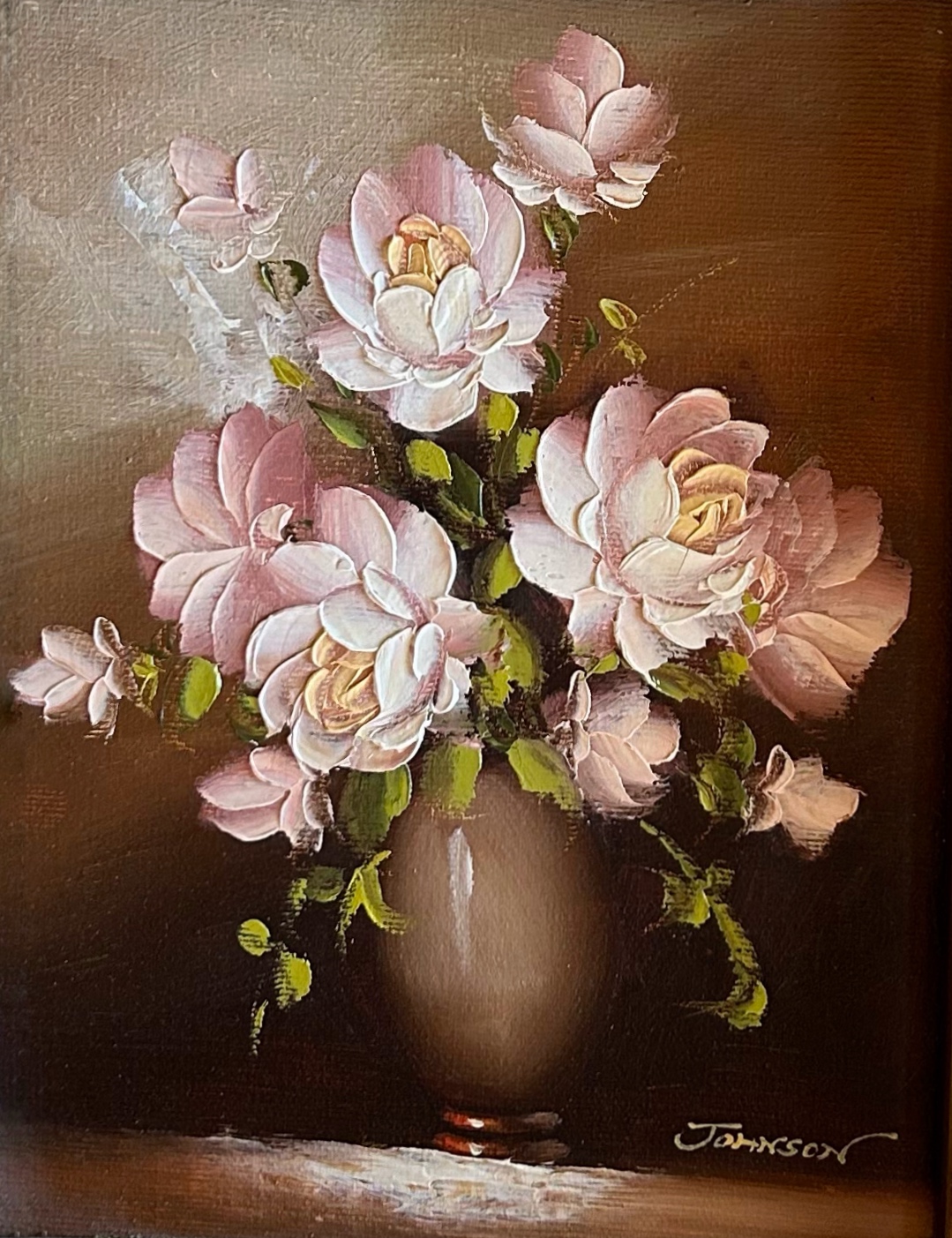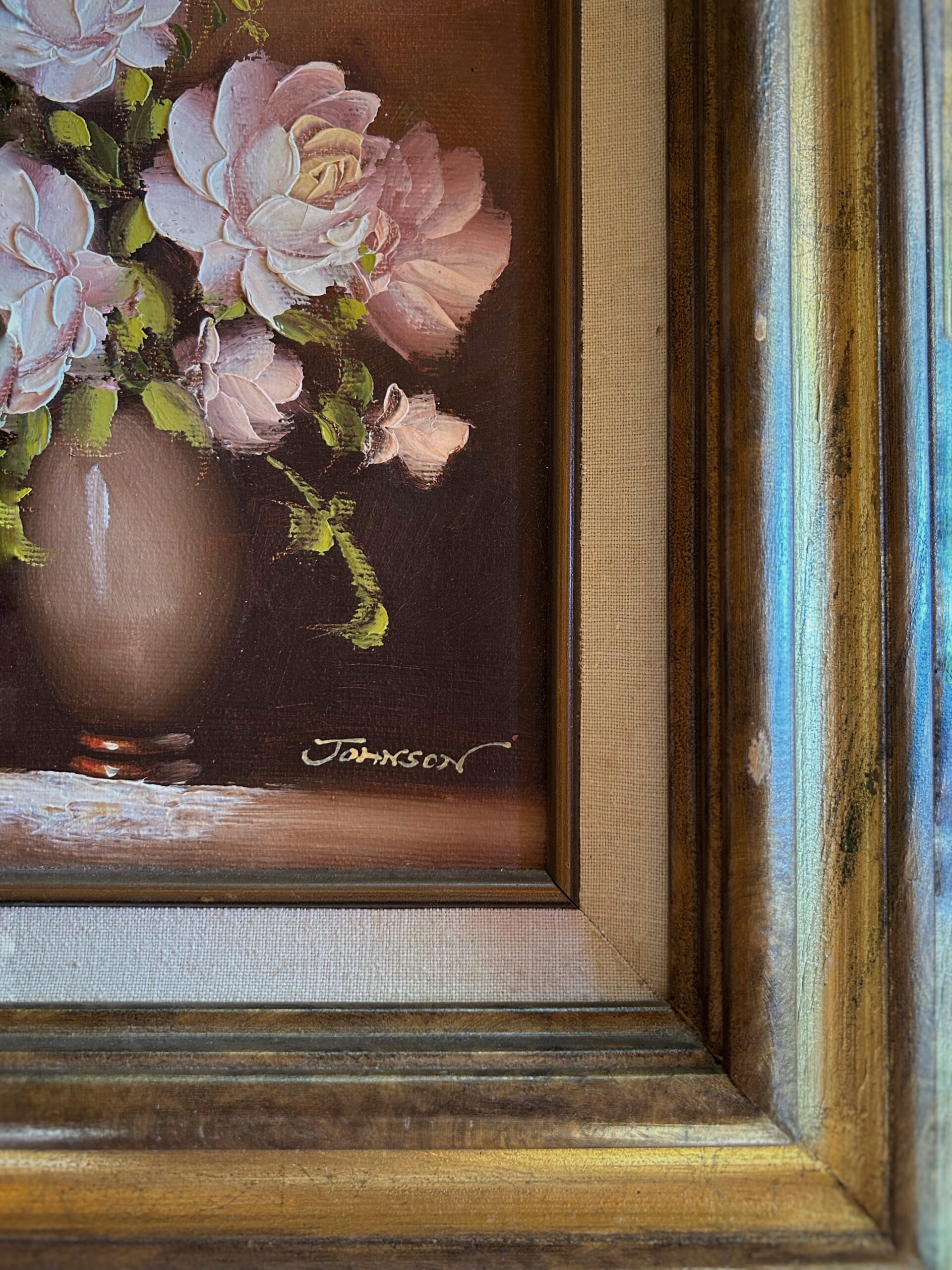 Mid-century signed oil painting by Johnson, featuring a lush bouquet. Rich, textured brushwork brings depth and movement to the canvas.